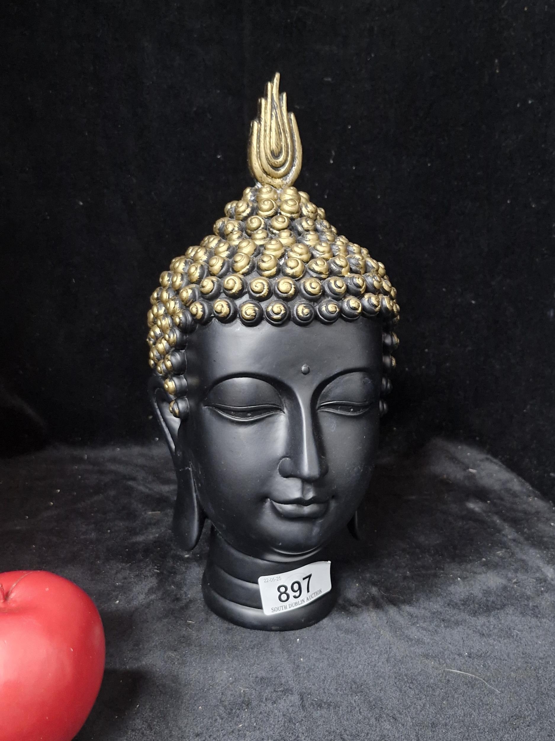 A Black and Gold designed Buddha head. Height - 27CM.