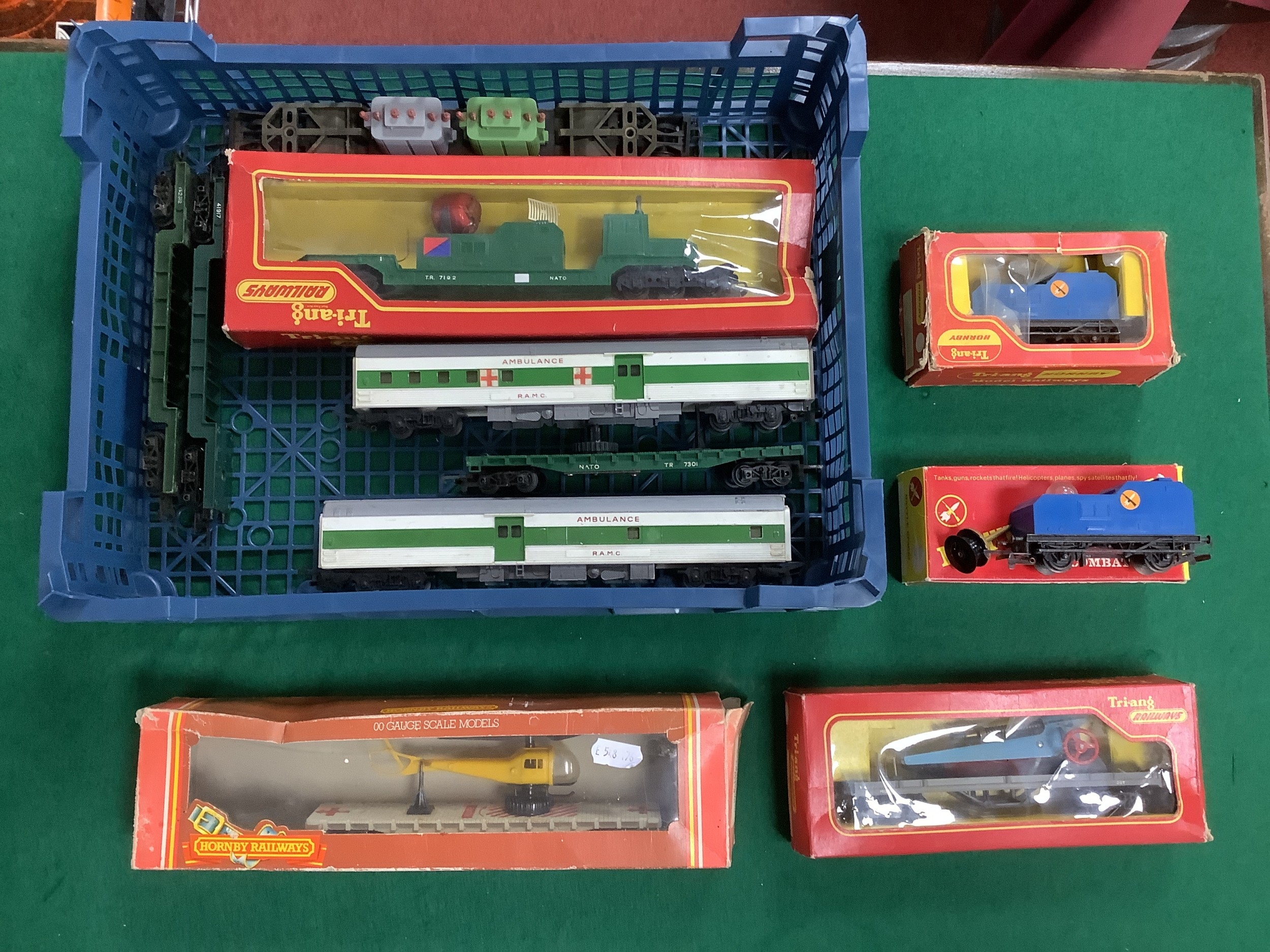 Eleven items of Triang 00 gauge "Battlespace" rolling stock, many boxed, and including rocket launcher, two R567 radar tracking cars, searchlight wagon, helicopter wagon and two Ambulance coaches, all playworn.