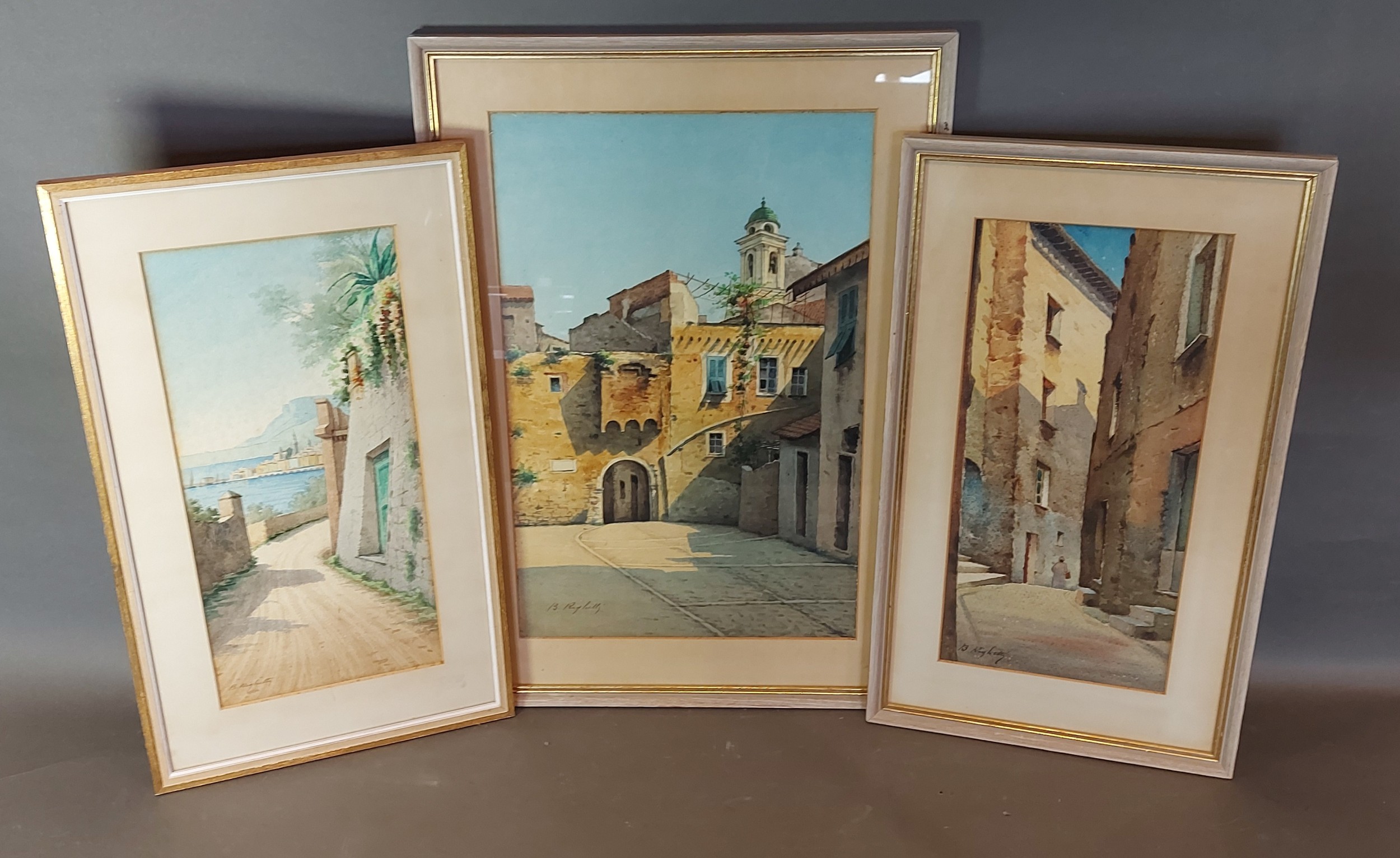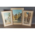 Bernard Antoine Righetti, Italian street and coastal scenes, a pair of watercolours, 35cms x 16cms together with another by the same artist, street scene, 41cms x 26cms, all signed