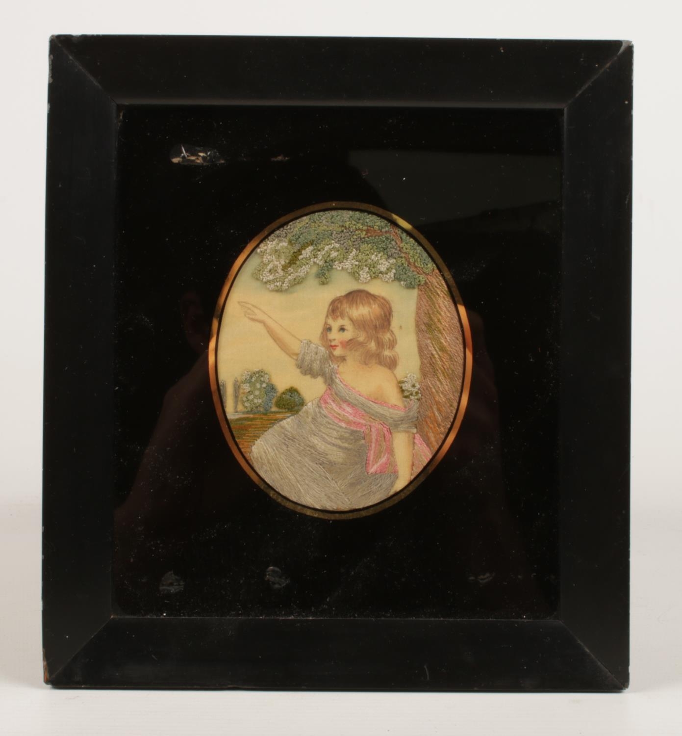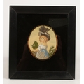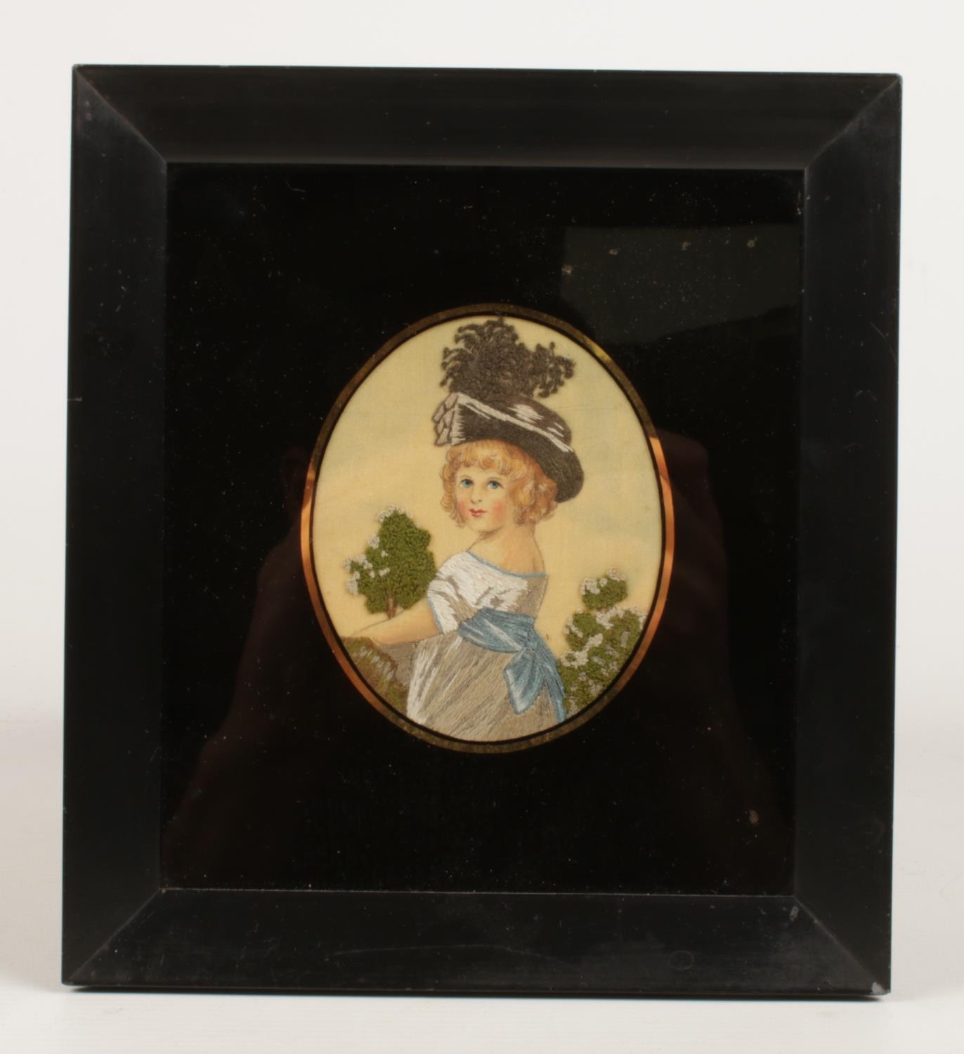 A pair of 19th Century ebony framed oval silk needlepoint embroidered oval portraits of young children overall size 19.5cm x 17.5cm