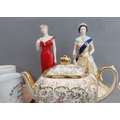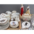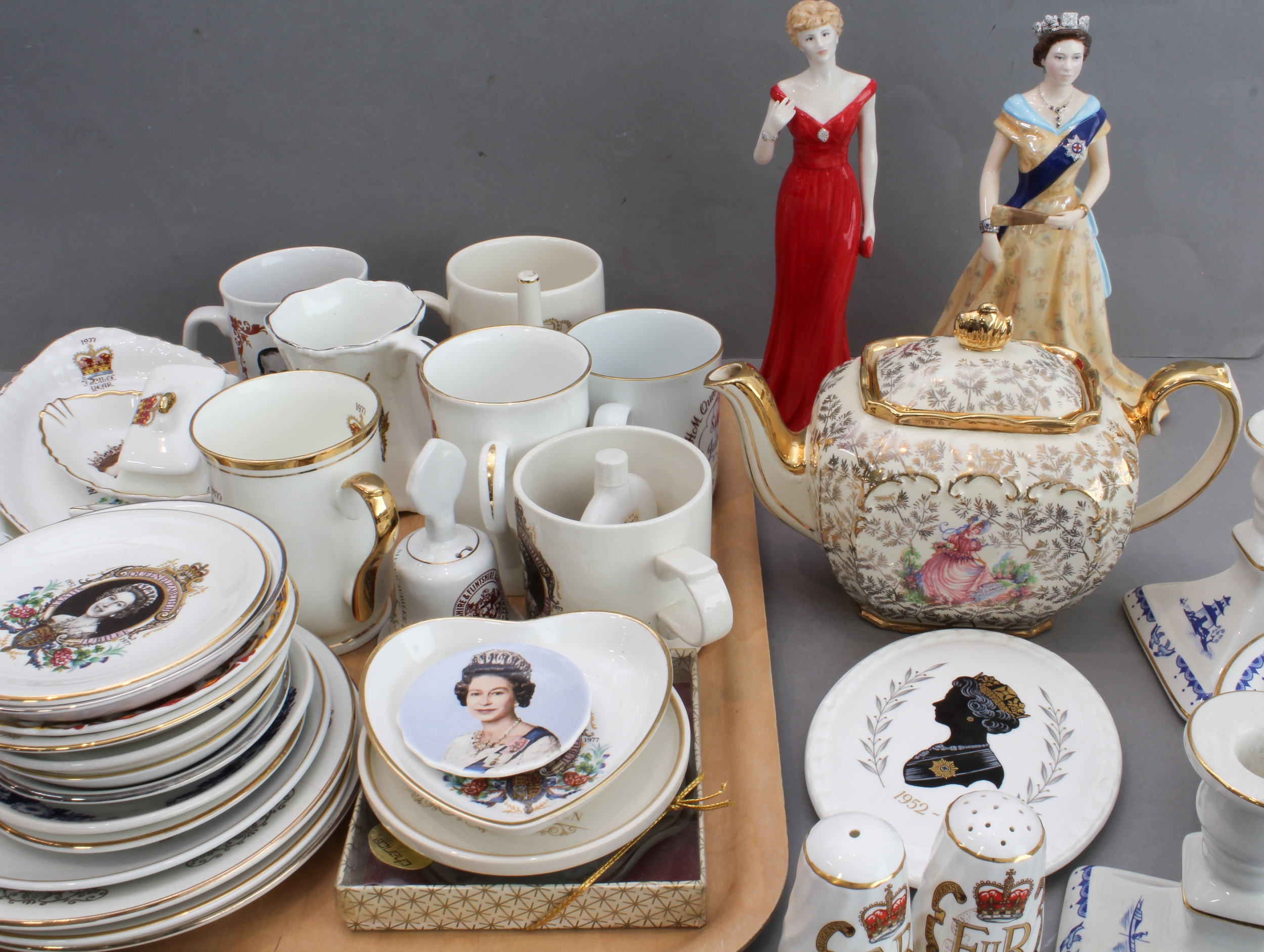 A selection of Royal commemorative ceramics to include plates, cups, tankards, trinket trays, salt and pepper, a Royal Worcester limited edition figure of HM Elizabeth II (2012 Diamond Jubilee) and a Royal Worcester figure of HRH Diana Princess of Wales. (Two trays)
