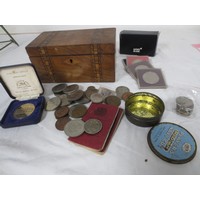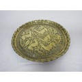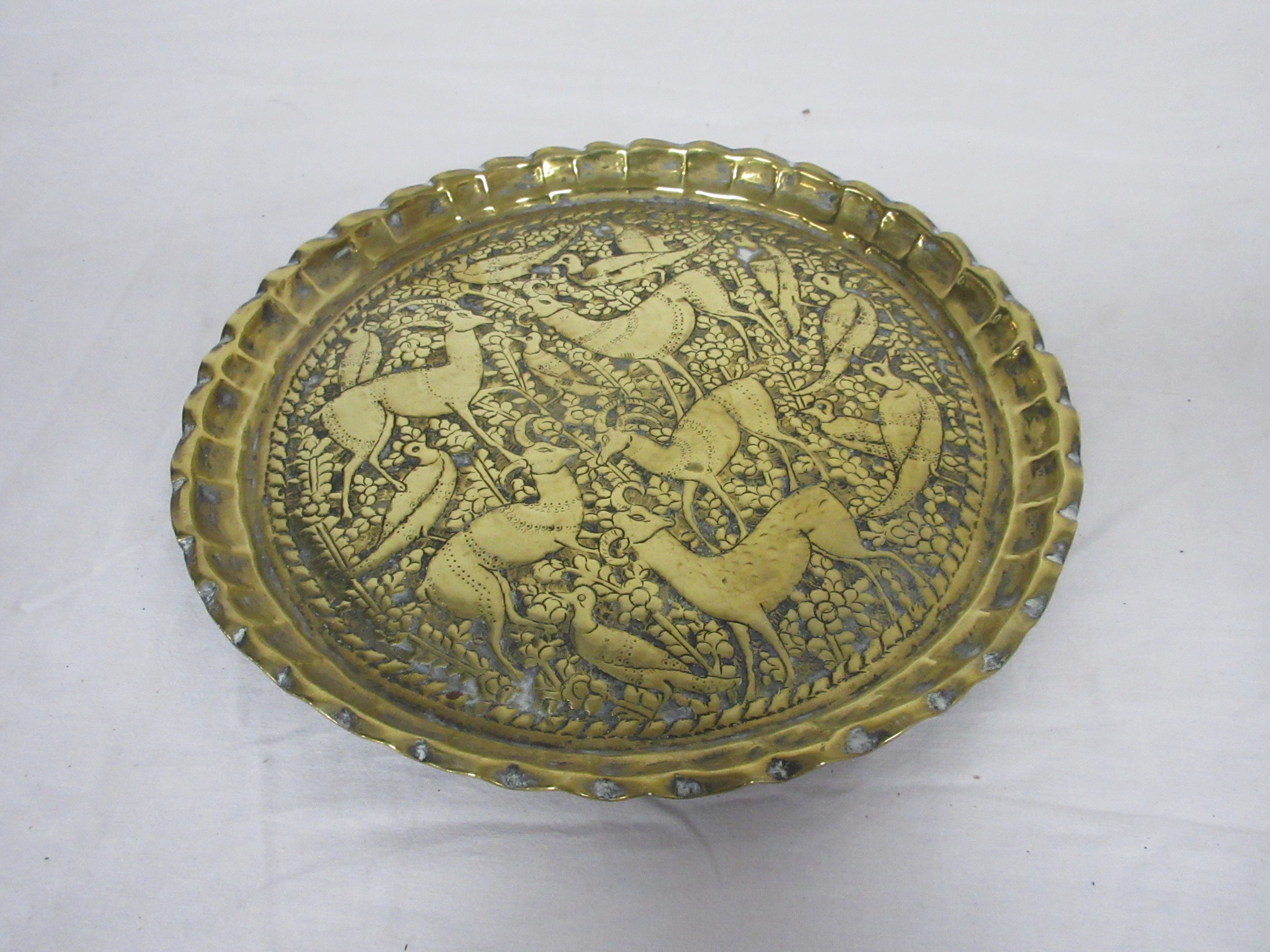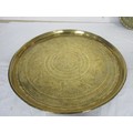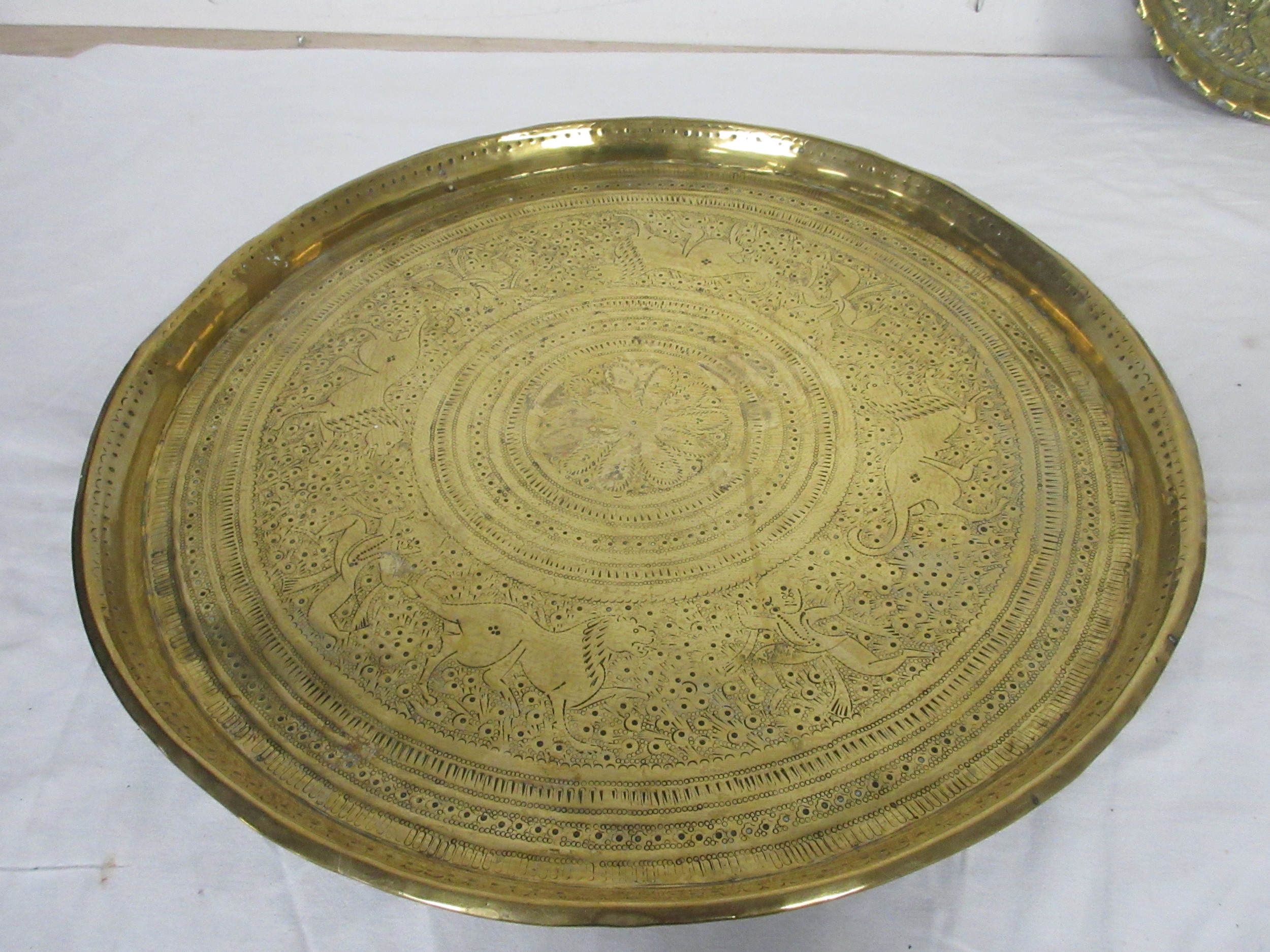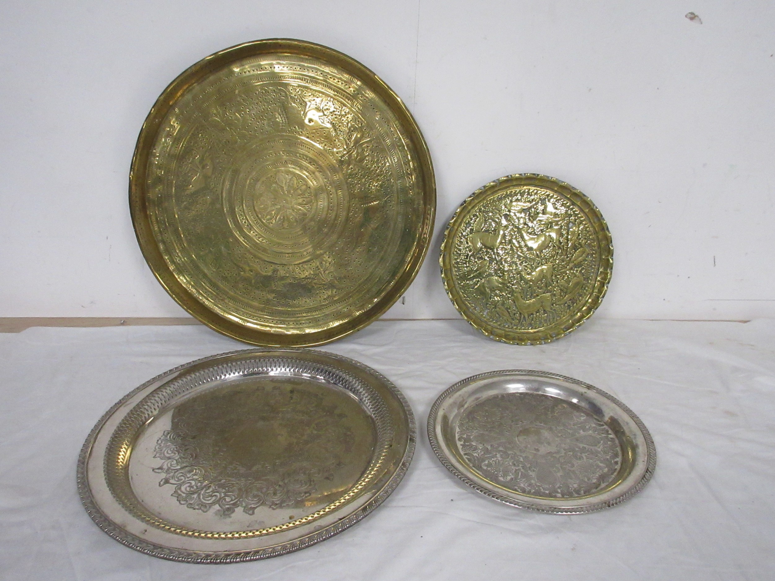 An eastern circular brass tray engraved with lions and figures (diameter 43cm), a brass tray embossed and engraved with deer and birds (25cm), and two decorative metal serving trays, one with presentation engraving