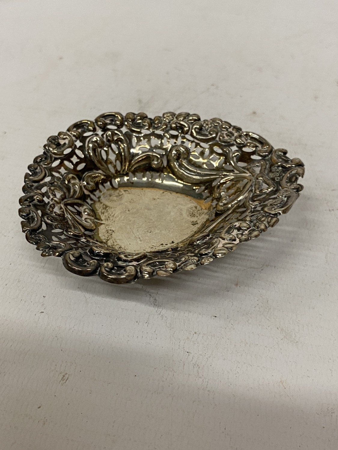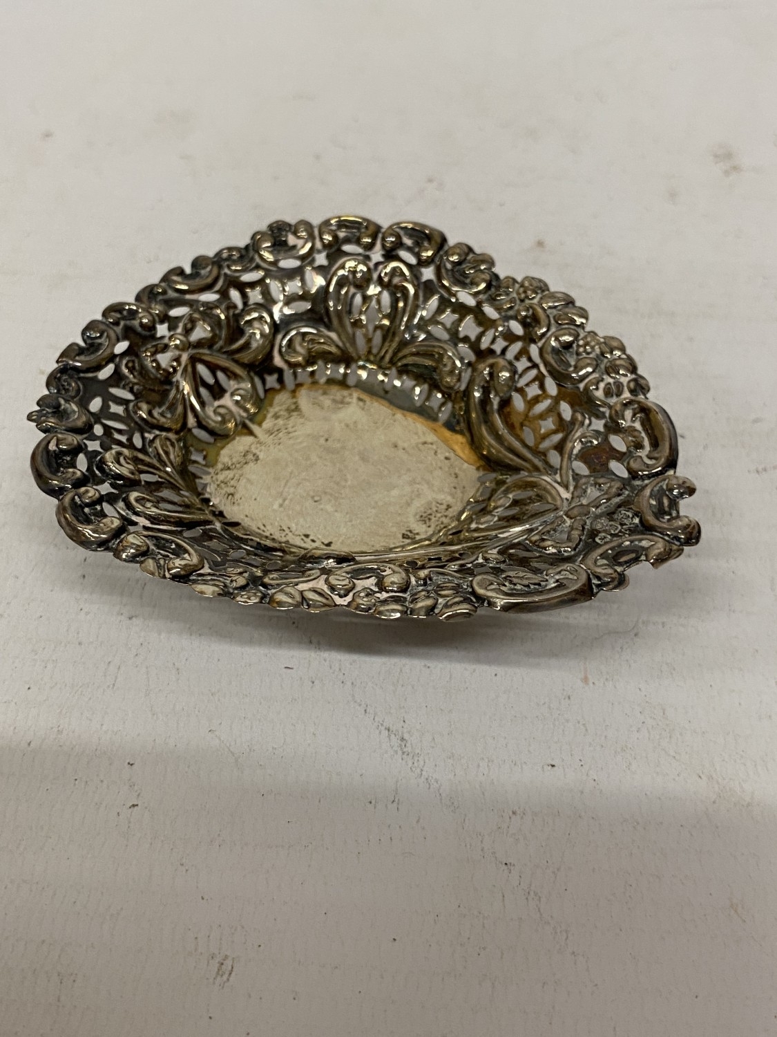 A HALLMARKED BIRMINGHAM SILVER FOOTED BON BON DISH WITH FILIGREE PATTERN, WEIGHT 15.3g