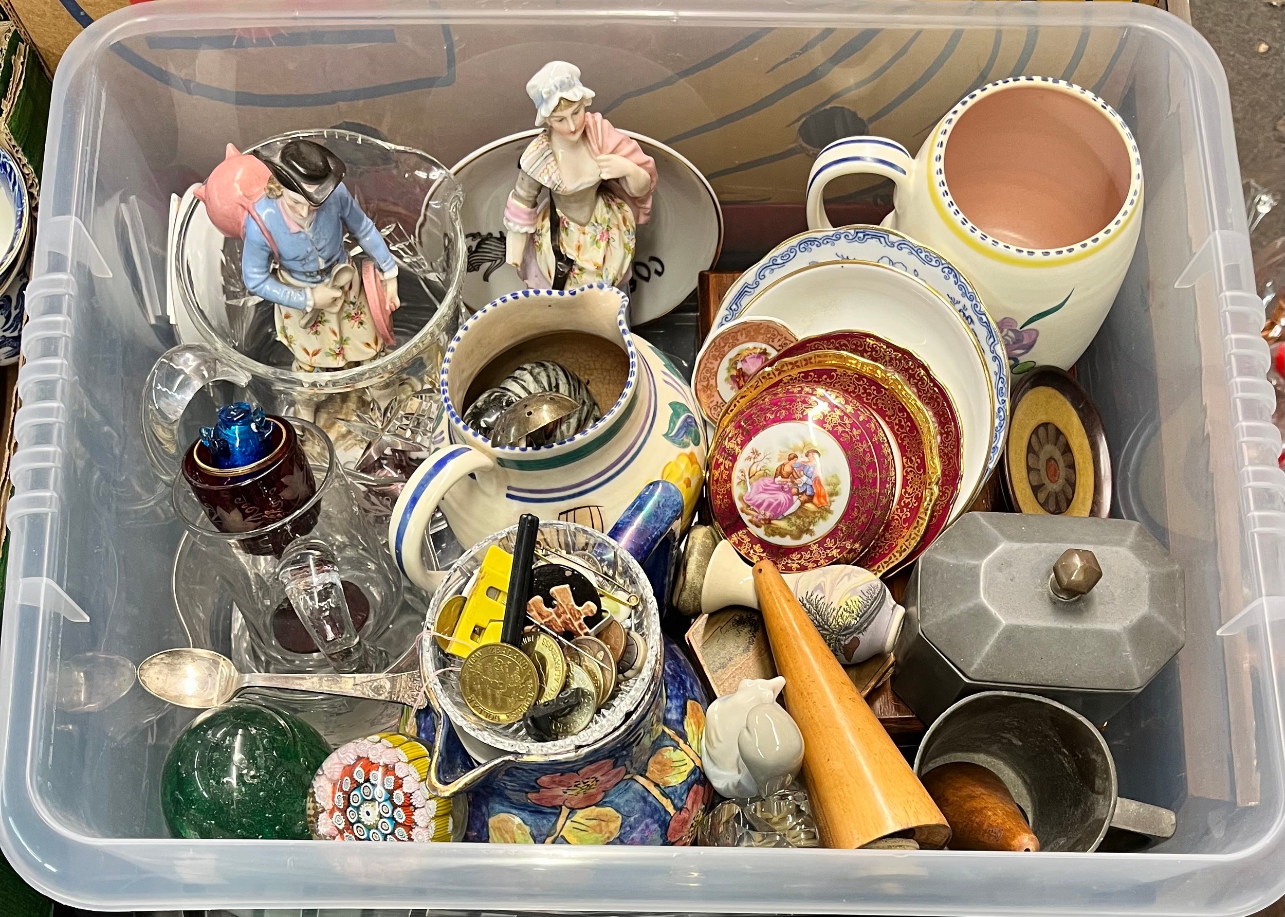 BOX INCLUDING VICTORIAN PAPER WEIGHT, POOLE JUGS, CUT GLASSWARE