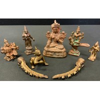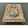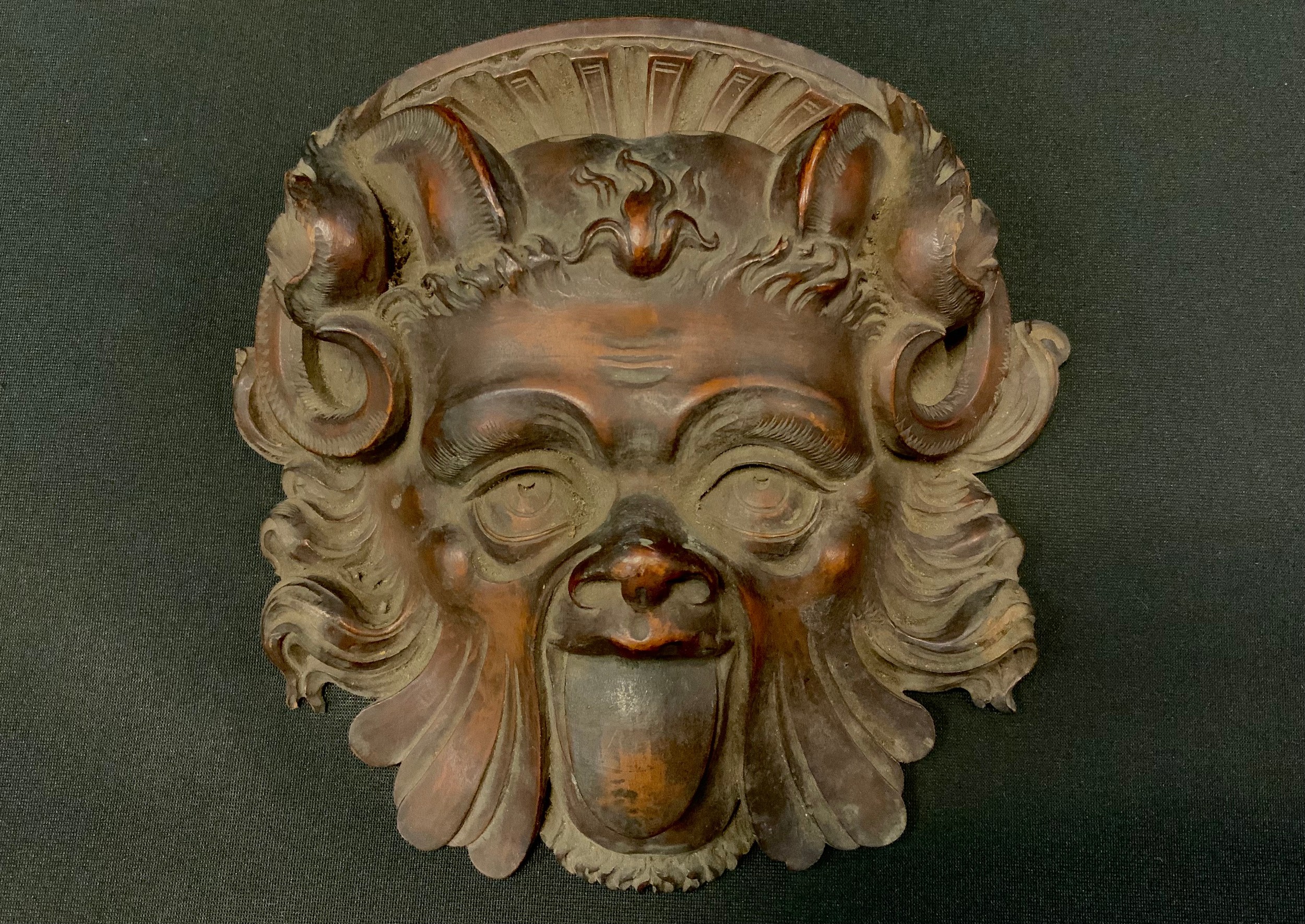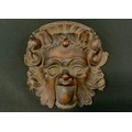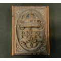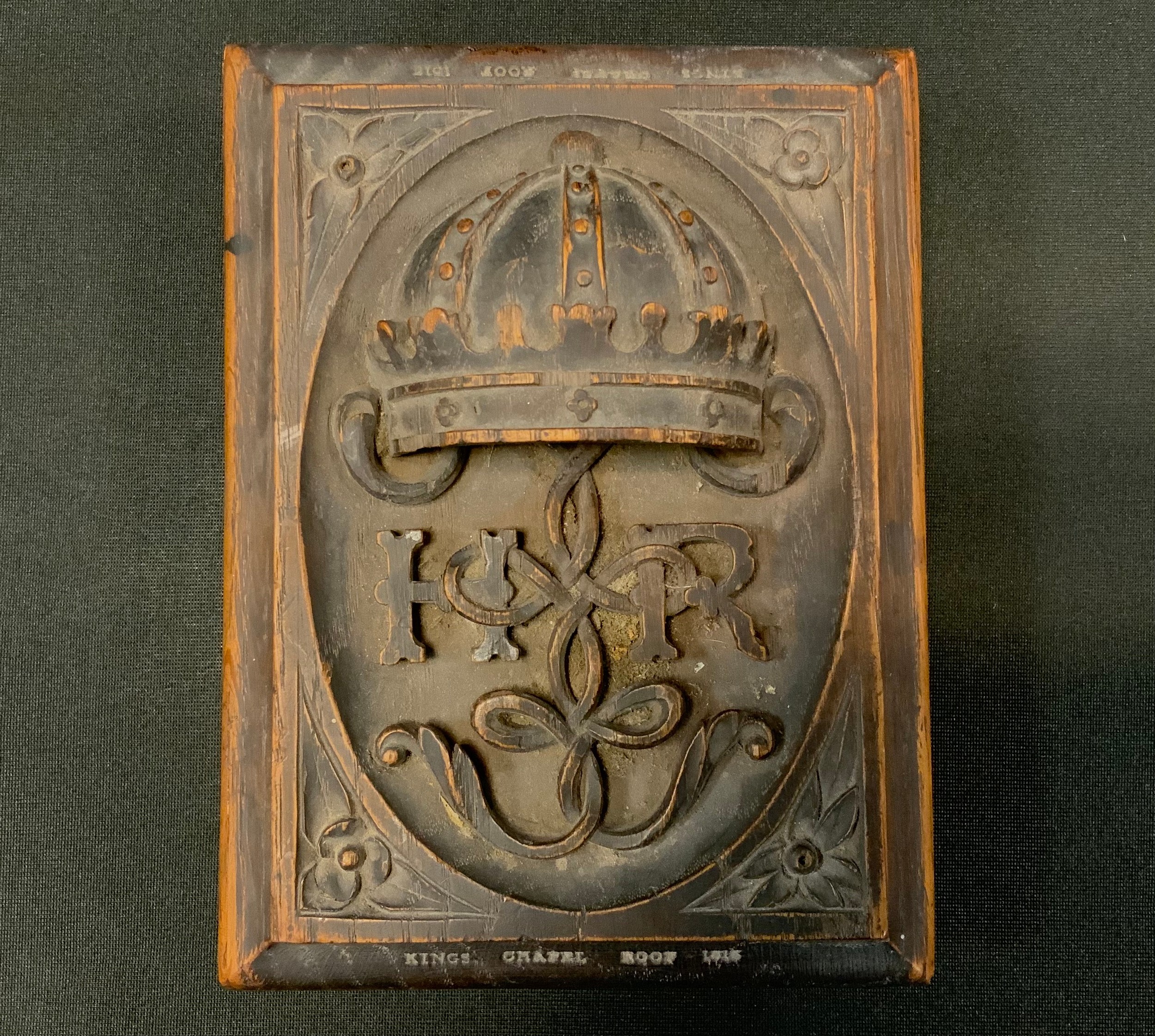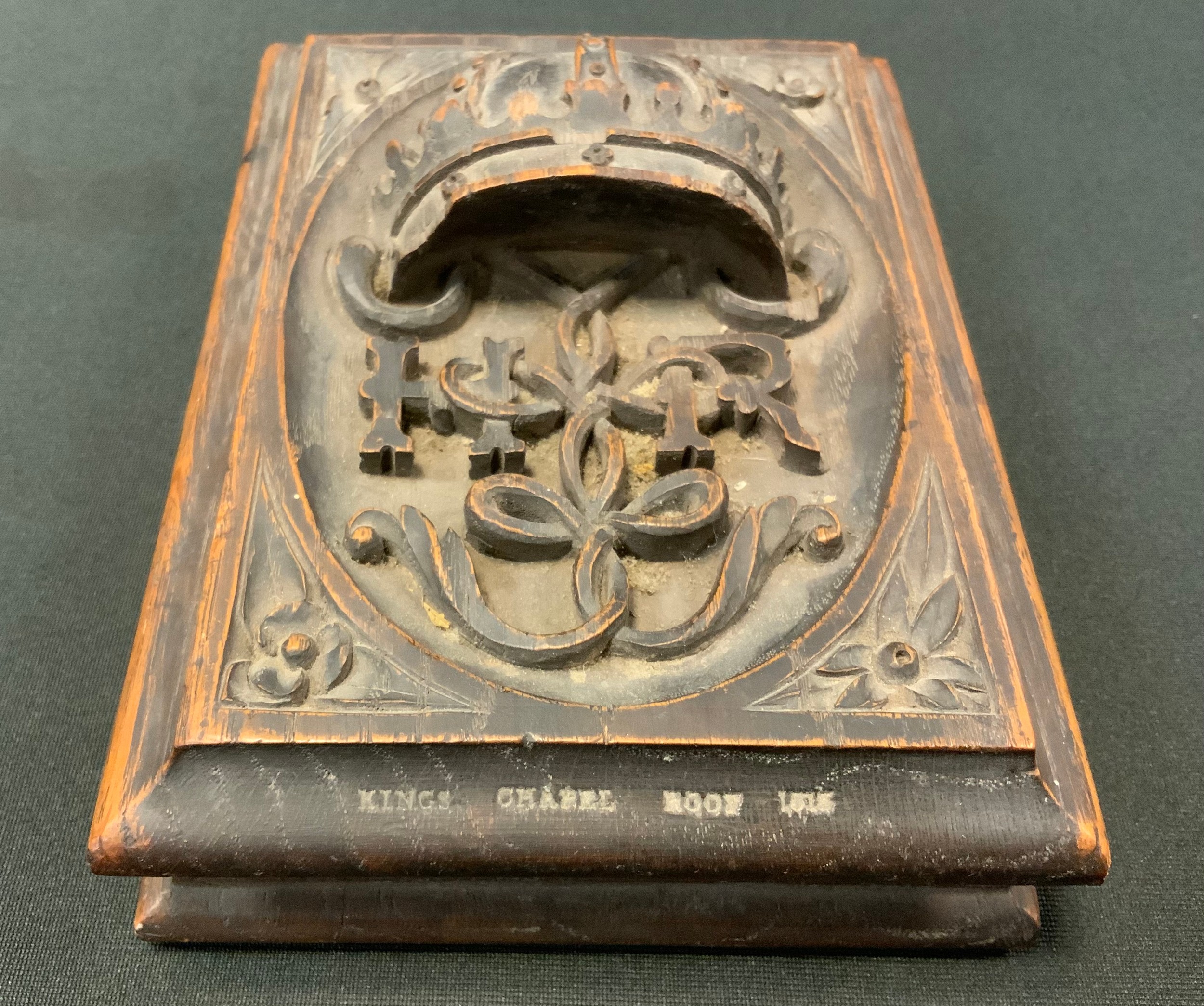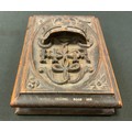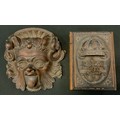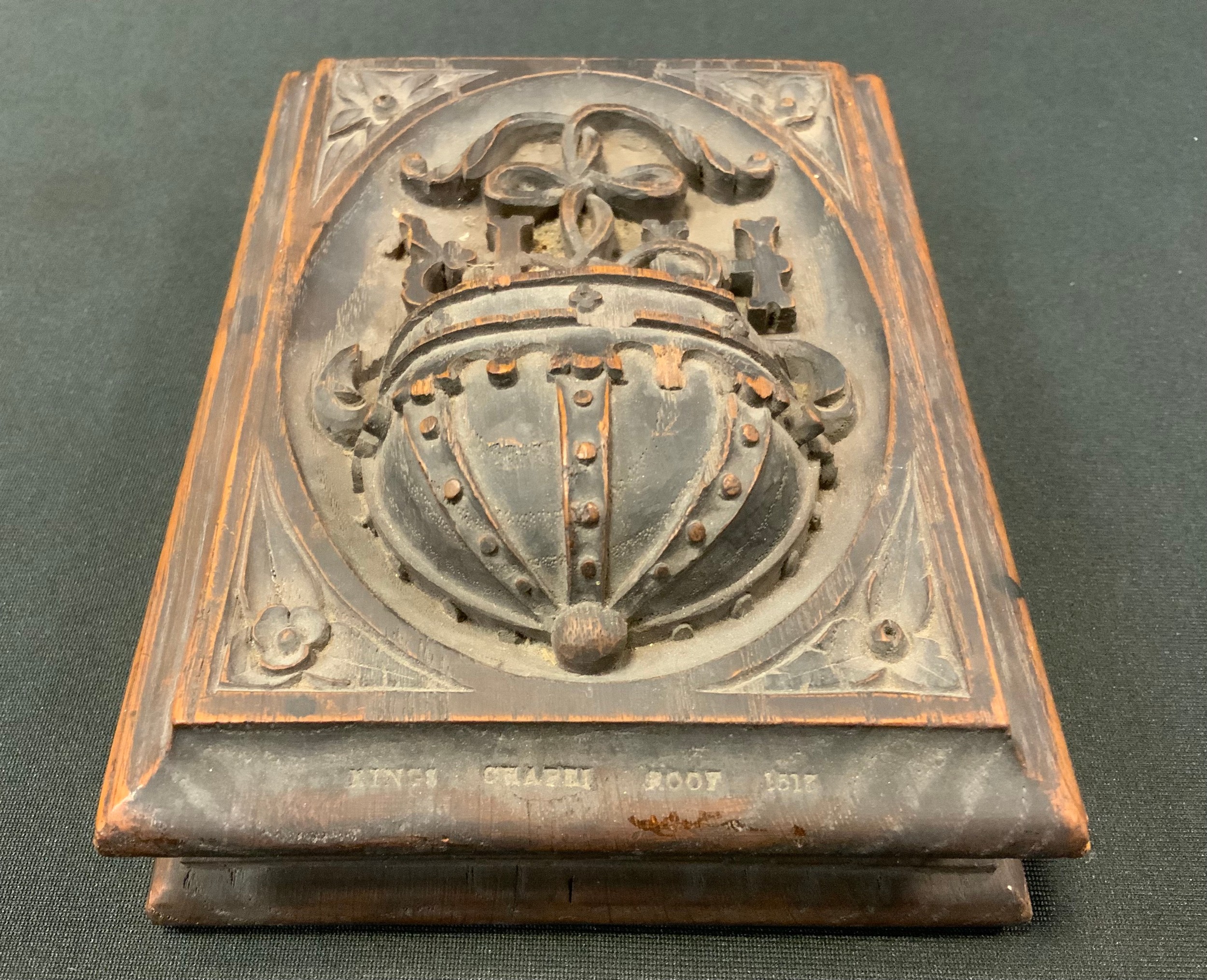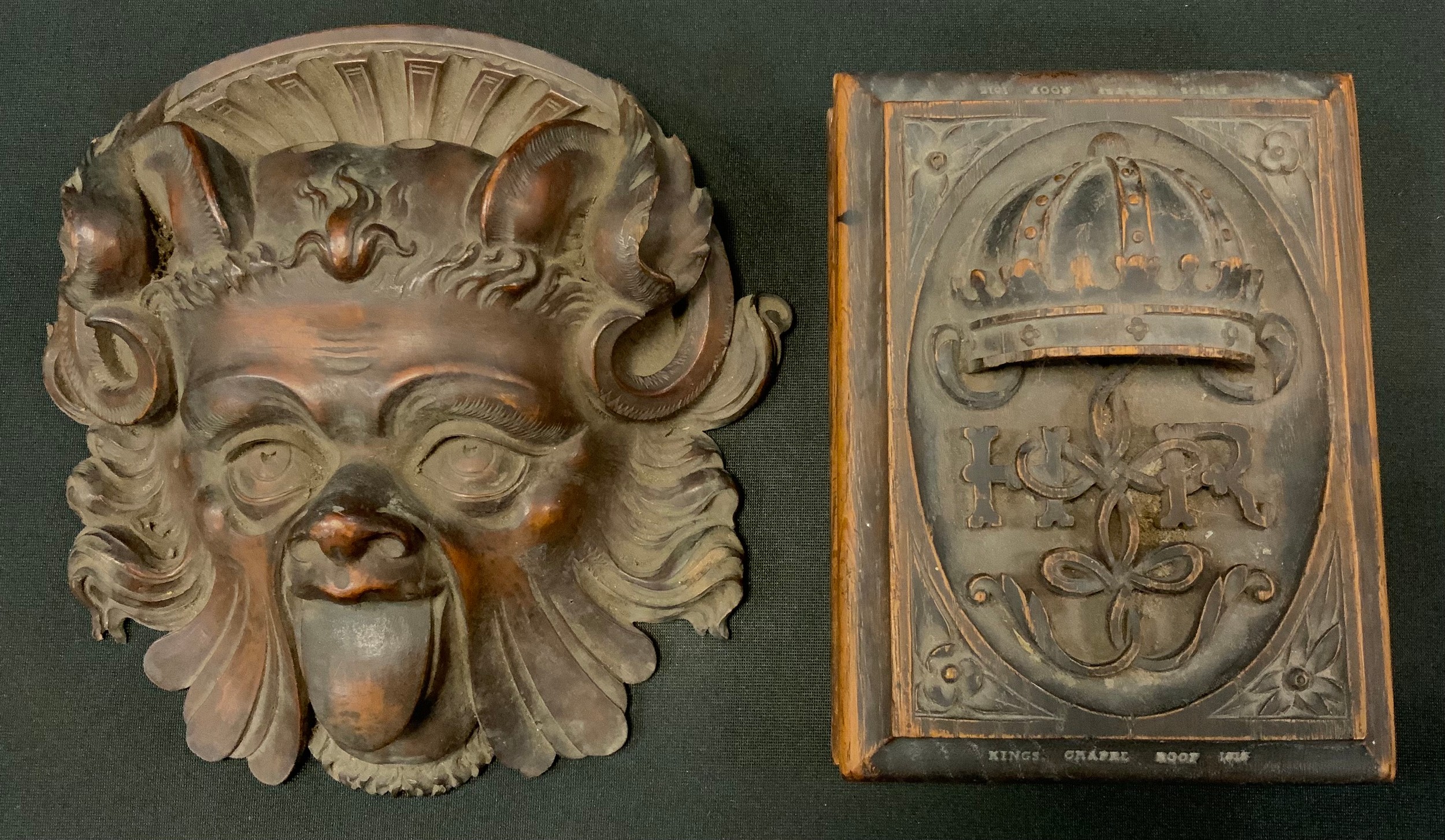 A 19th century carved Gothic wall mask, grotesque horned face, tongue out, 16.5cm x 16.5cm; a Kings Chapel, Cambridge, carved wood roof block, Crowned H R carved crest, stamped with date 1515, approx 14cm x 11cm, (2).