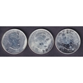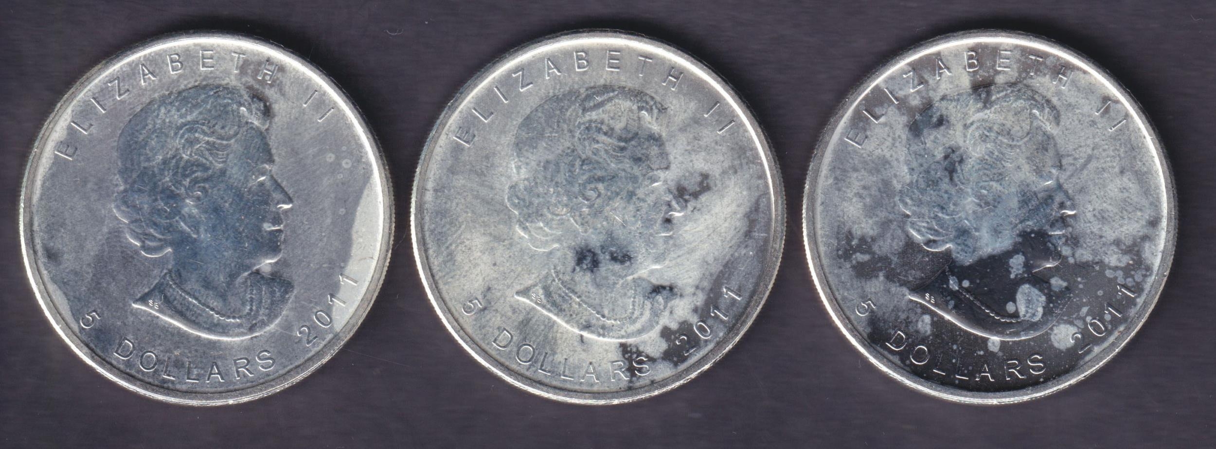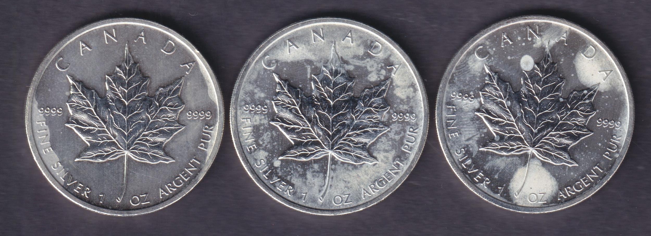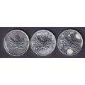 A group of three Canada 2011 Brilliant Uncirculated Silver Maple Leaf $1 coins, each 1oz, struck in .9999 fine Silver.
