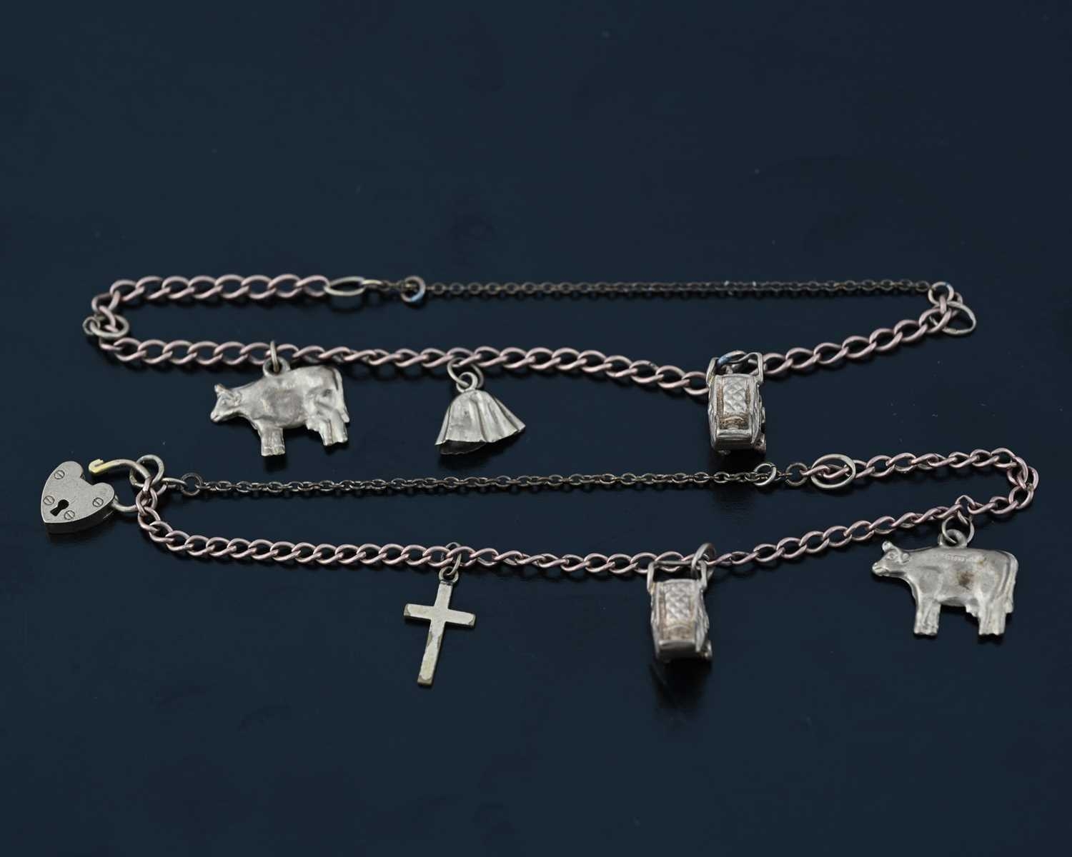 Two 9ct gold curb-link charm bracelets, each suspending three charms, one with a heart padlock clasp, both with hallmarks, both with safety chains, lengths 14cm, total weight 9.7g