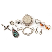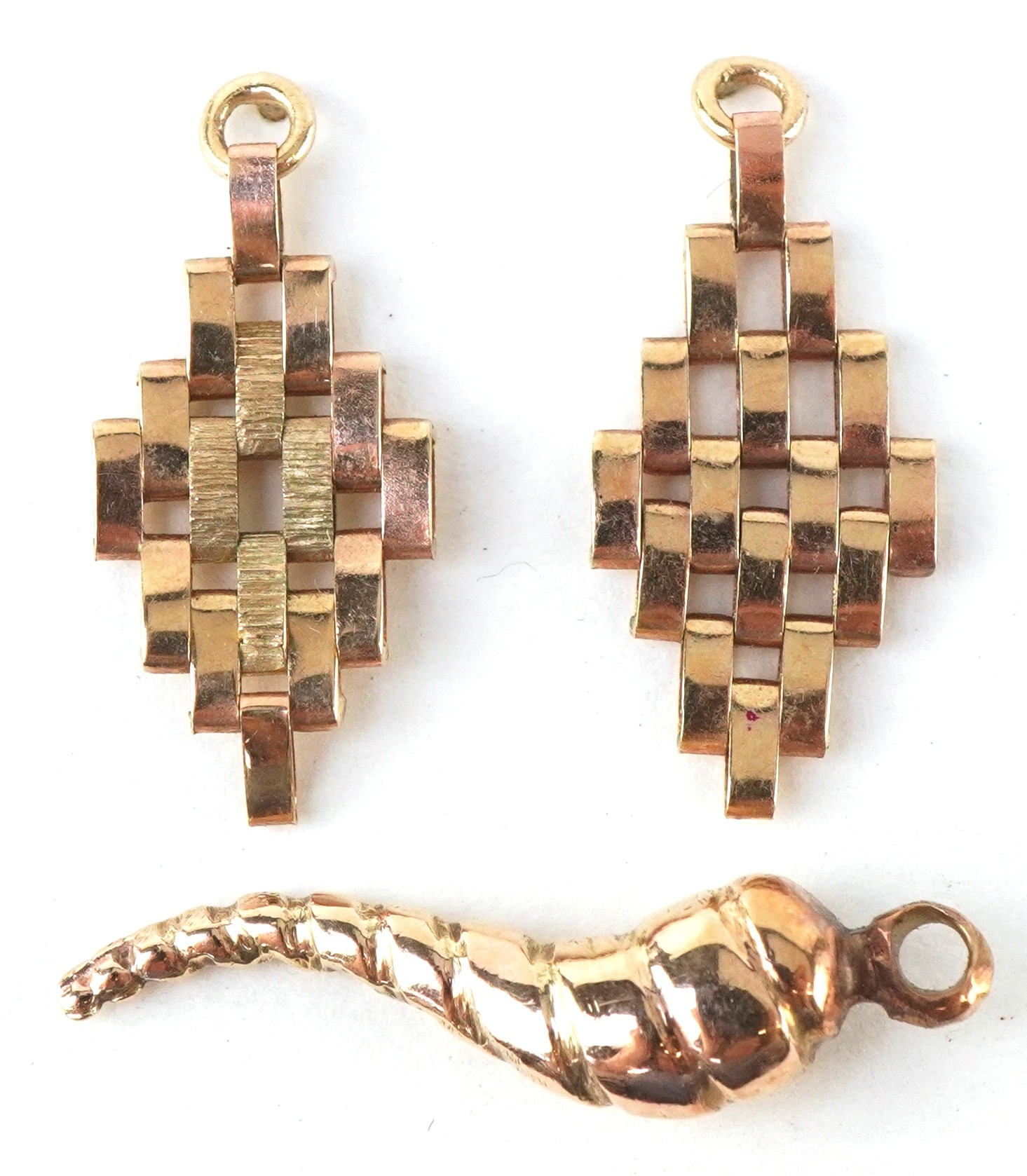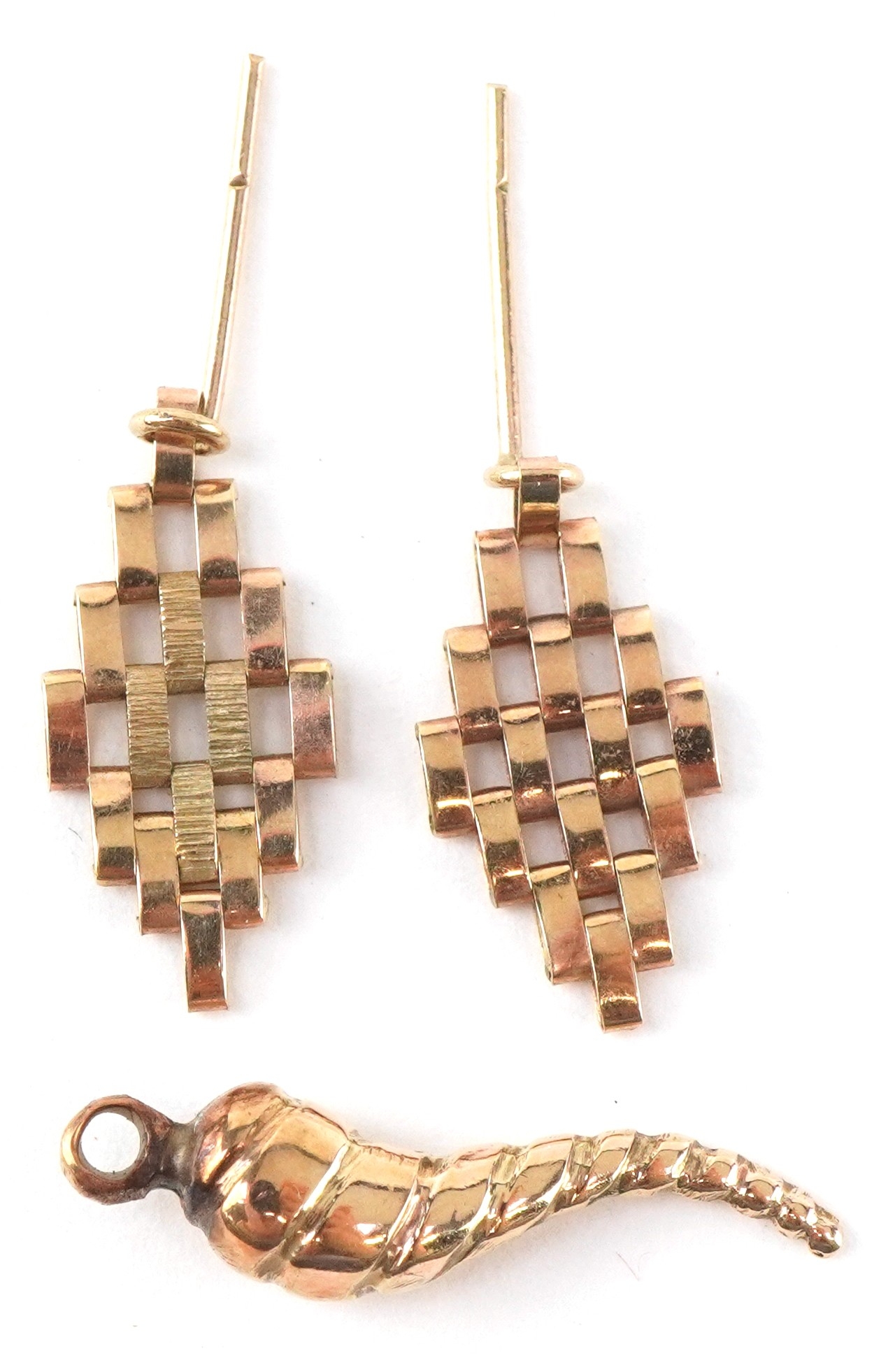 Unmarked gold jewellery comprising a Cornicello charm and a pair of drop earrings, the largest 2.0cm high, total 1.8g.