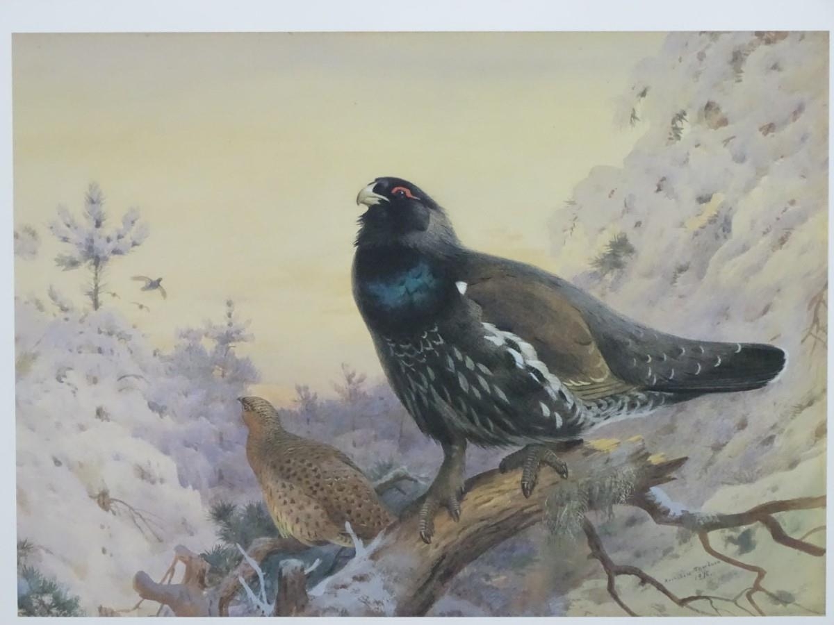 After Archibald Thorburn (1860-1935), Limited edition coloured print 65/850, 'Winter in the Glen', a brace of capercaillie game birds, Published by The Thorburn Museum and Gallery...1989, Aperture 18 7/8 x 24 1/4''