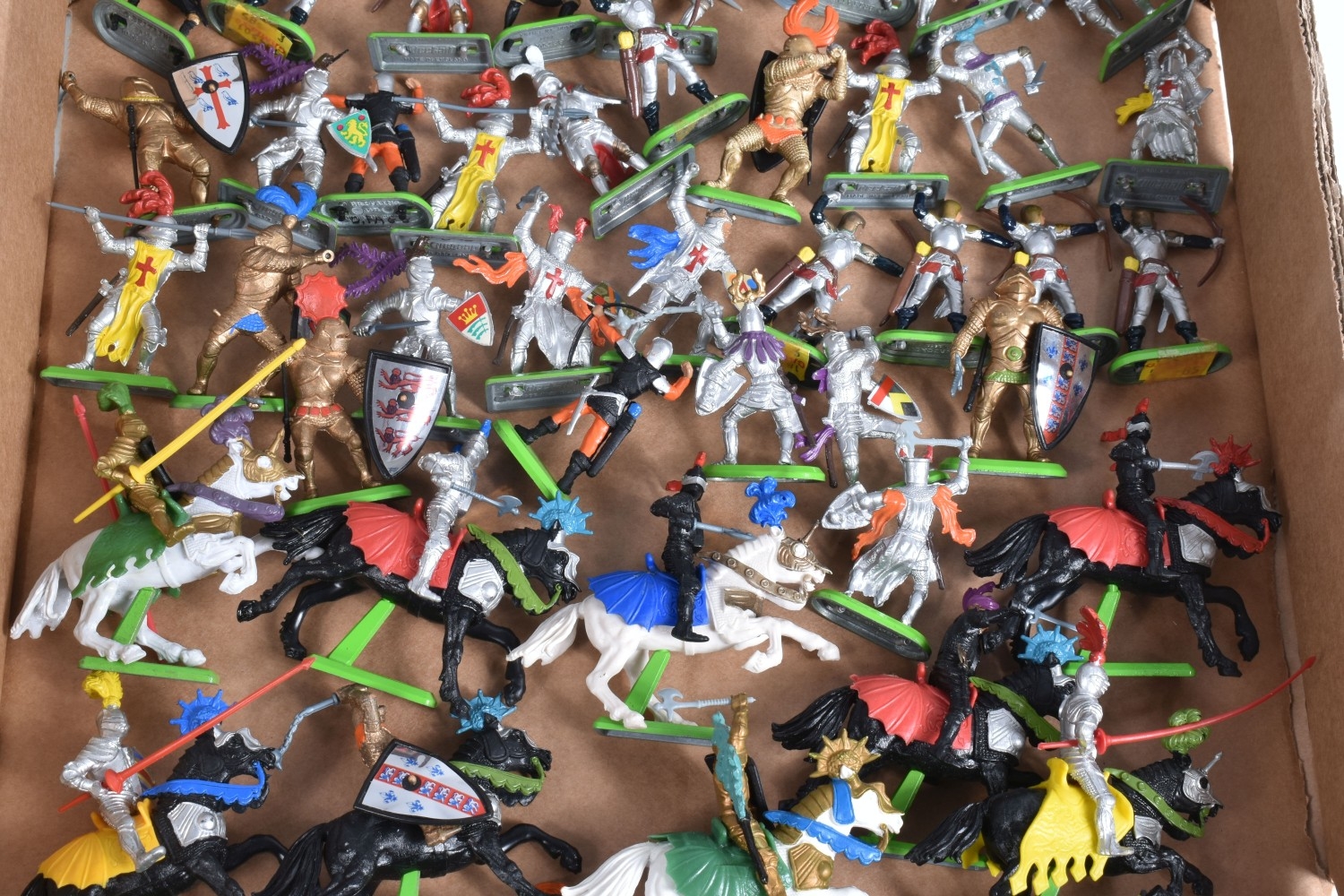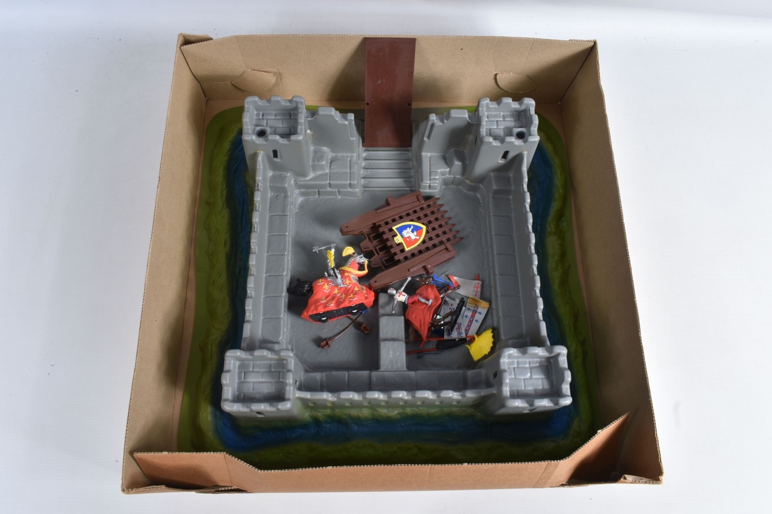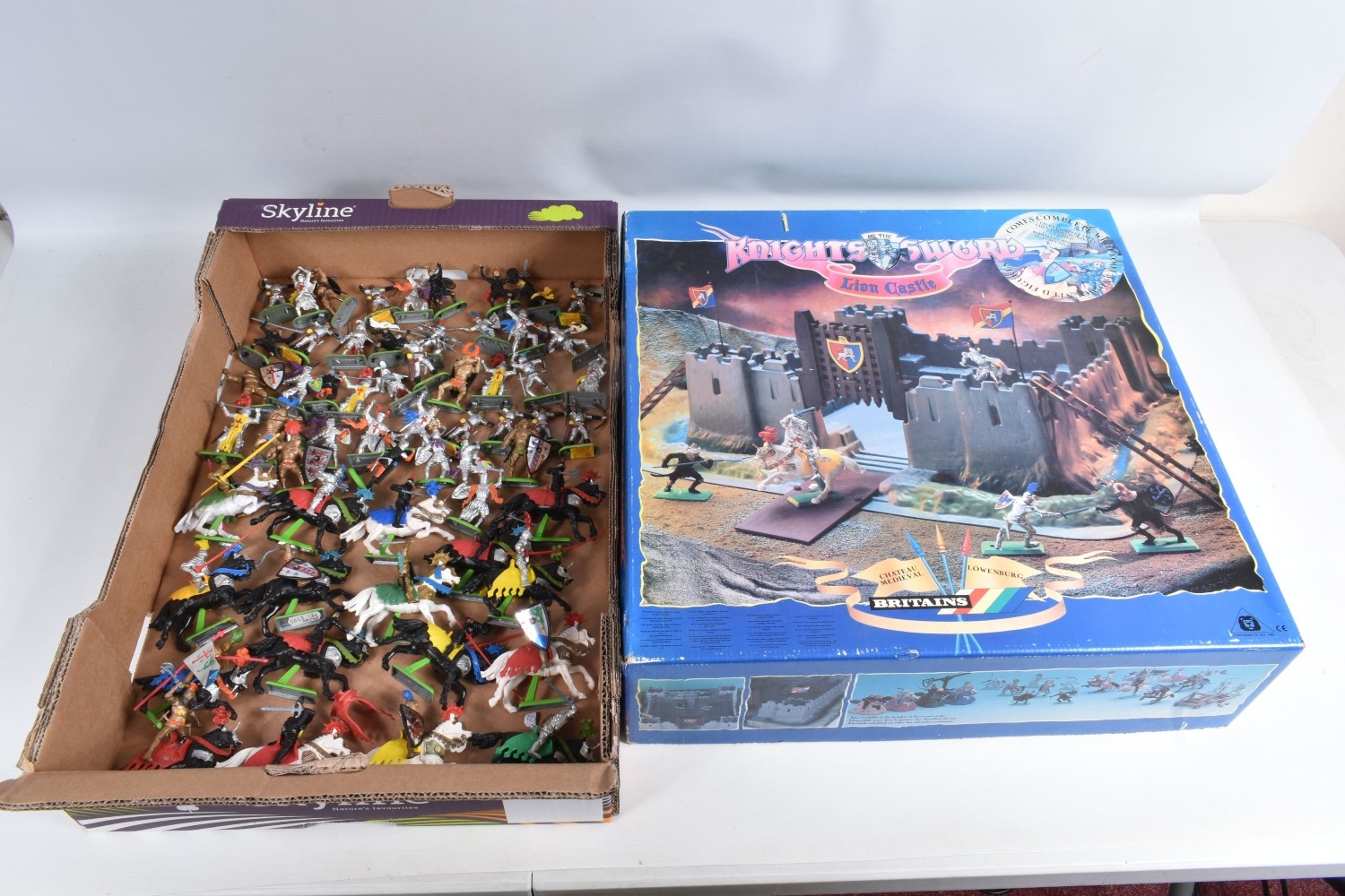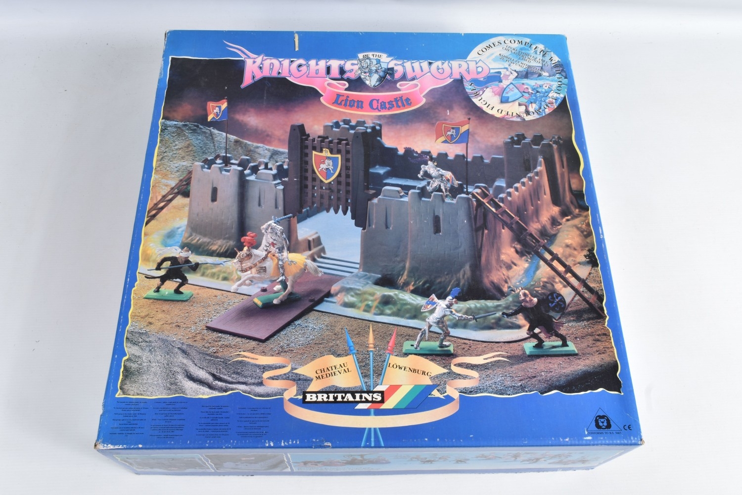 A BOXED BRITAINS KNIGHTS OF THE SWORD LION CASTLE, no. 7792, castle includes front gate, bridge, selection of flags and shields, and approximately forty-two foot soldiers and seventeen cavalry Deetail figures, with a made in China Britains figure and Timpo figure, some of the figures may be missing parts, some of the metal bases with store prices stickers such as Gamleys and Cadw, box in good condition although discoloured