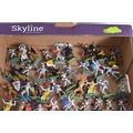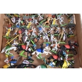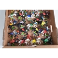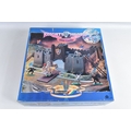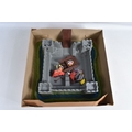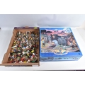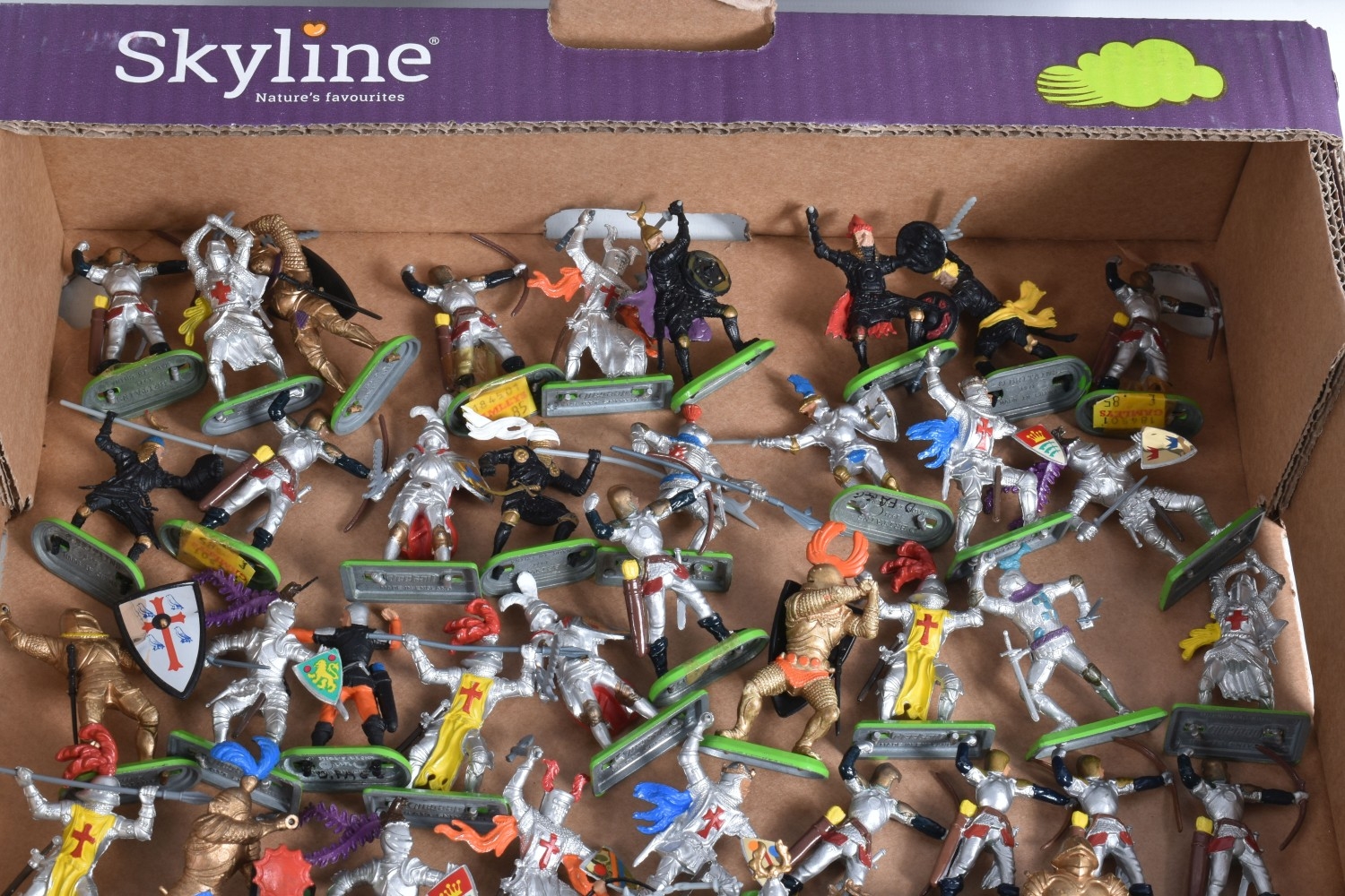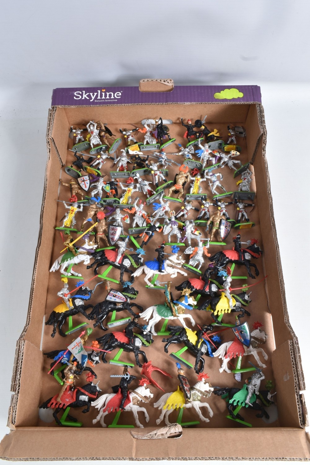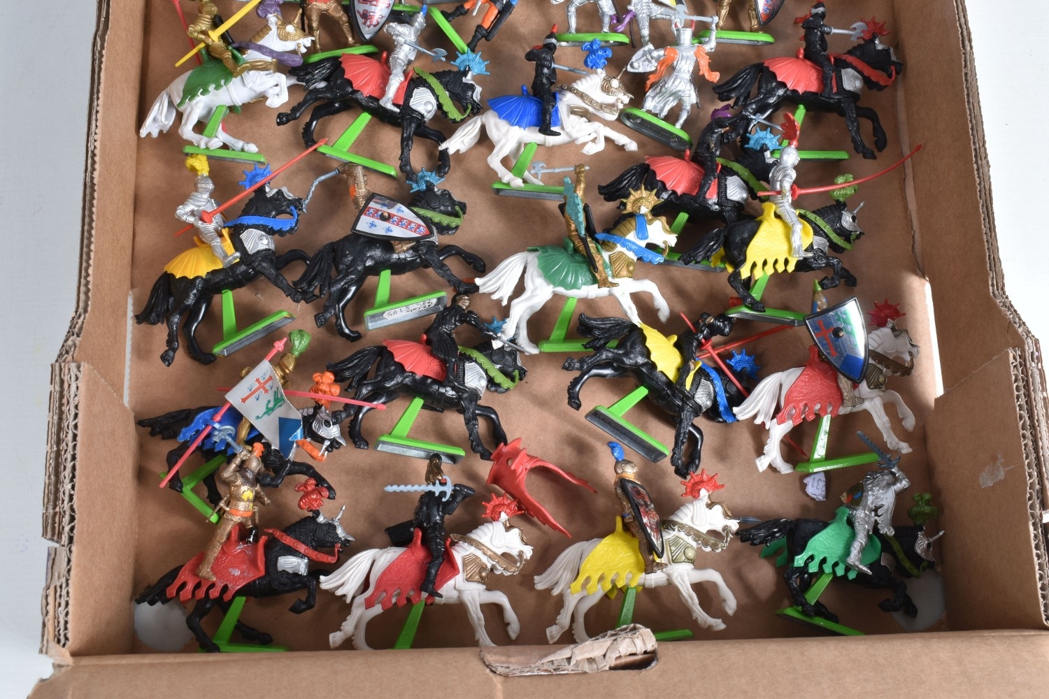 A BOXED BRITAINS KNIGHTS OF THE SWORD LION CASTLE, no. 7792, castle includes front gate, bridge, selection of flags and shields, and approximately forty-two foot soldiers and seventeen cavalry Deetail figures, with a made in China Britains figure and Timpo figure, some of the figures may be missing parts, some of the metal bases with store prices stickers such as Gamleys and Cadw, box in good condition although discoloured