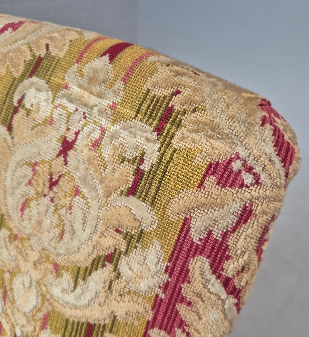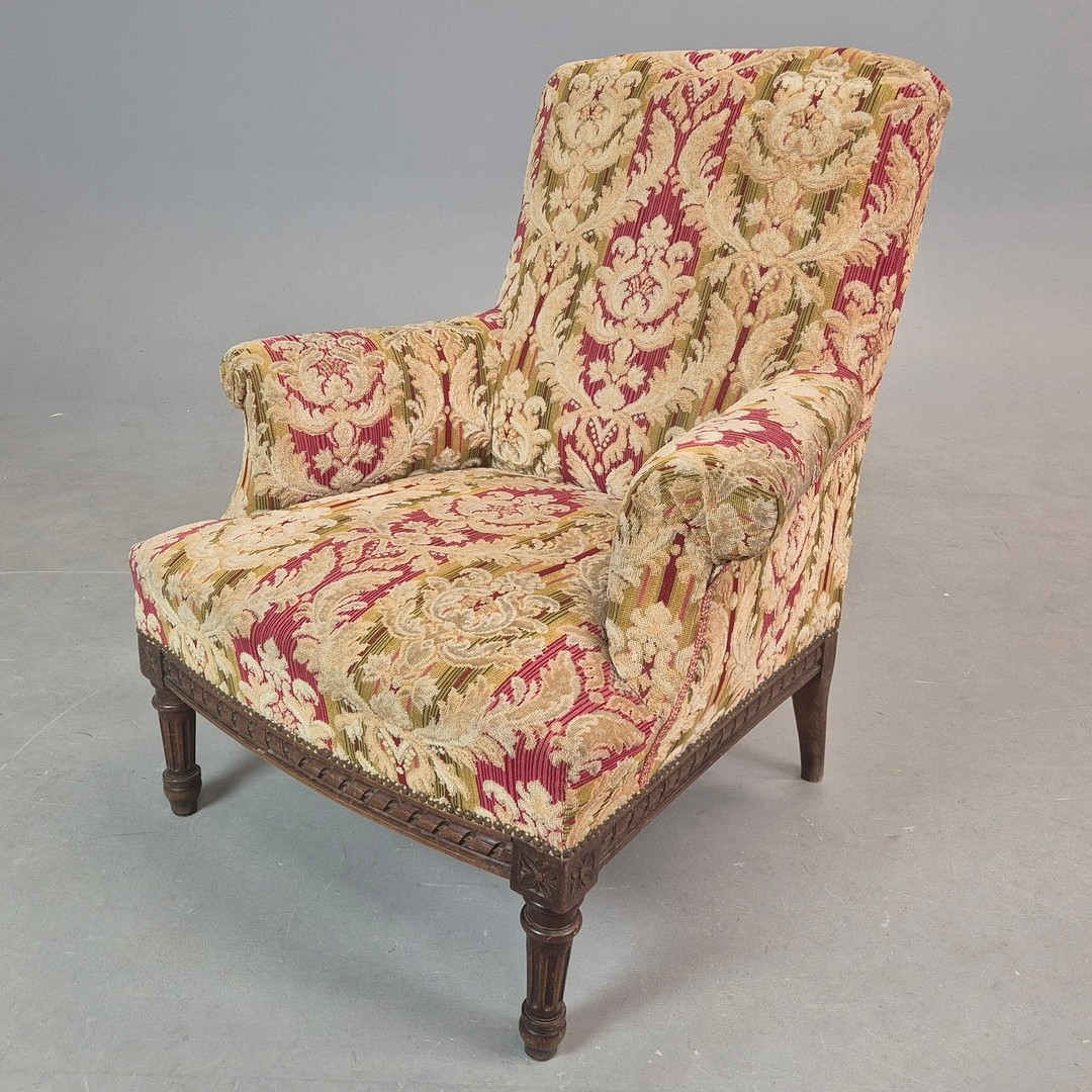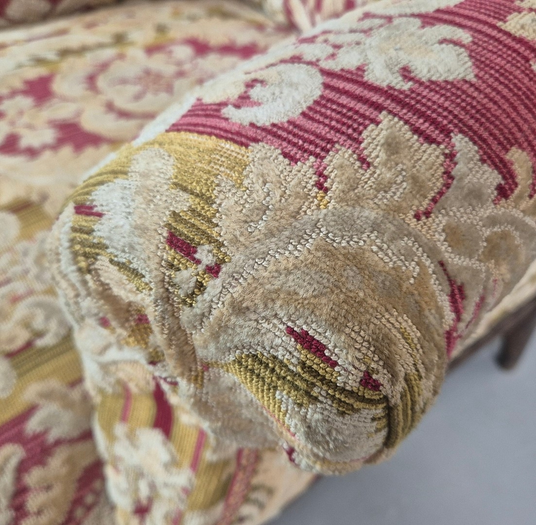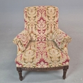 LATE 19TH CENTURY FRENCH WALNUT BERGERE. brocade upholstery, 94cm H x 82cm W x 88cm D.