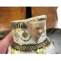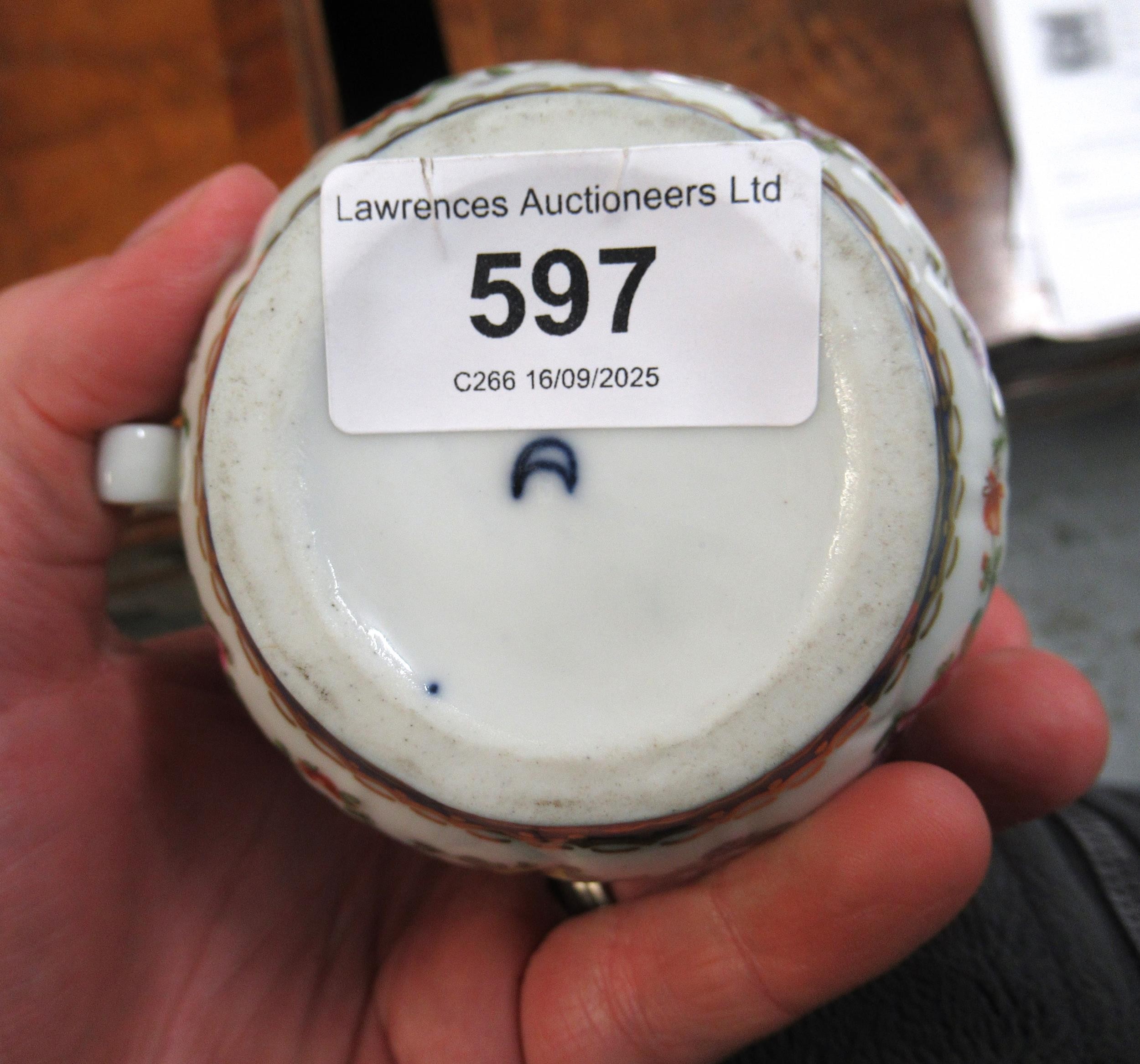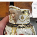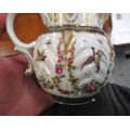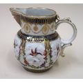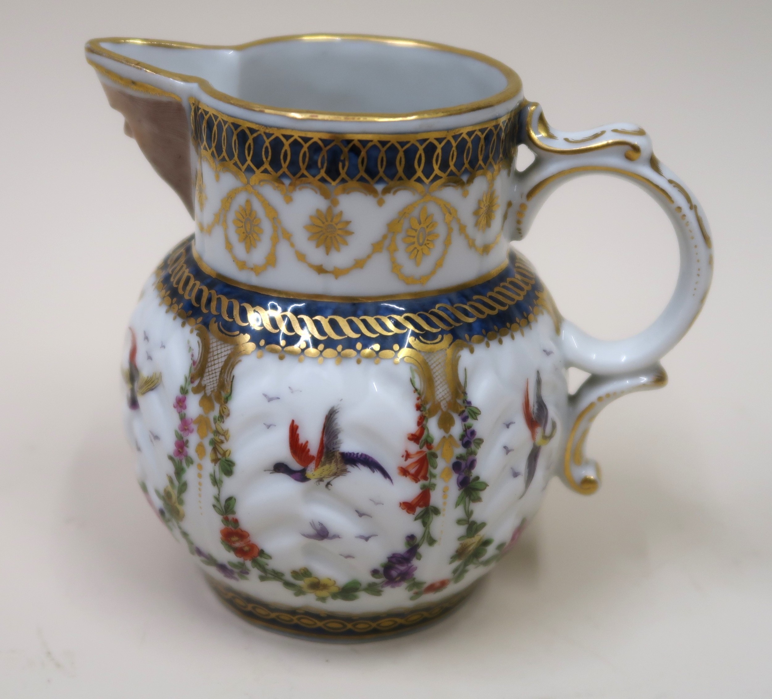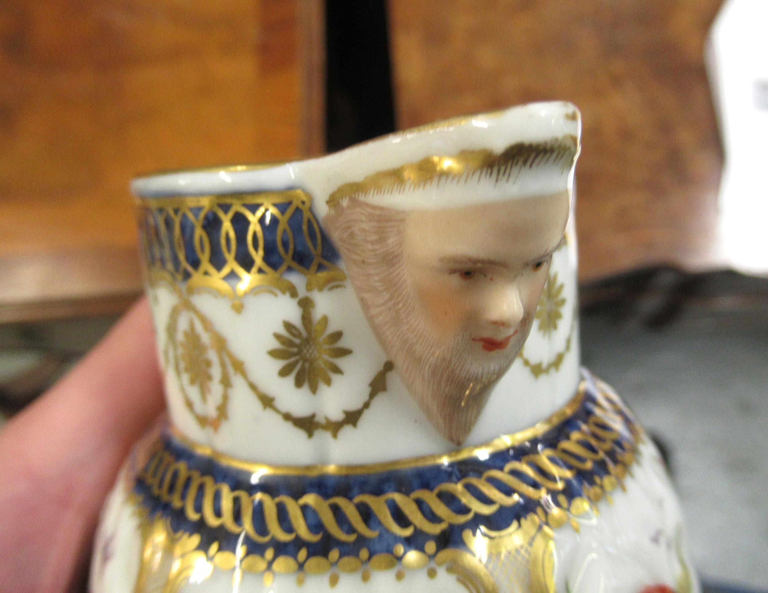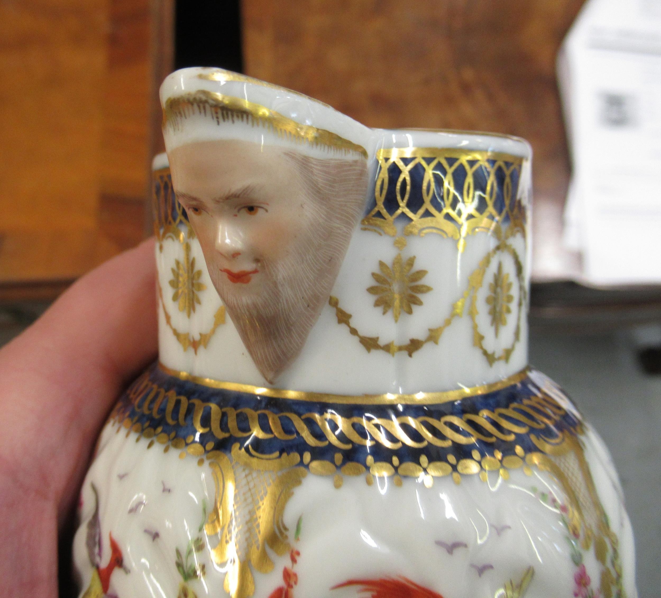 Antique Samson Worcester jug having gilded and floral bird swag decoration with mask head spout bearing crescent mark to base, 10cm high