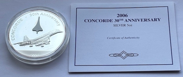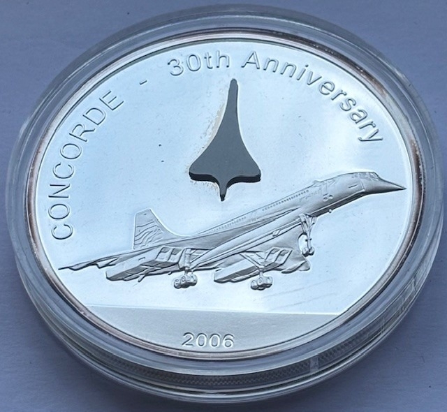 2006 .999 Solid Silver Proof Concorde 30th Anniversary Medallion, Real piece of Concorde inset, Diameter 65mm, Weight 5oz, COA, Presentation box