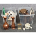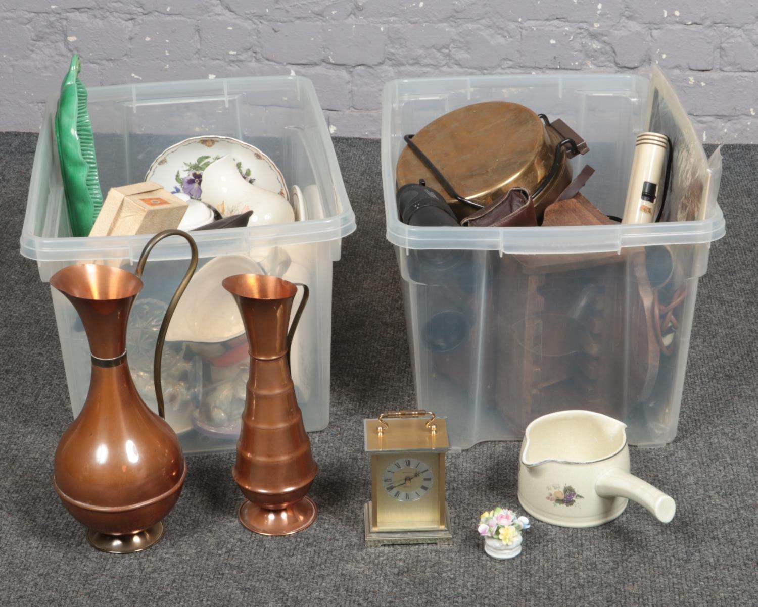 Two boxes of miscellaneous, President carriage clock, Royal Doulton Lambethware 'Harvest Garland' Jugs, Royal Doulton posy etc