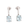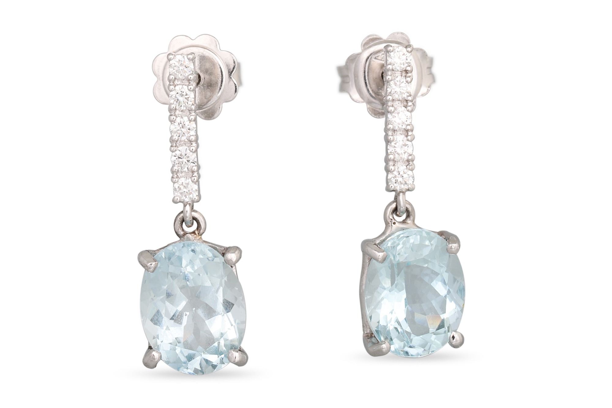 A PAIR OF AQUAMARINE AND DIAMOND EARRINGS, each line of diamonds suspending an aquamarine, mounted in 18ct white gold. Estimated: weight of aquamarine: 4.00 ct, diamonds: 0.30 ct