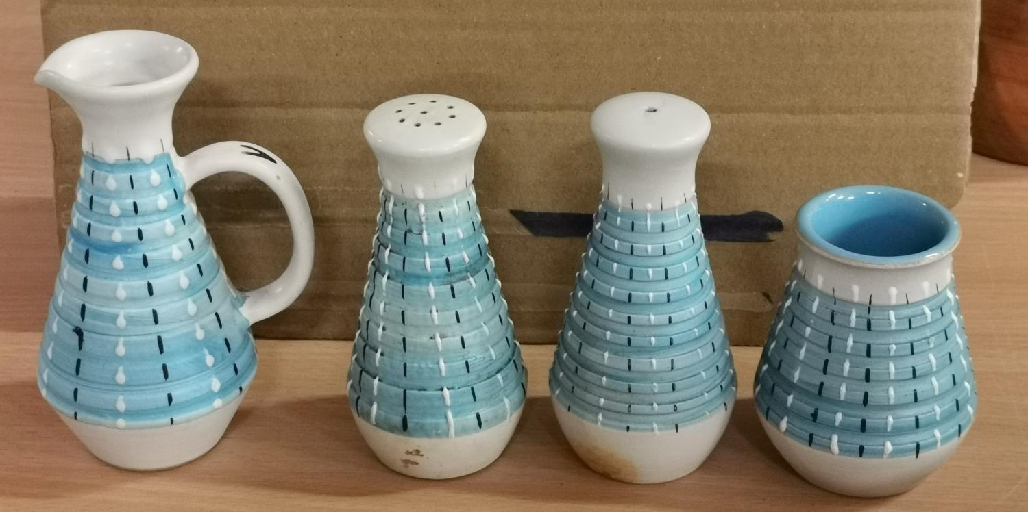 Retro Bourne Denby tableware being salt and pepper, vinaigrette jug and tooth pick pot