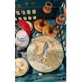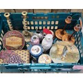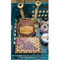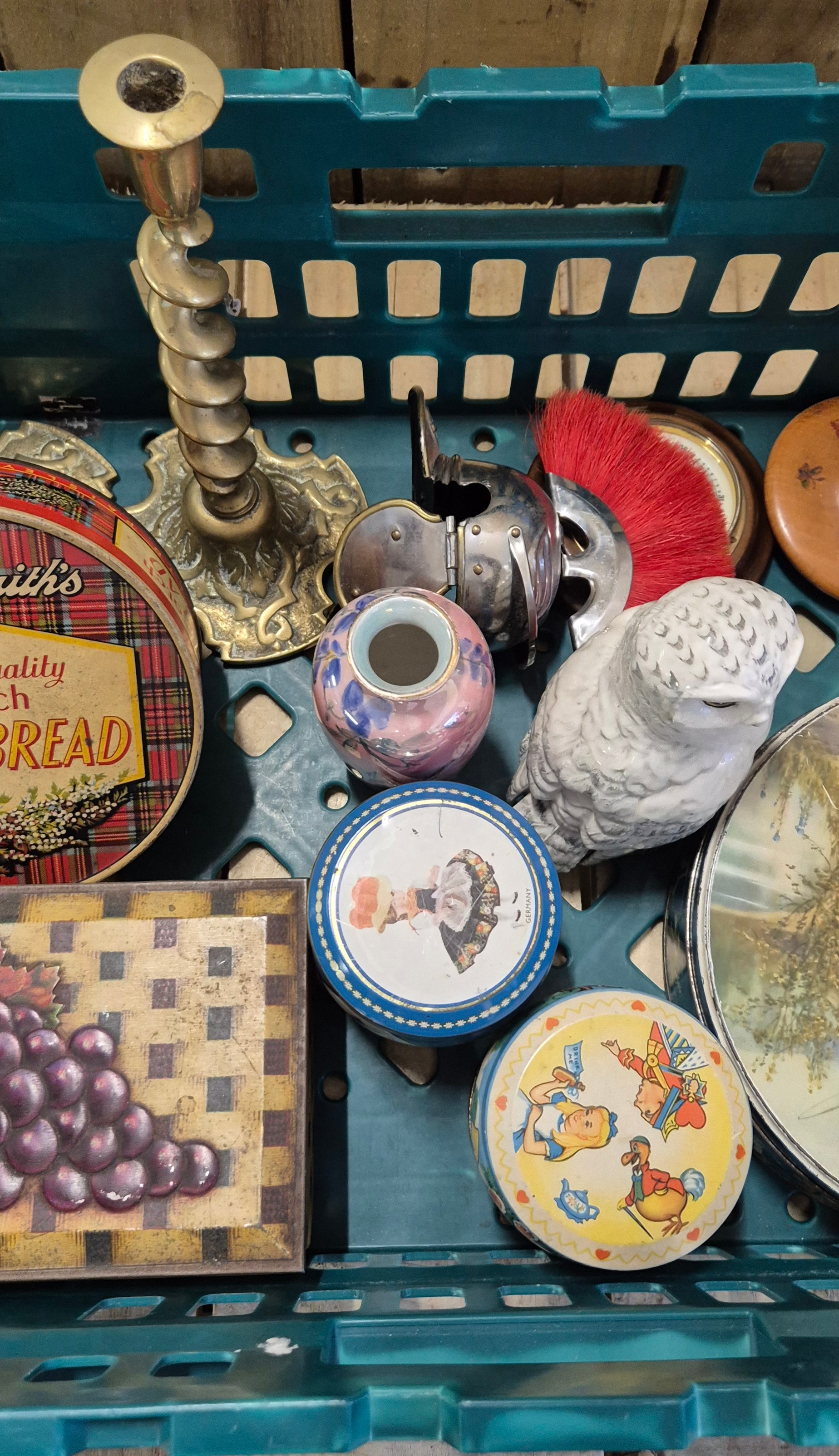 Crate Of Collectables; Royal Doulton Whyte & Mackay Snowy Owl, Burleigh Ware Lustre Vase With Bird Design, Various Vintage Tins, Brass Twisted Art Nouveau Style Candle Sticks And Arts And Crafts Poker Work Candle Sticks.