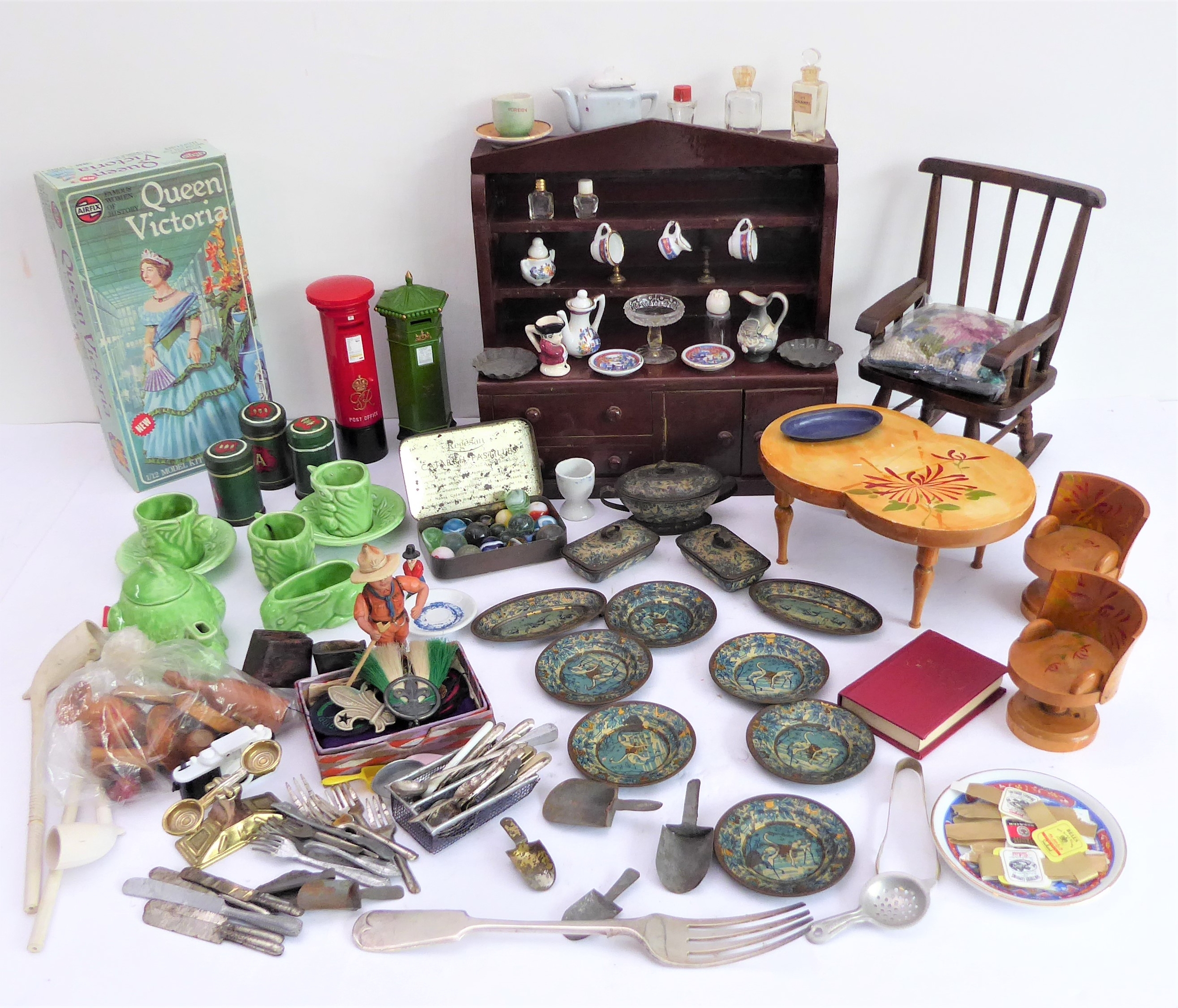 miniature flatware, tin storage jars, baking dishes and kitchen utensils;