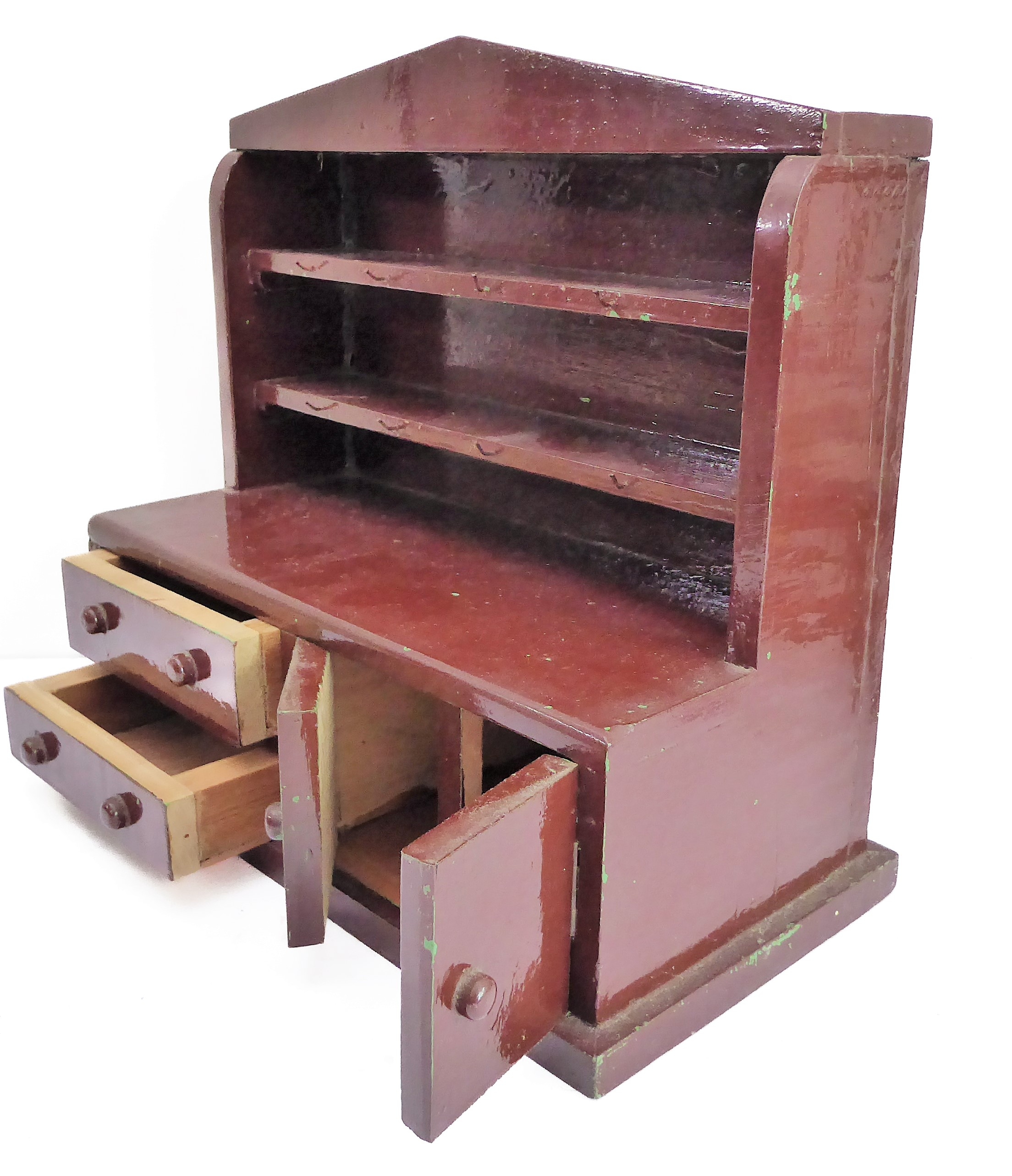 handmade doll's house furniture - dresser, rocking chair with hand-stitched cushion, table and two chairs;