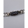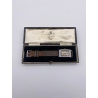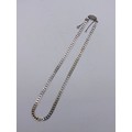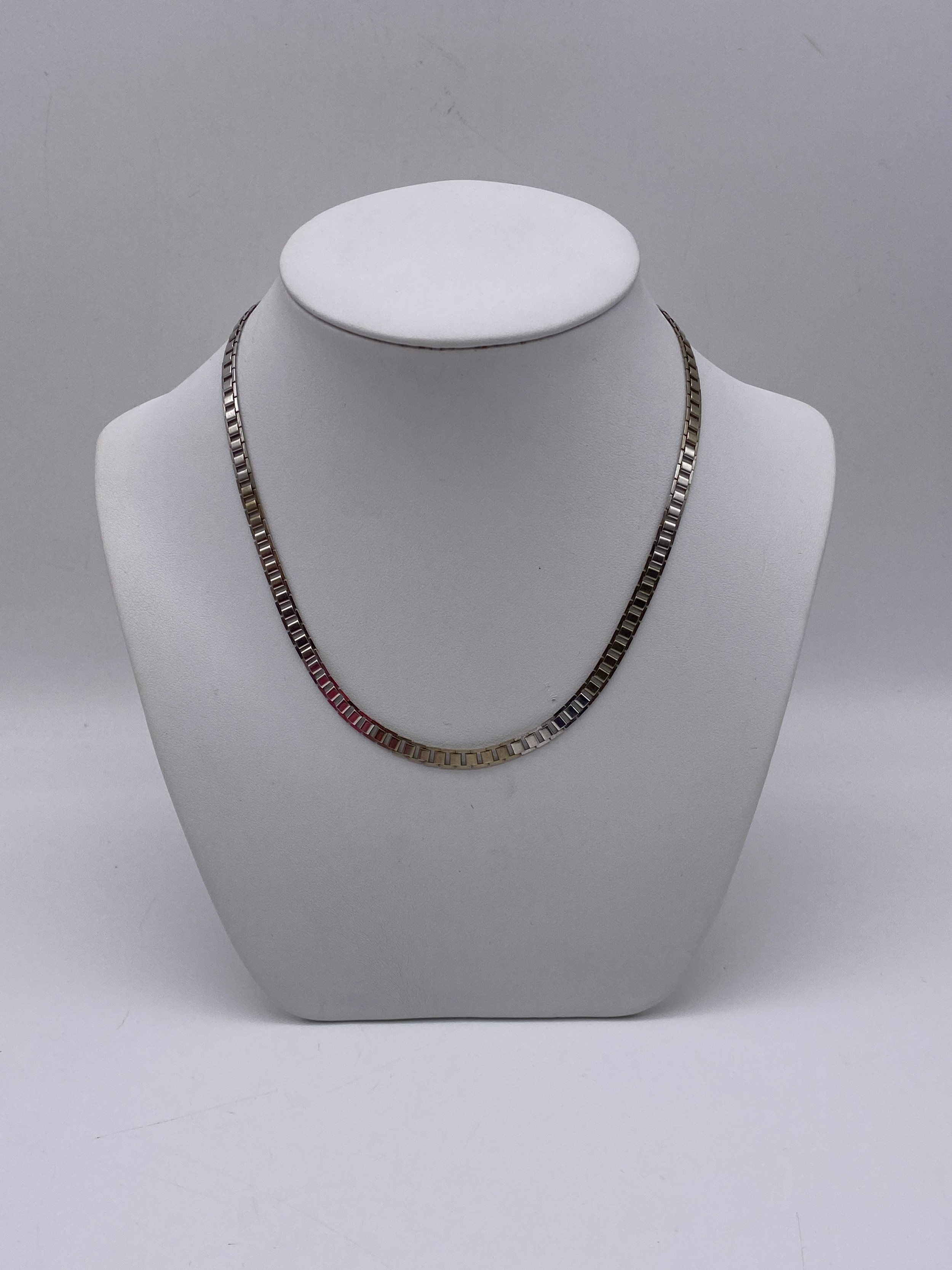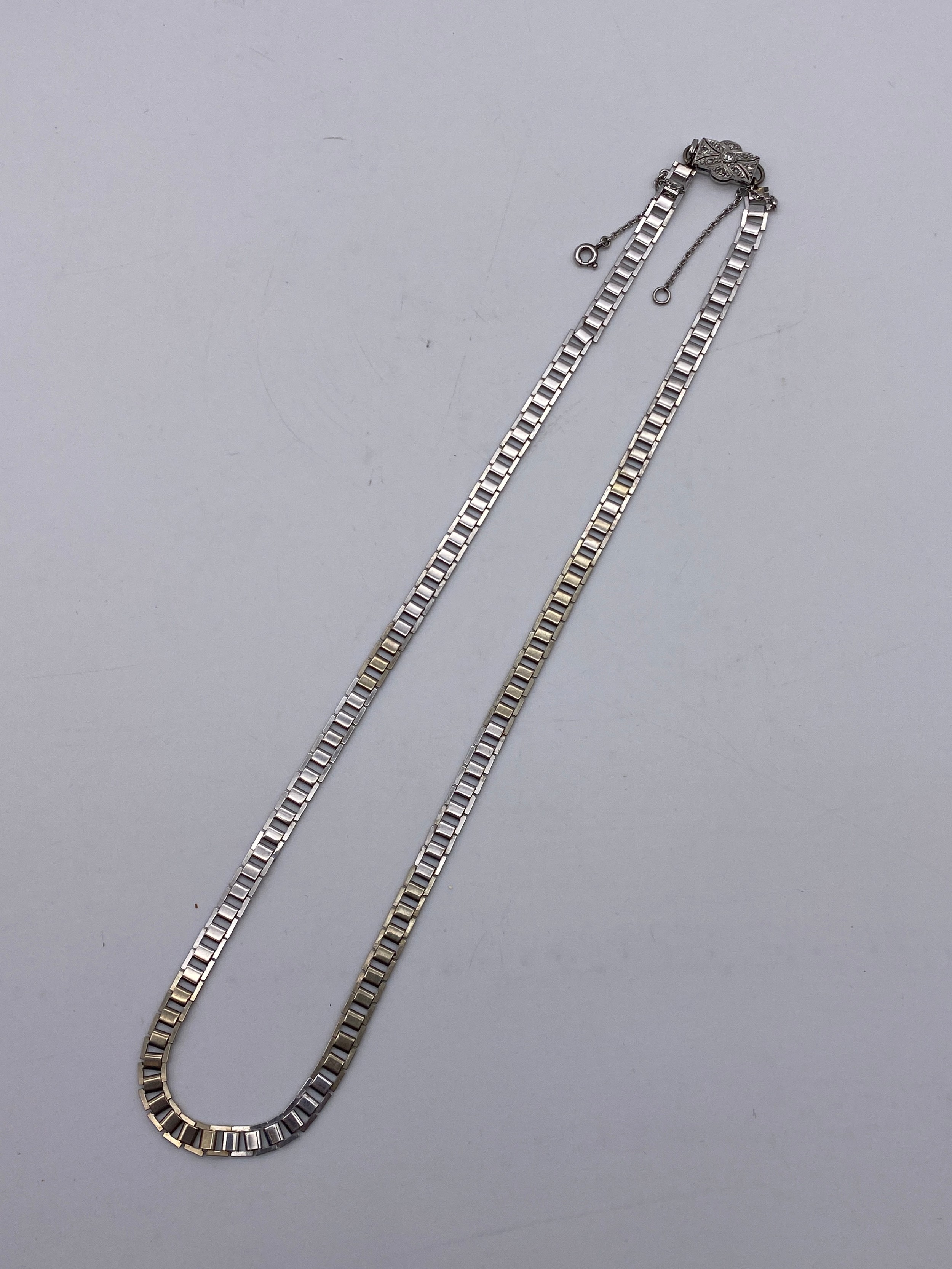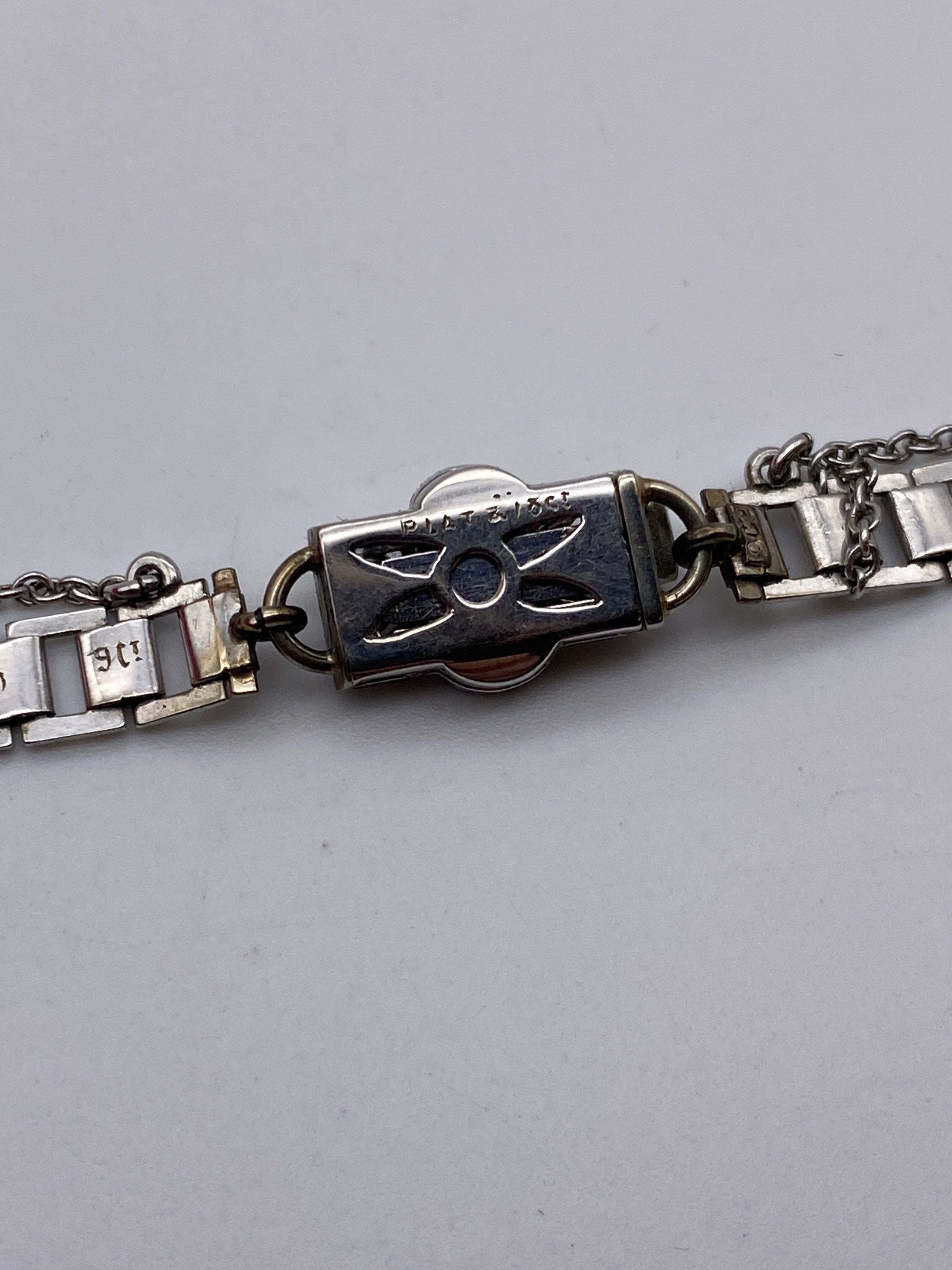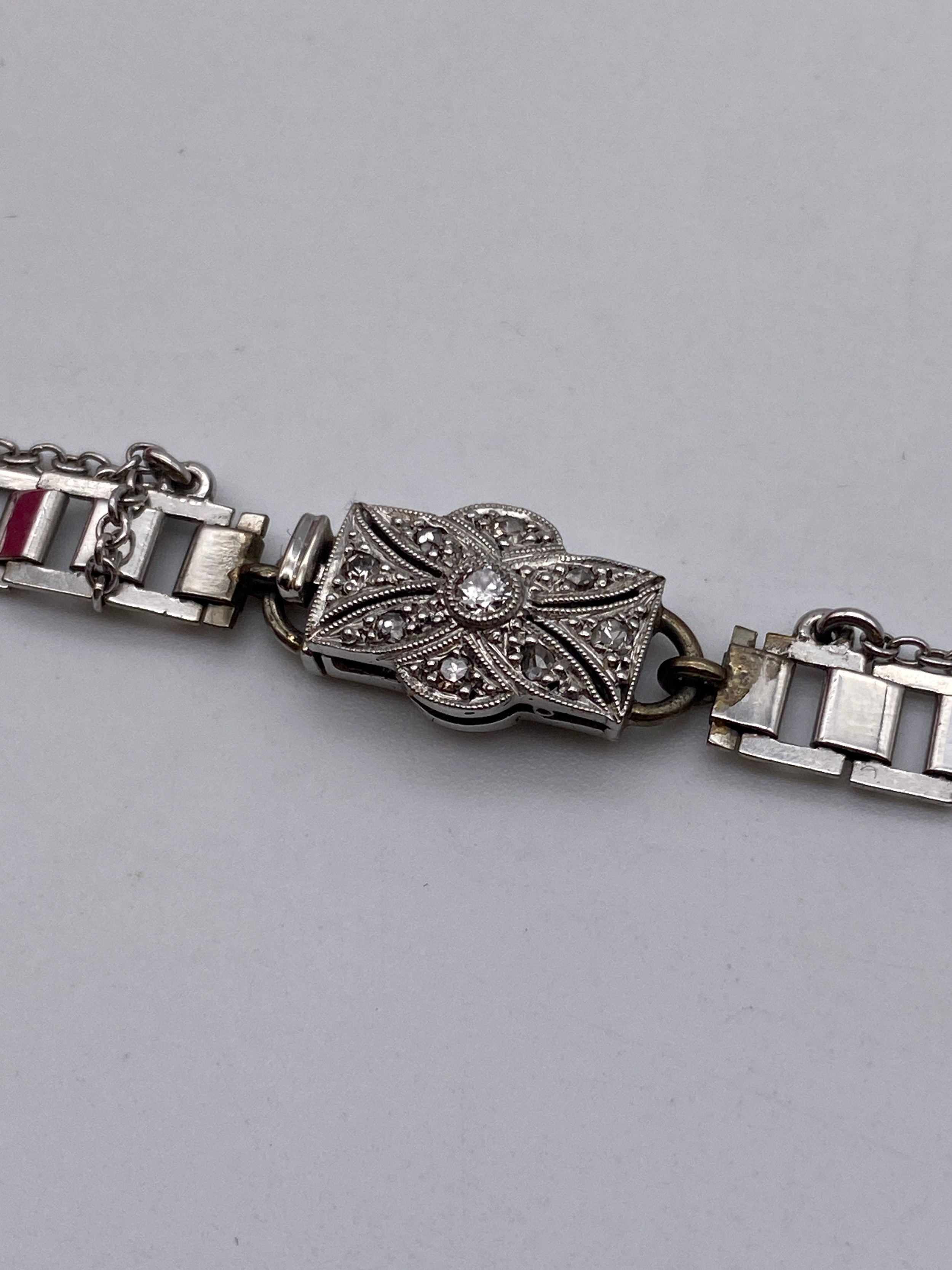 9CT WHITE GOLD SQUARE LINK ART DECO STYLE NECK CHAIN WITH DIAMOND CHIP ENCRUSTED 18CT AND PLAT CLASP WITH SAFETY CHAIN 10.8G APPROX