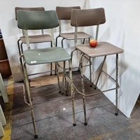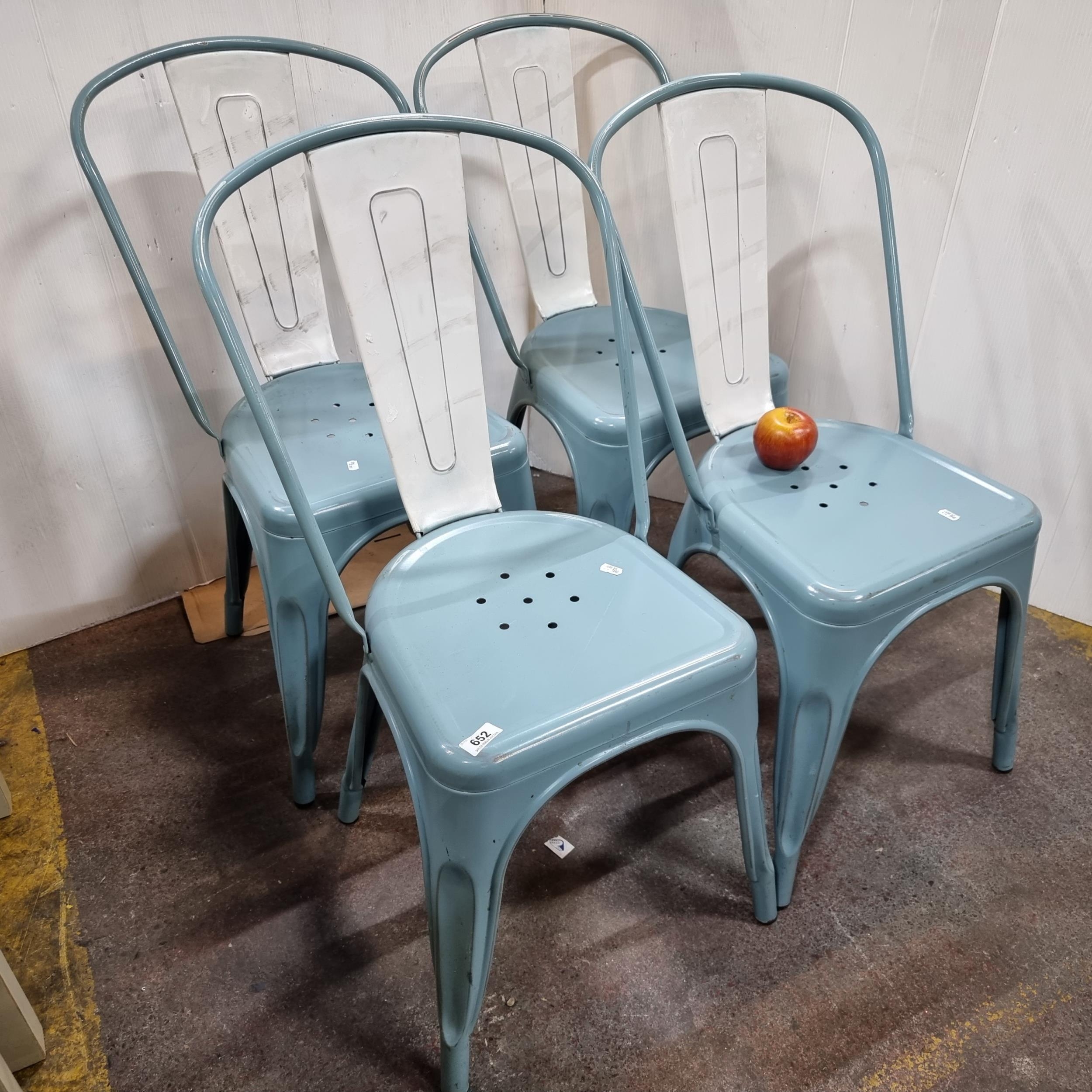 Four metal tolix style cafe chairs in duck-egg blue and white. Super cool looking set with a great industrial look.