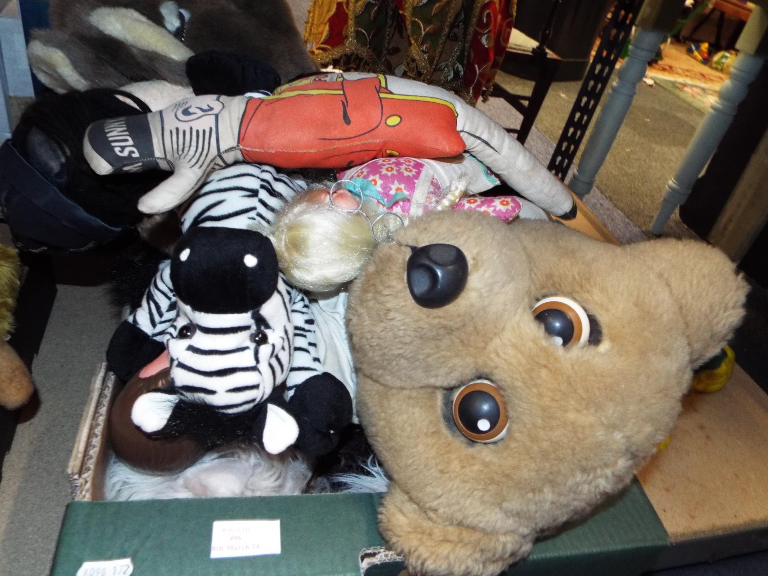 A box of mixed soft toys to include Sunny Jim cloth doll etc