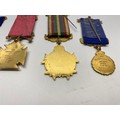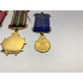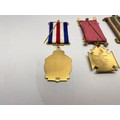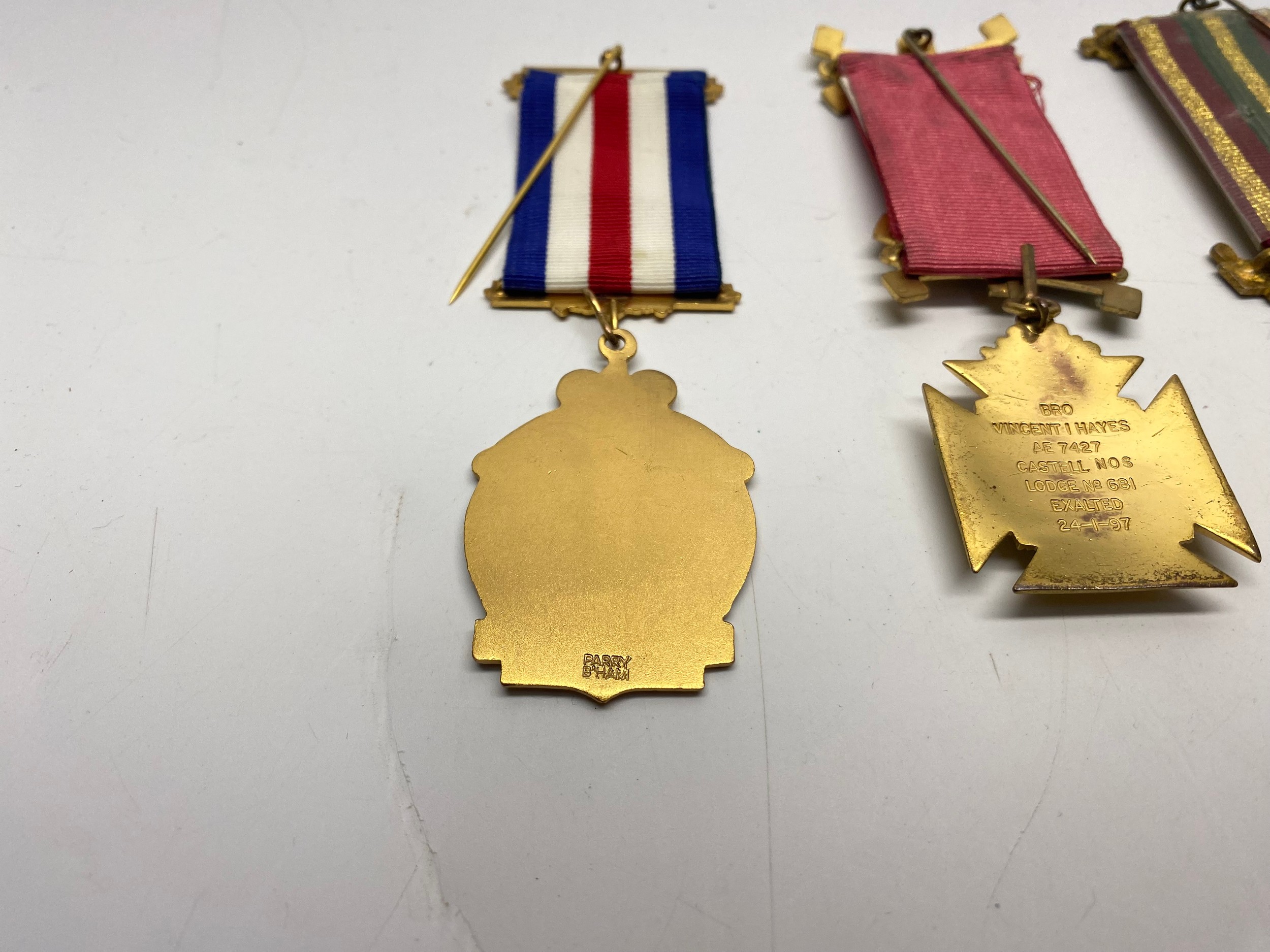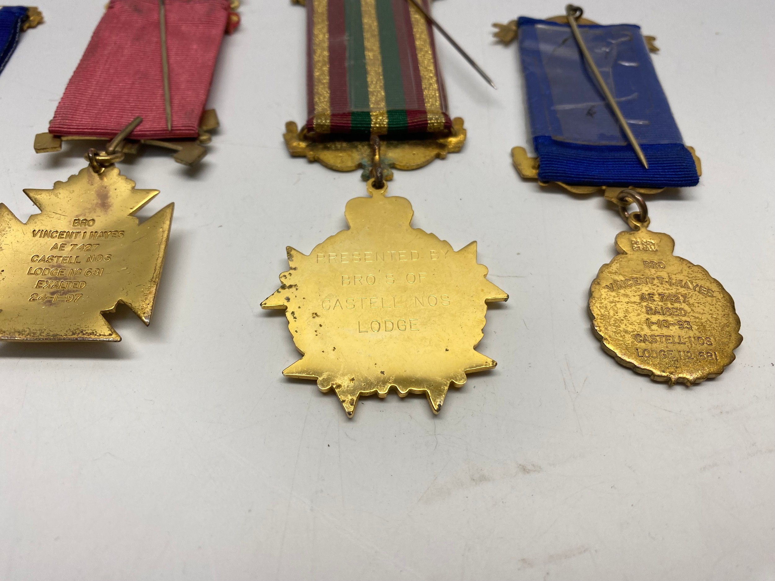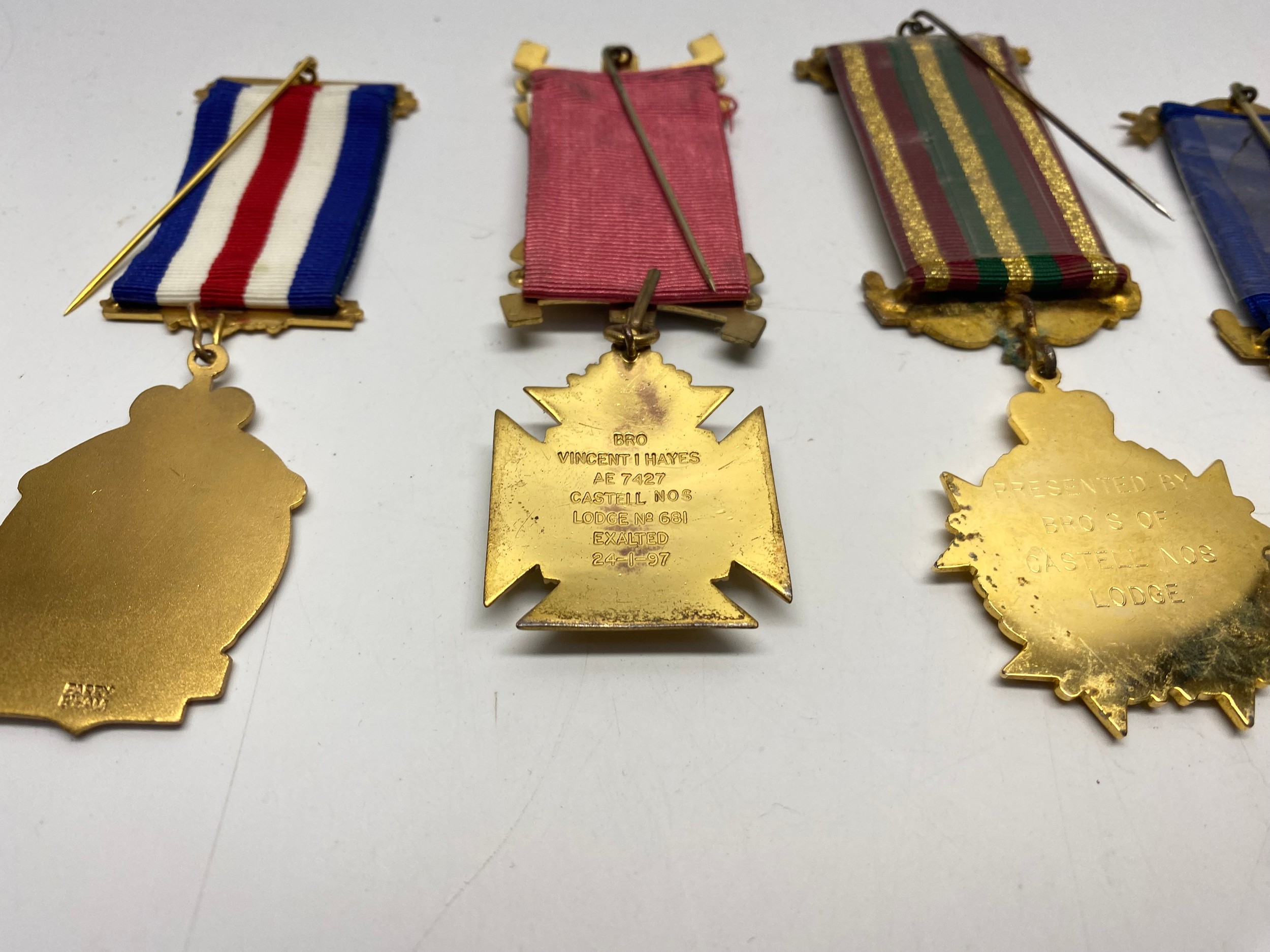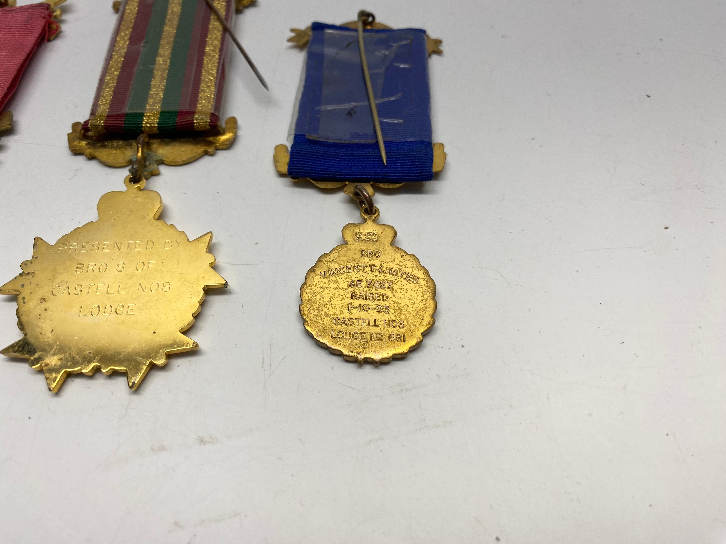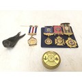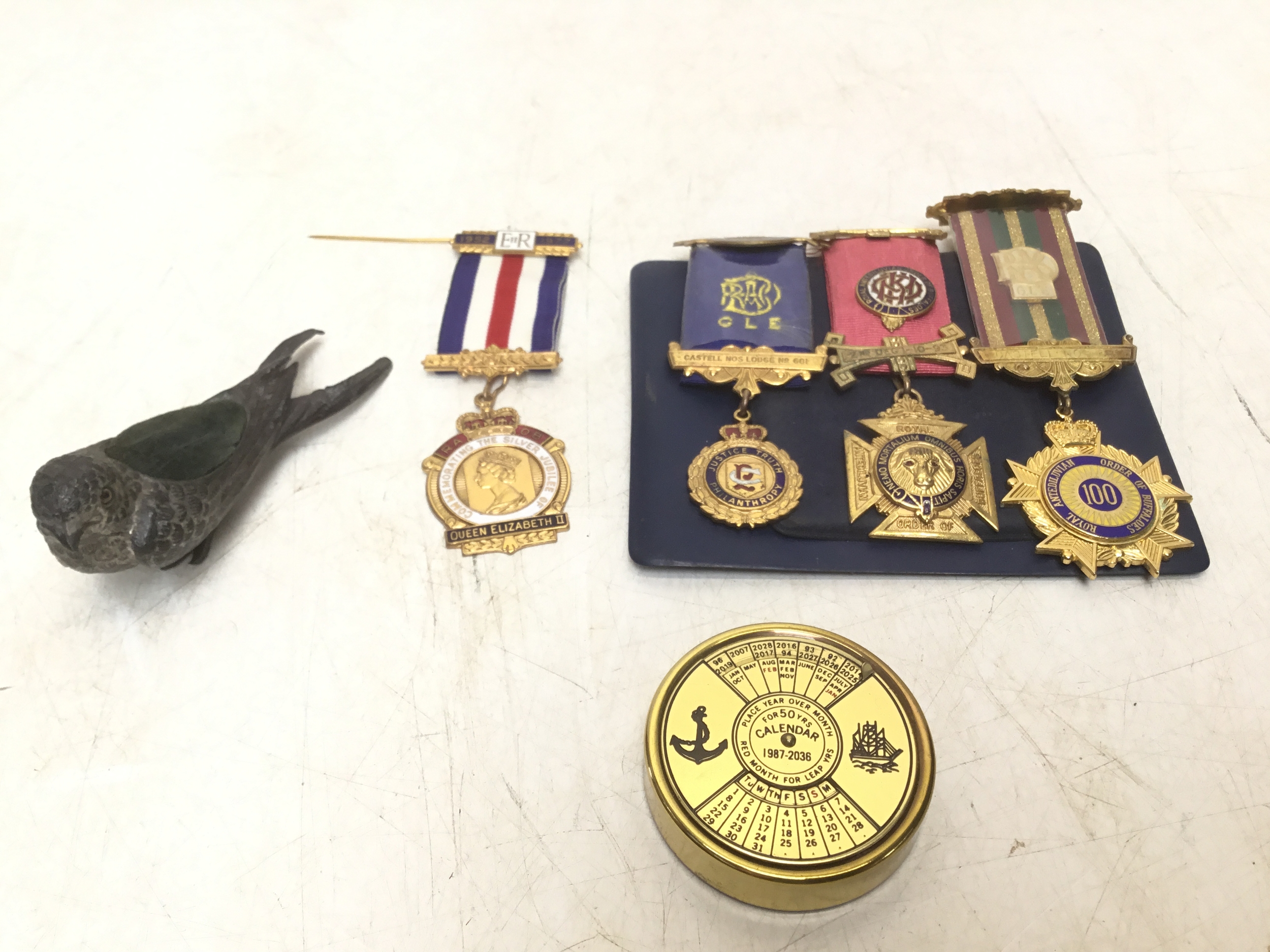 Collectible items including Masonic medals, bird pin cushion and a brass 50 year calendar