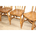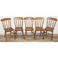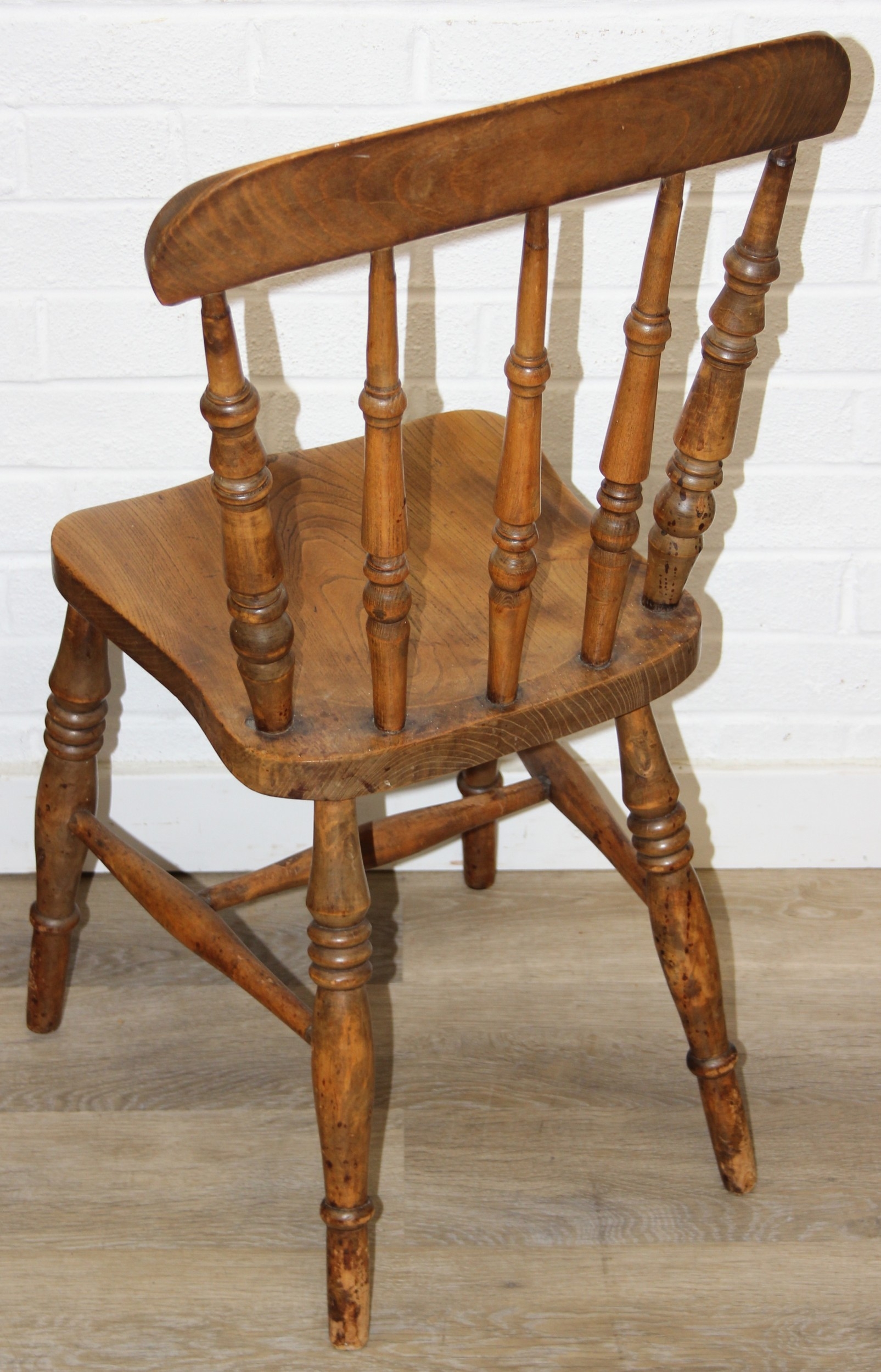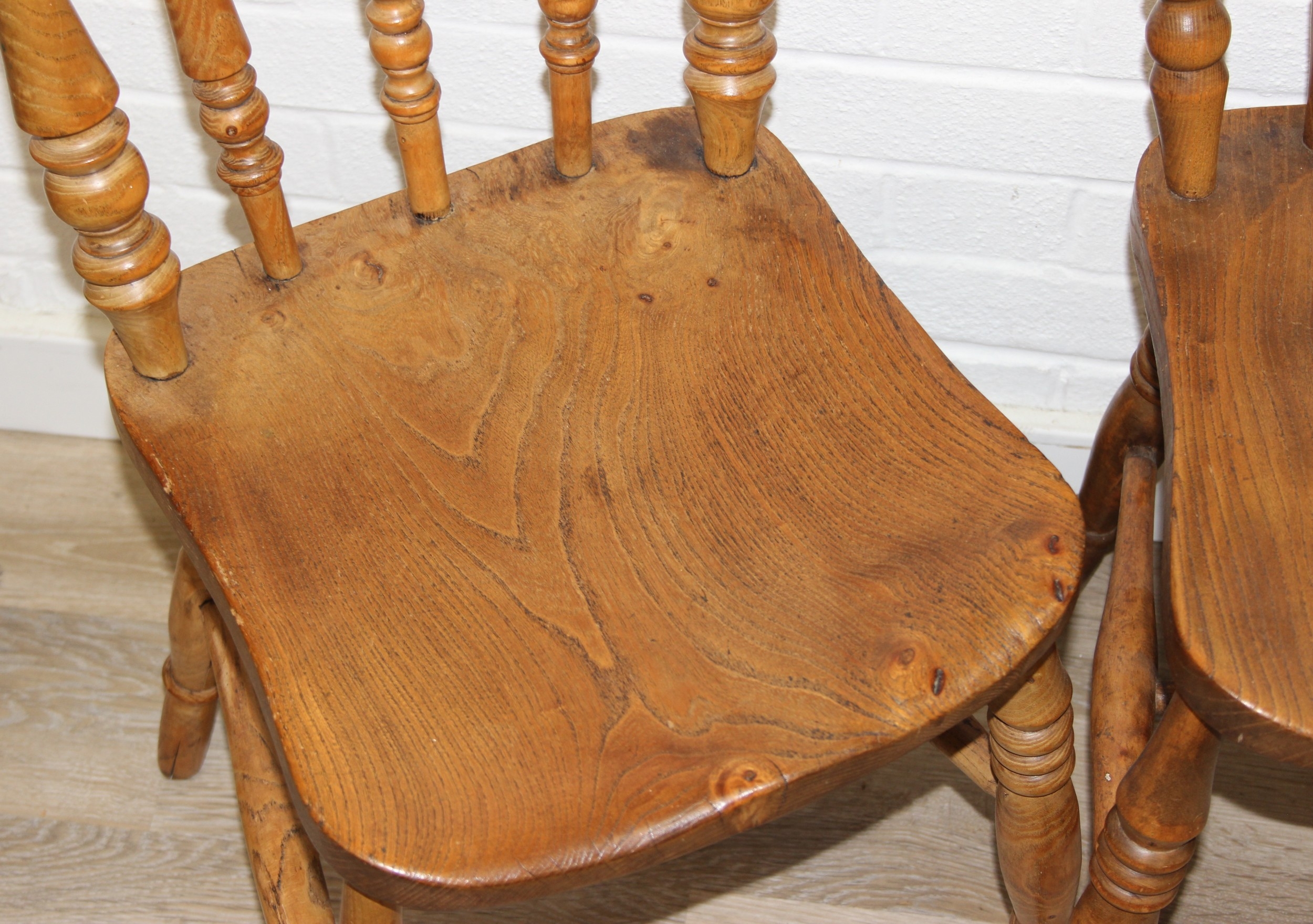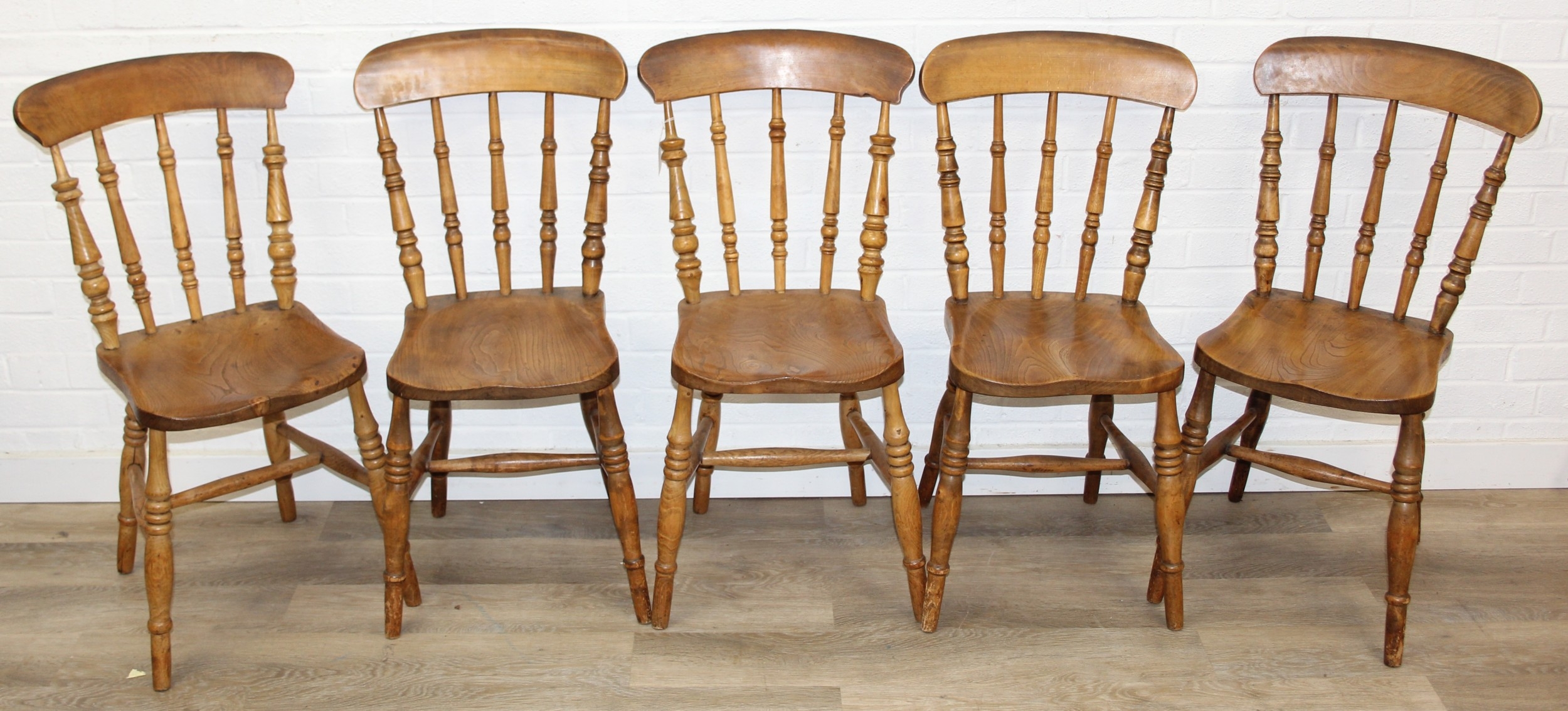 A set of five antique farmhouse kitchen chairs with elm seats, turned spindle backs, each 89cm tall [5]