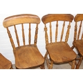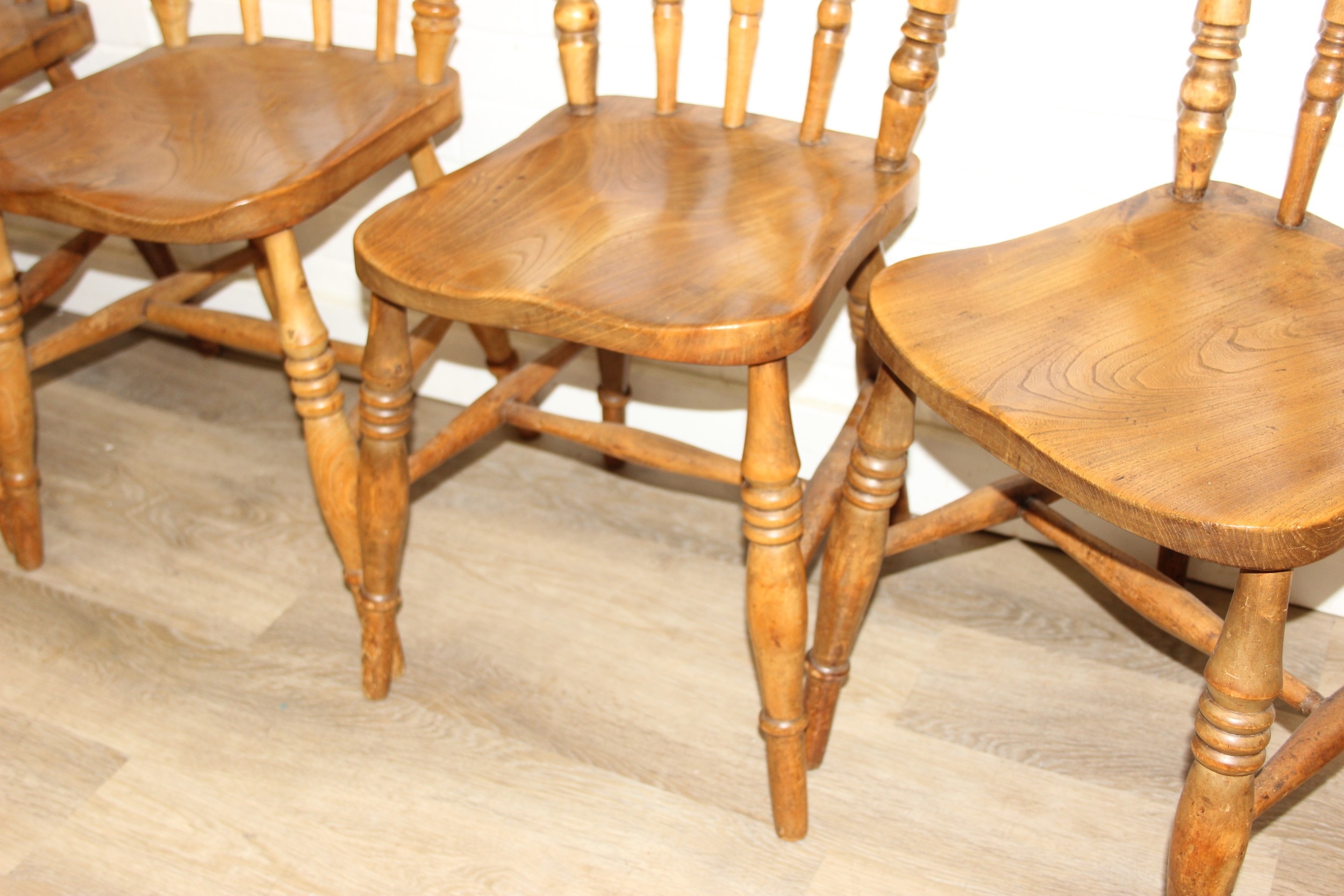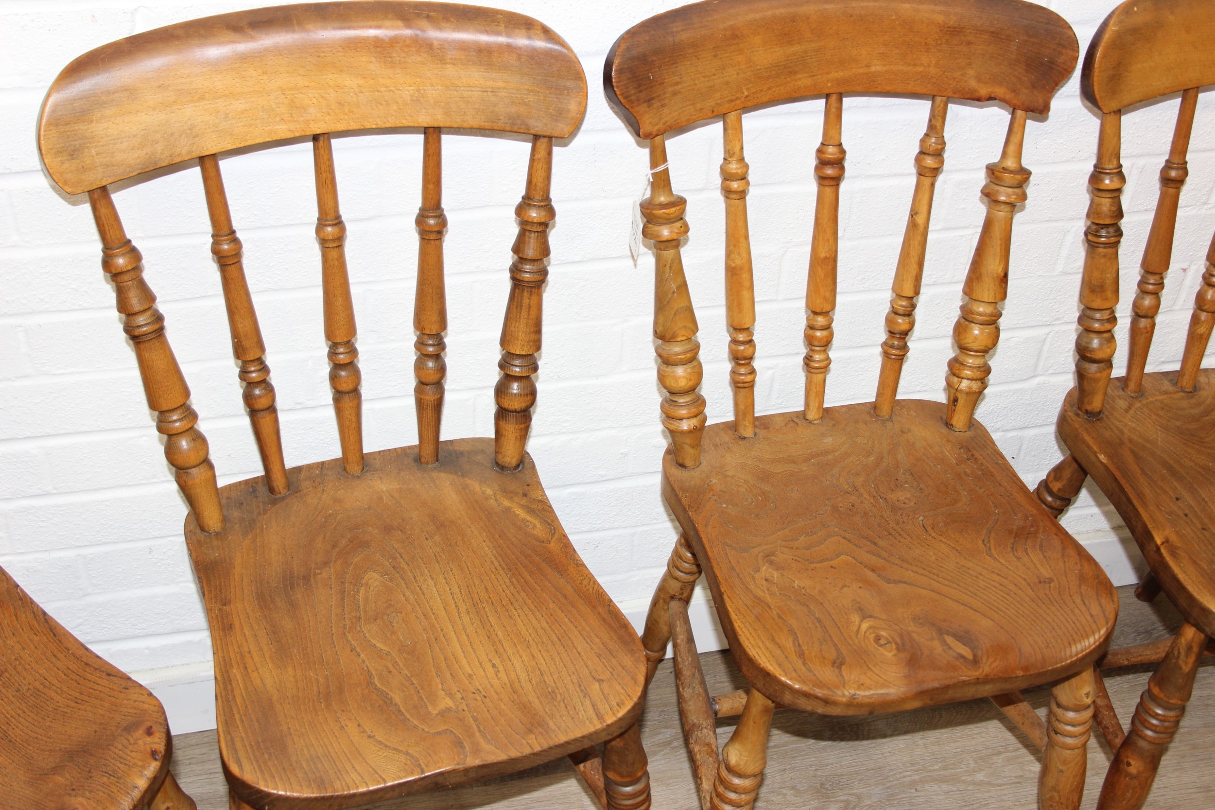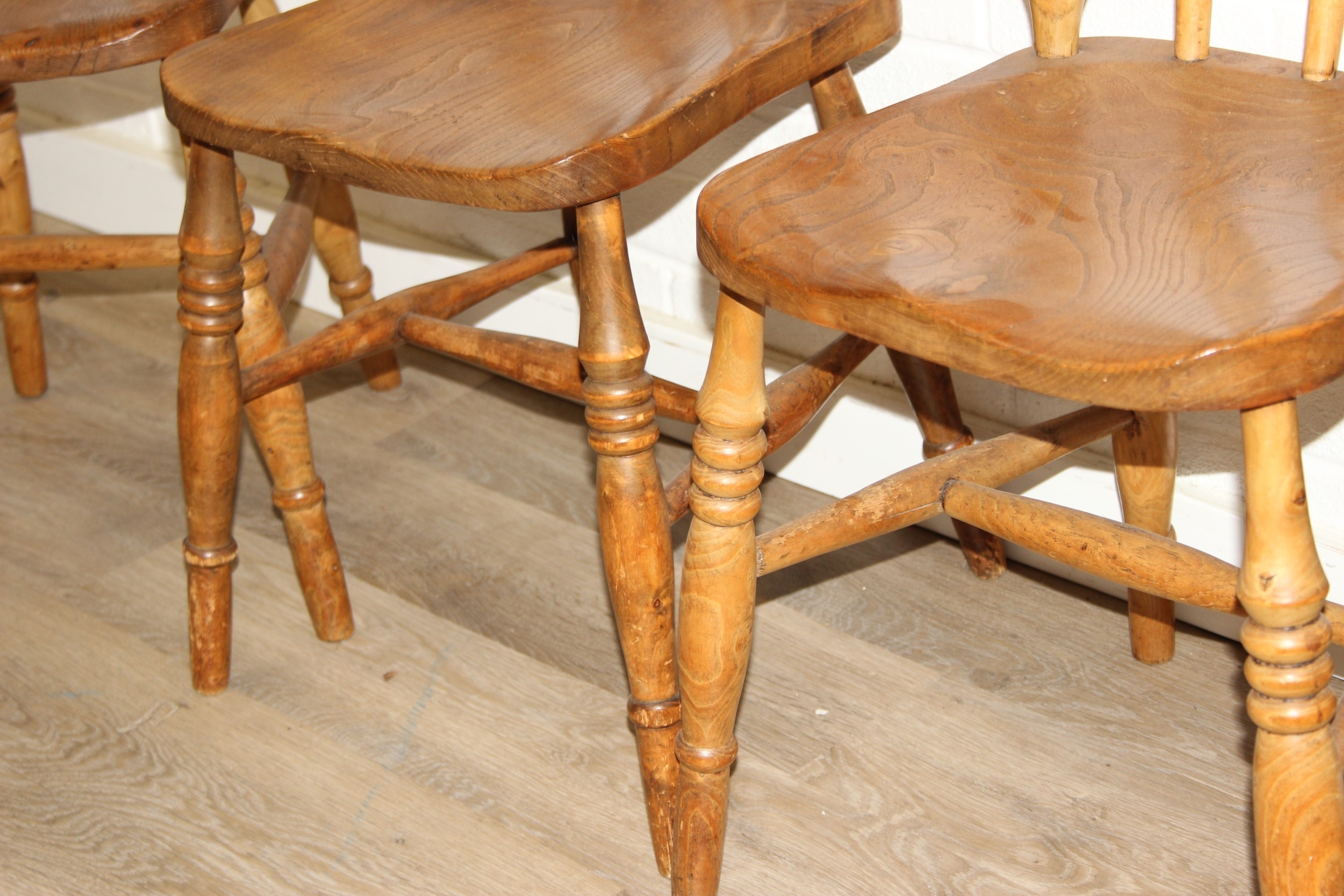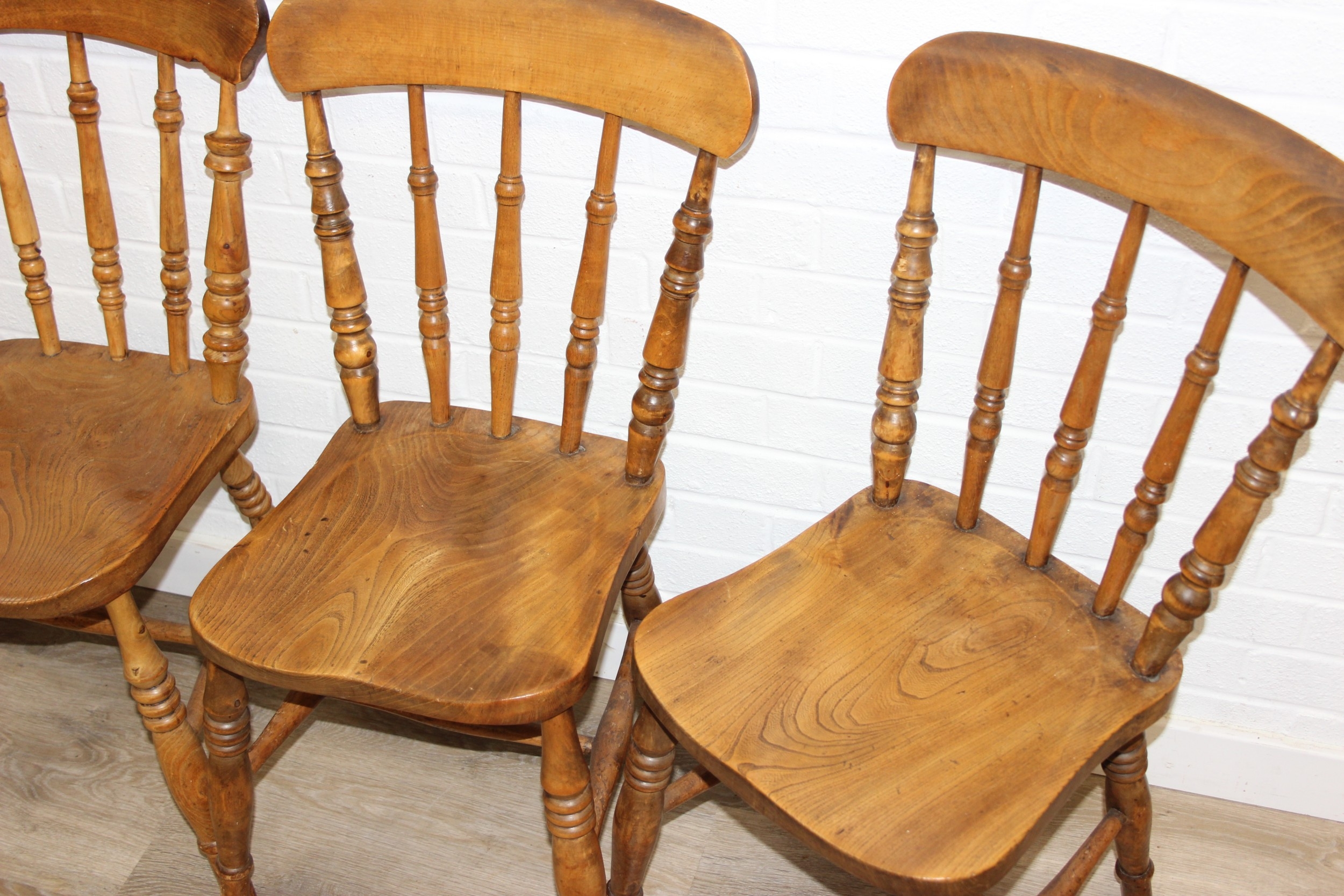 A set of five antique farmhouse kitchen chairs with elm seats, turned spindle backs, each 89cm tall [5]