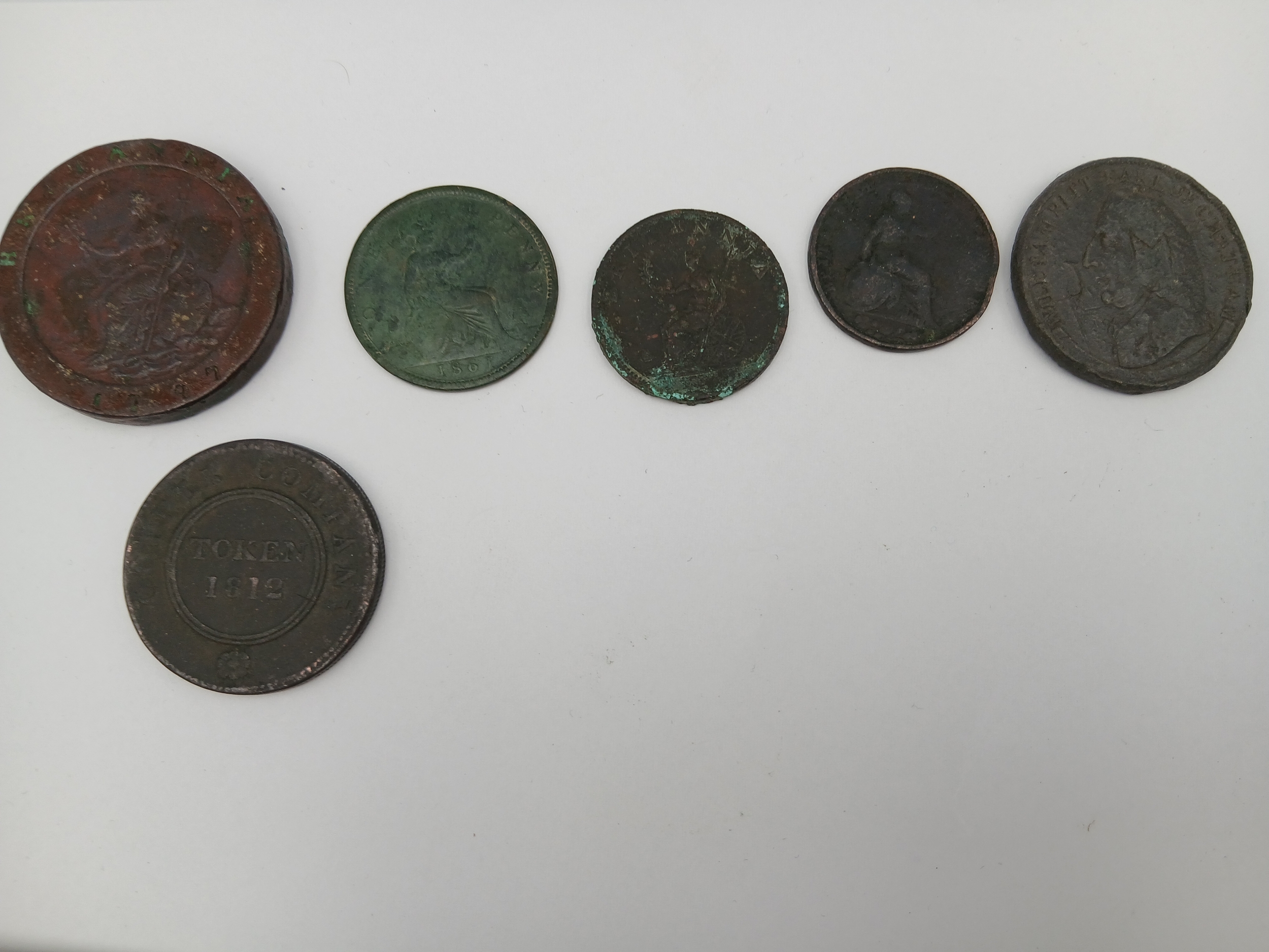A collection of antique coins and a 2006 eightieth birthday crown. Coins inlcude, 1797 cartwheel penny, 1867 penny, 1807 pennies and two tokens. One token is will lampitt earl of Chatham and the other 1812 copper company token.