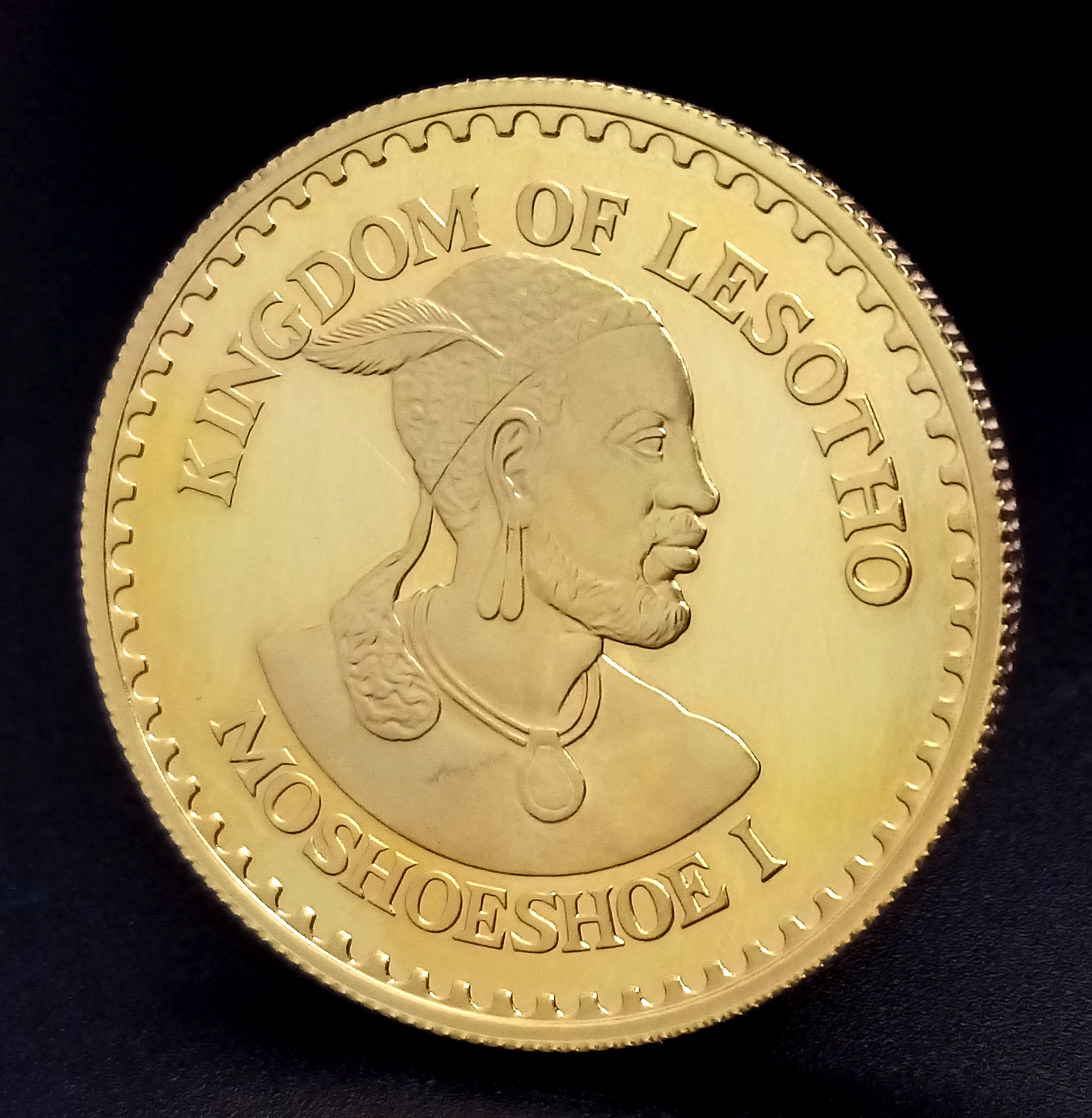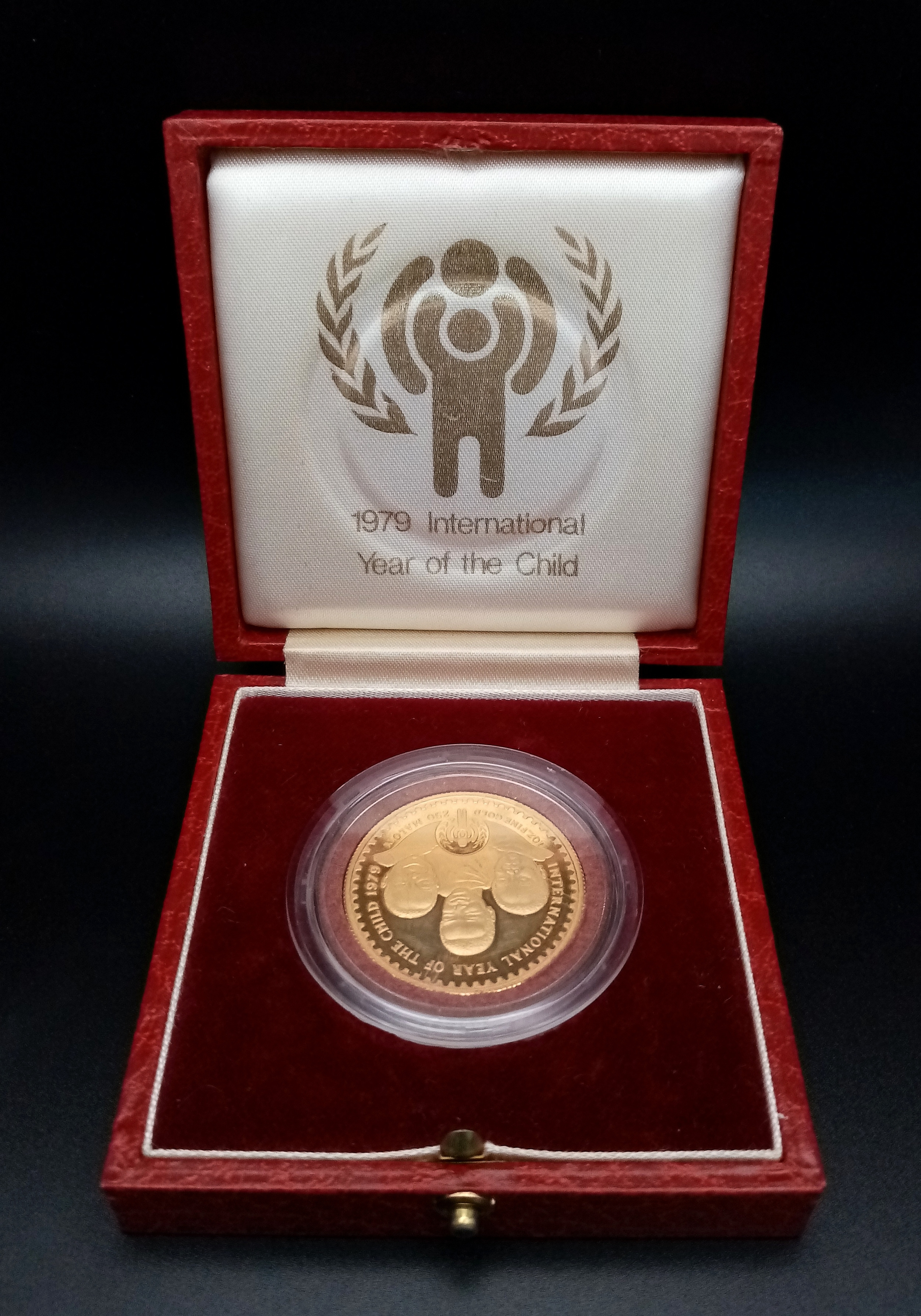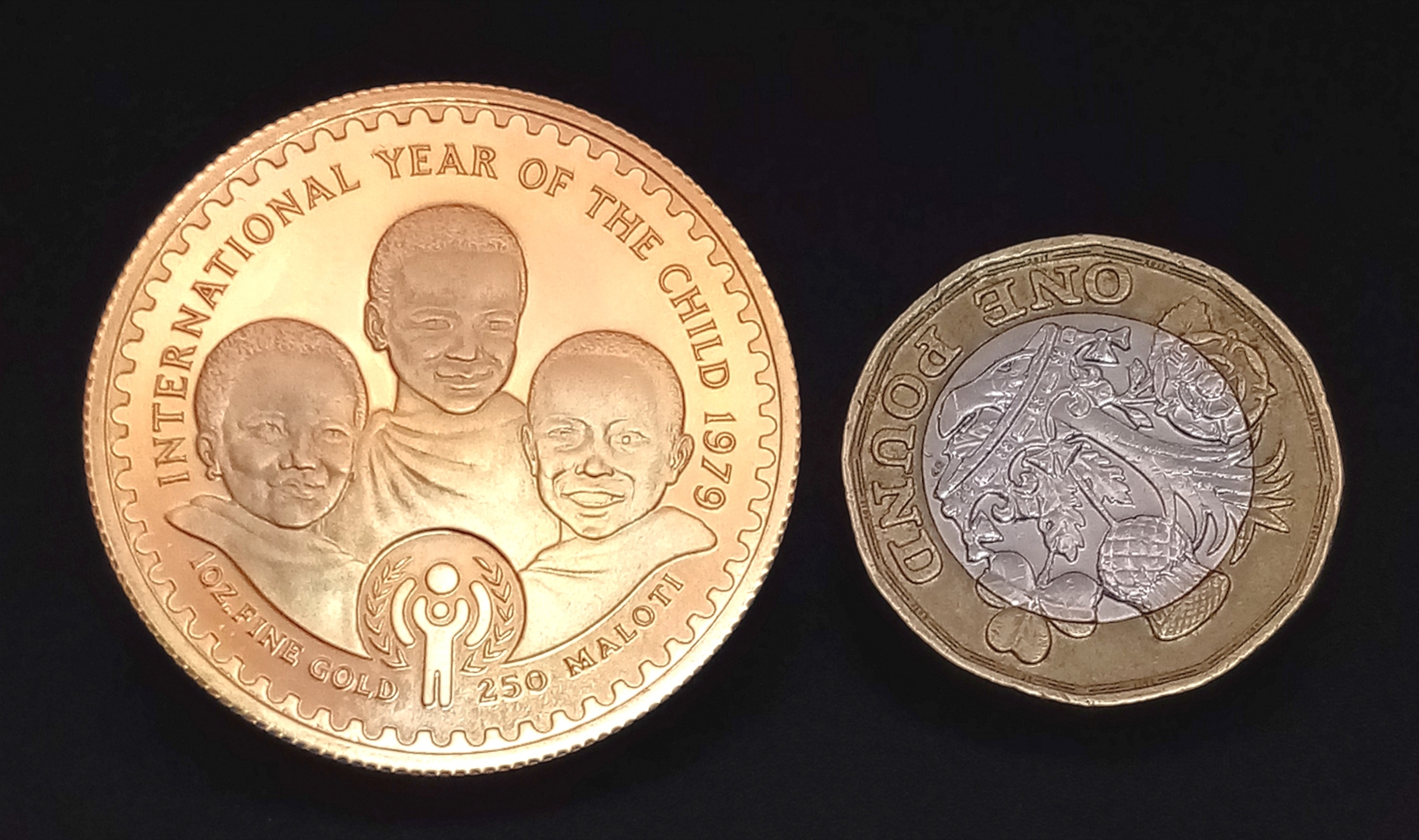 A 1979 Lesotho Year of the Child 22K Gold Proof Condition 1oz Coin. Face value of 250 Maloti. 2000 minted. 33.9g. Original case.