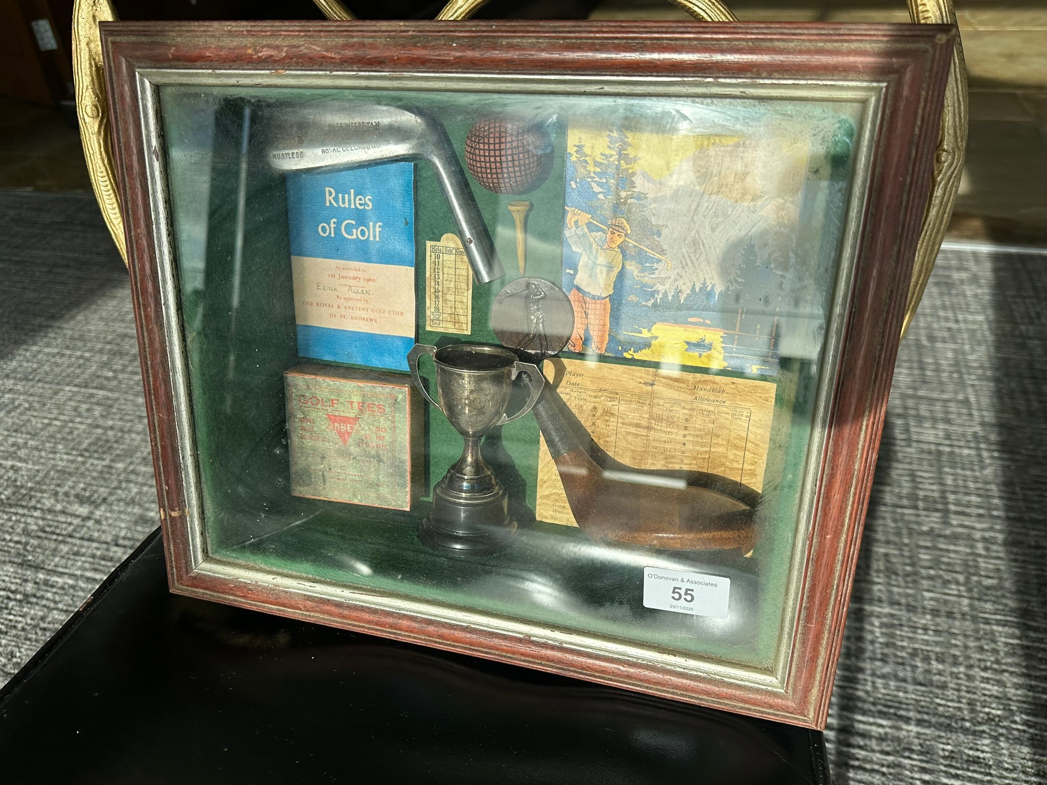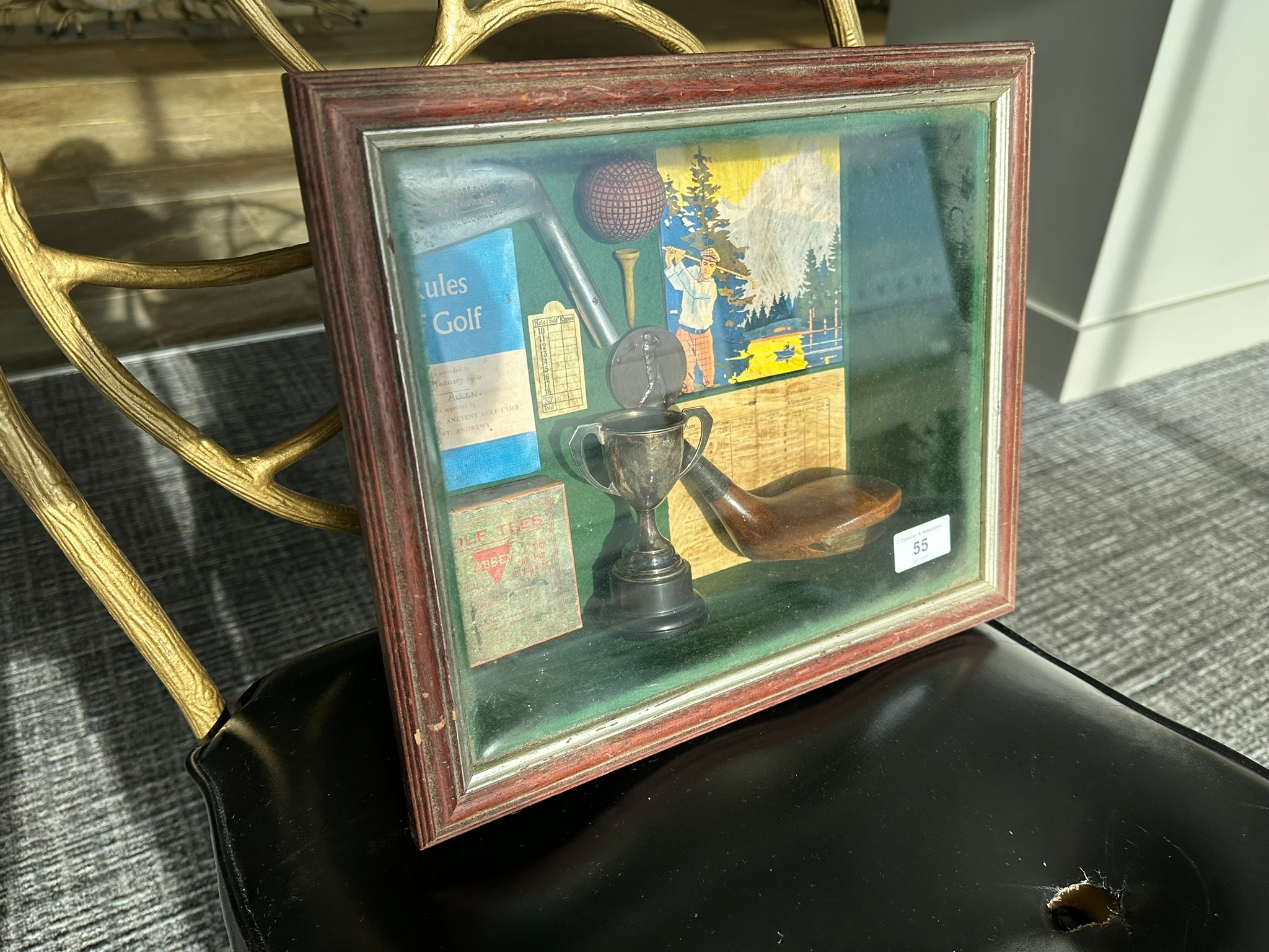 Vintage golf memorabilia shadow box containing various golf related pieces, 35cm x 30cm