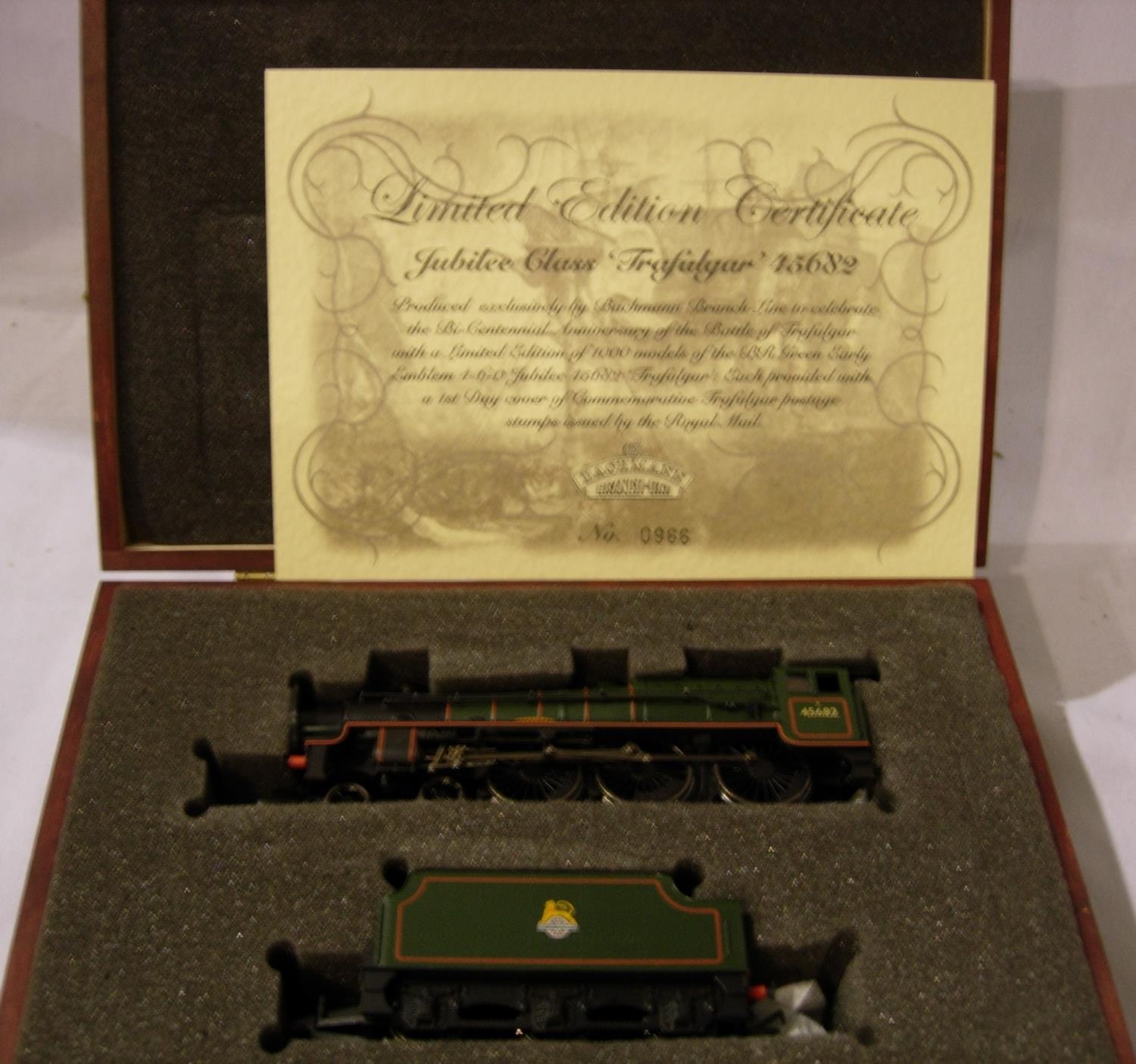 Bachmann Jubilee Class Trafalgar 45682, Green Early Crest, limited edition 966/1000. Complete with stamps, near mint condition in wooden presentation box and carton. P&P Group 1 (£14+VAT for the first lot and £1+VAT for subsequent lots)