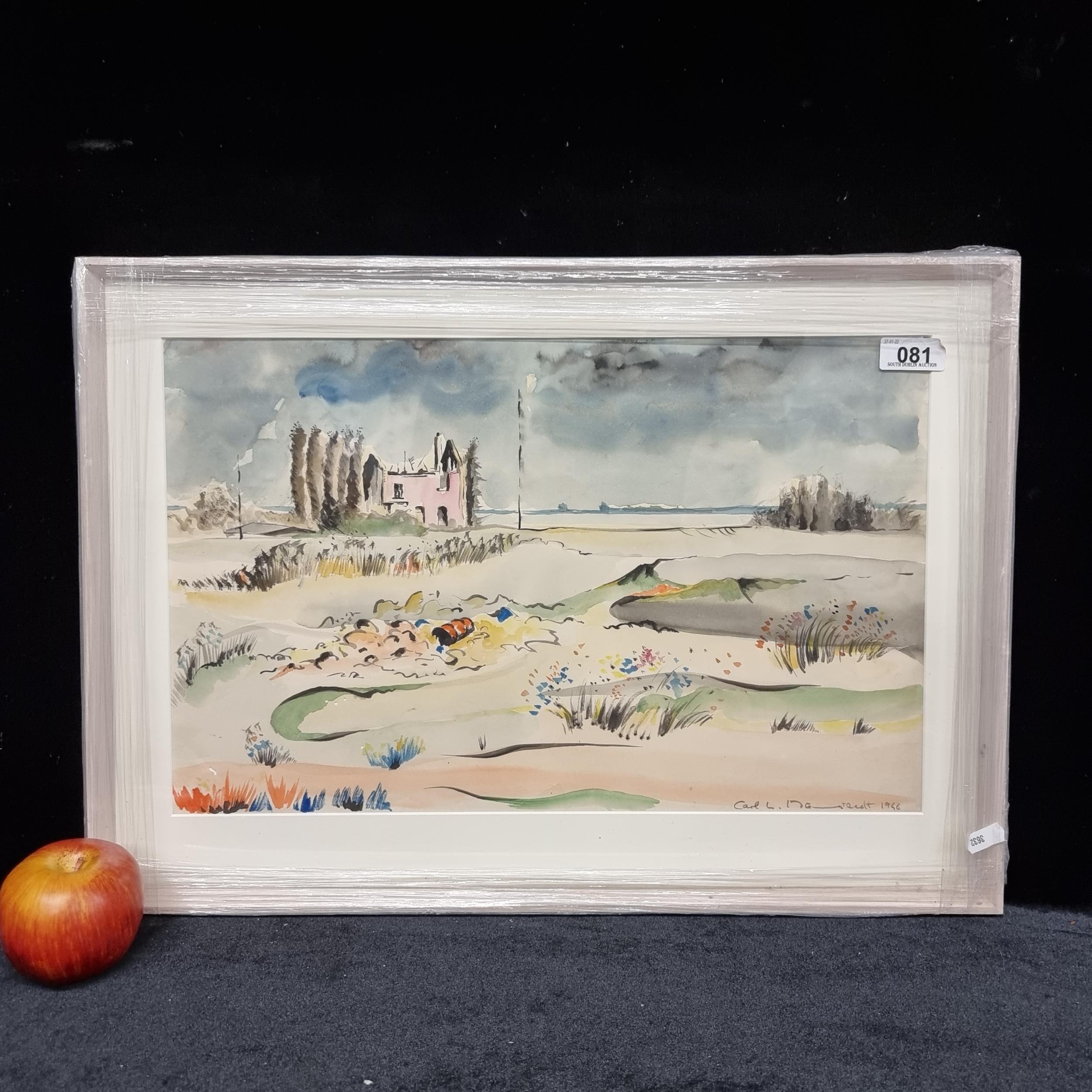 A good sized original watercolour on paper of a bright landscape with contrasting dark sky in a stylised and abstracted manner. Hand signed by artist bottom right and dated 1946. Housed in a clean white frame.