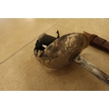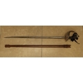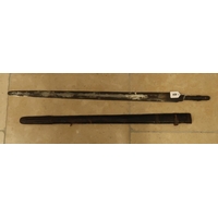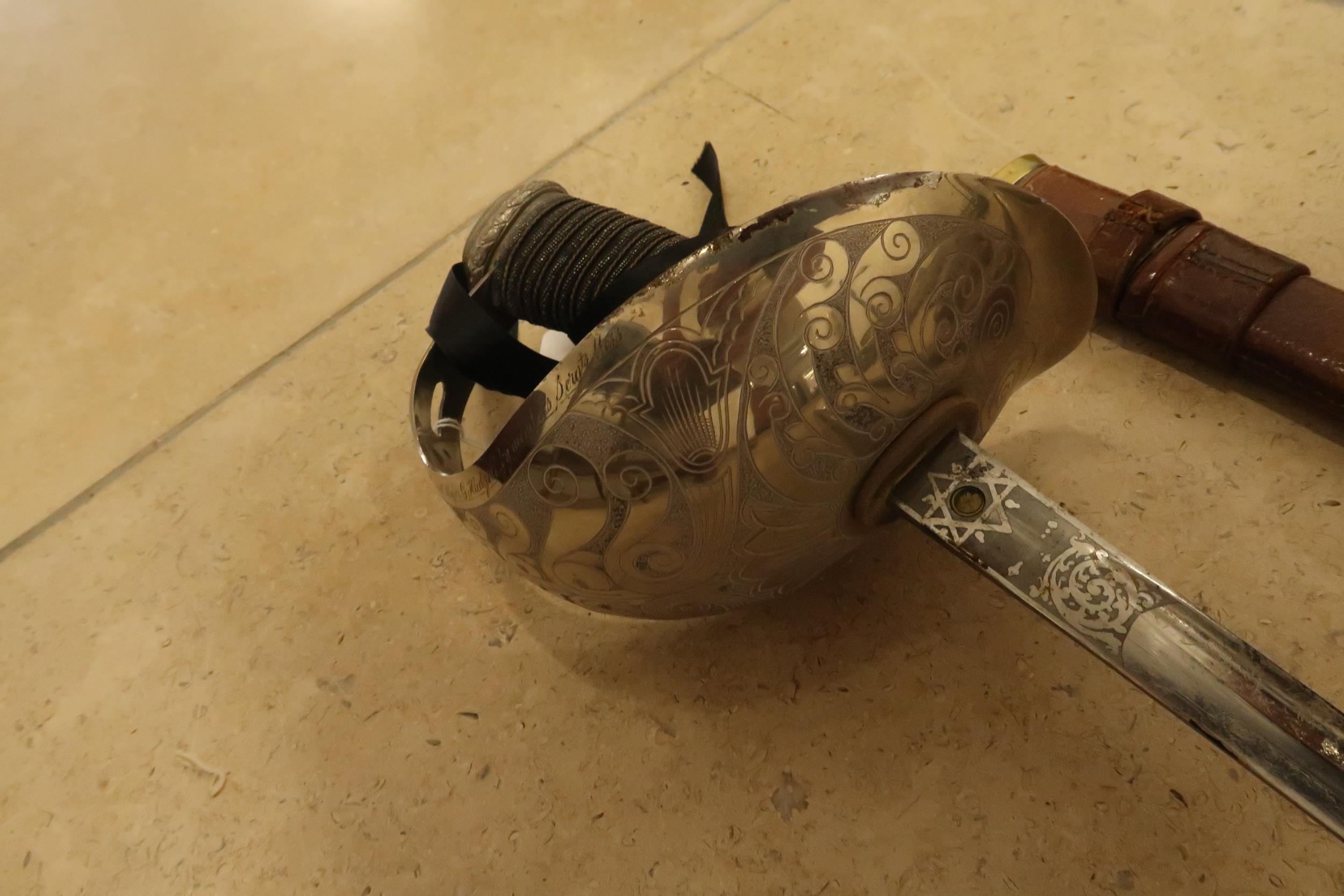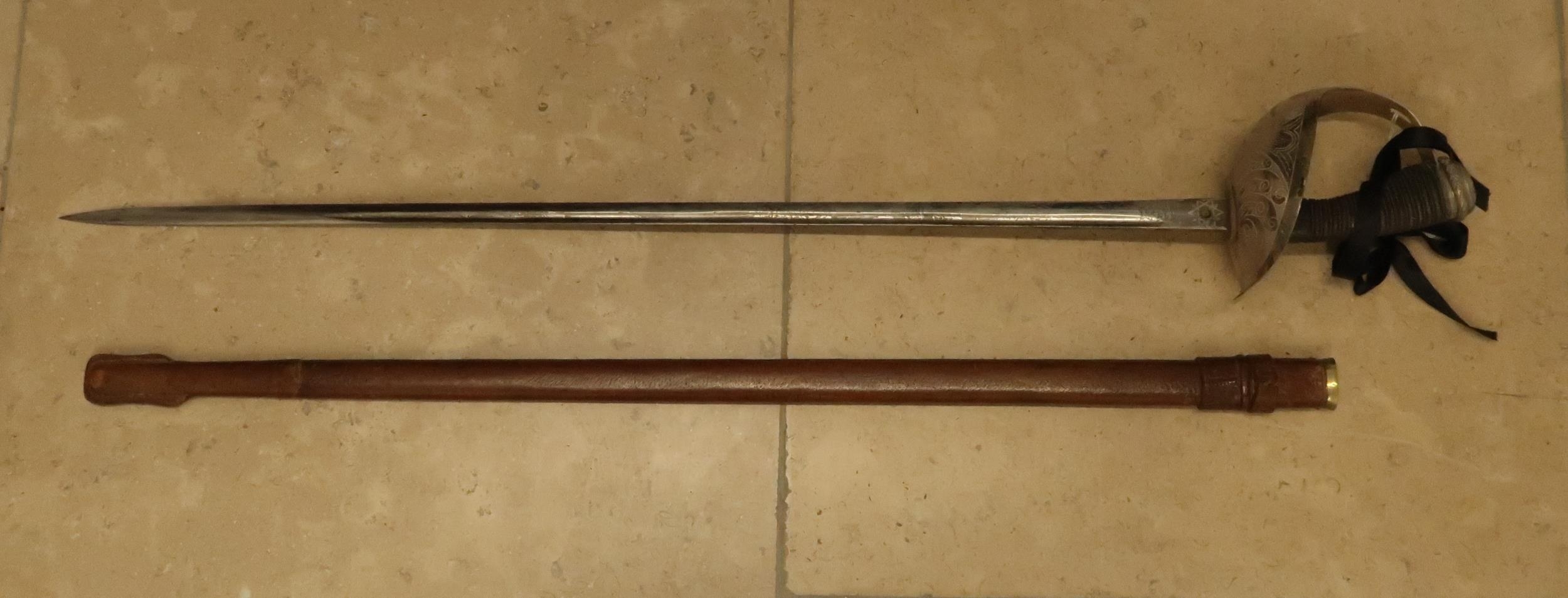 A WWI infantry 1897 pattern dress sword, for the Norfolk Yeomanry, inscribed to the grip 'Presented to Regtl Segt Major G Hudgell by Members Segts Mess On his Promotion to Commissioned Ranks. June 4th 1915. GR cypher under The Norfolk Yeomanry to top of guard above 1915, moulded decorative pommel, shagrin, wire bound grip, etched blade with GR cypher, marked C95J to the rib, and with leather scabbard, blade length 88cm, total length from blade tip to pommel 107cm, scabbard length 92cm.