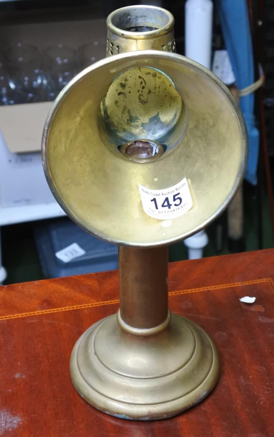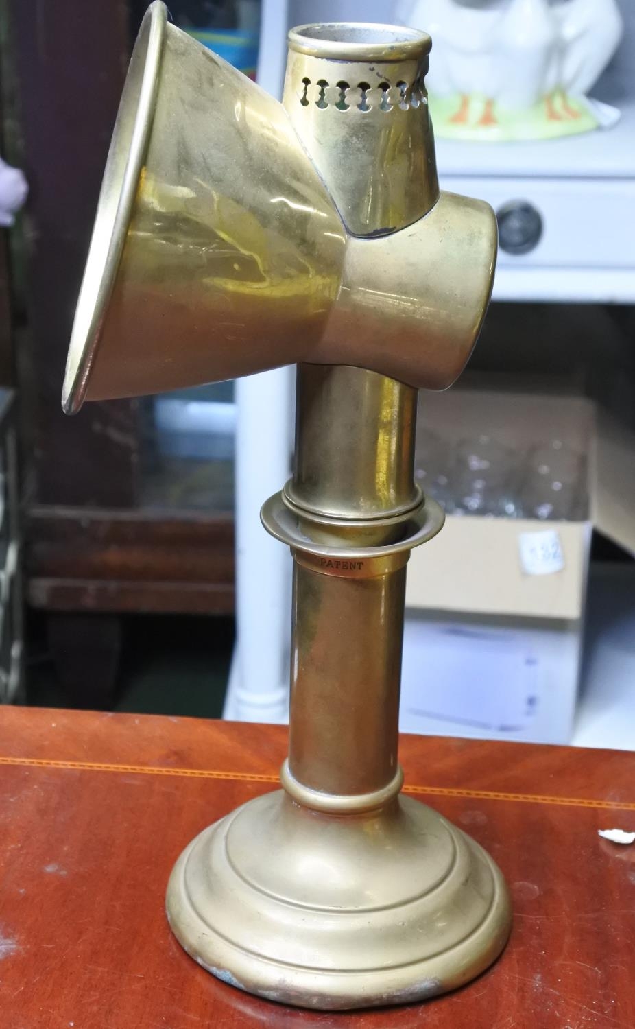 A vintage brass spotlight candle holder.