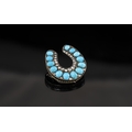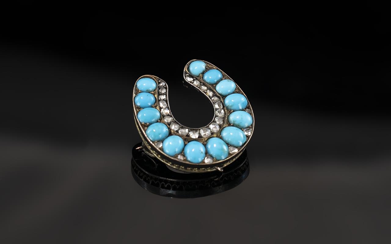 Victorian Period - Superb and Impressive 15ct Gold - Turquoise and Diamond Set Horseshoe Brooch. The Well Matched Turquoise Stones with Old Cut Diamond Spacers, Making a Lovely Antique Brooch. Set with Natural Turquoise Stones of Great Colour. 1 Inch - 2.5 cms High. Good Condition In All Aspects.