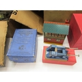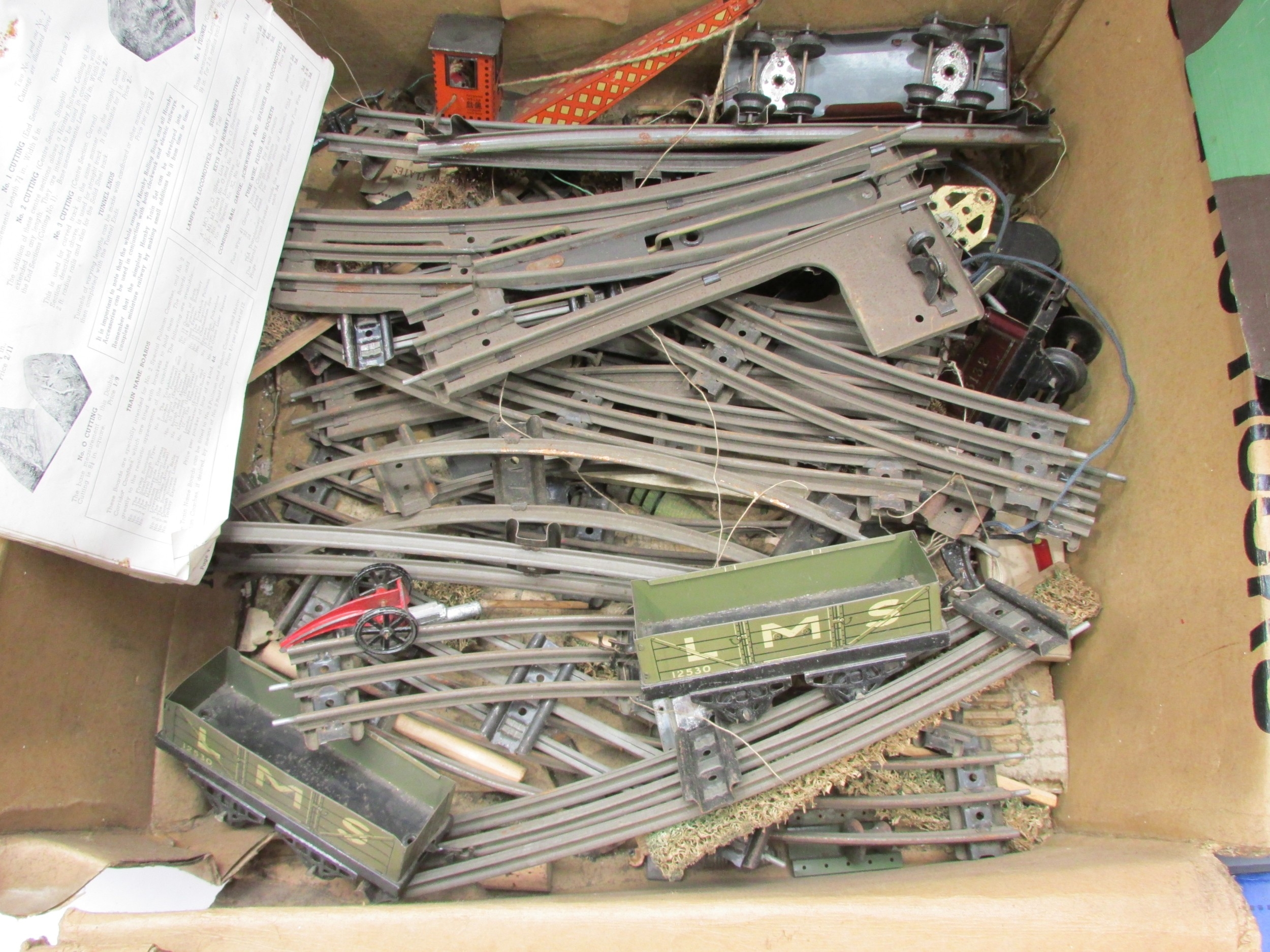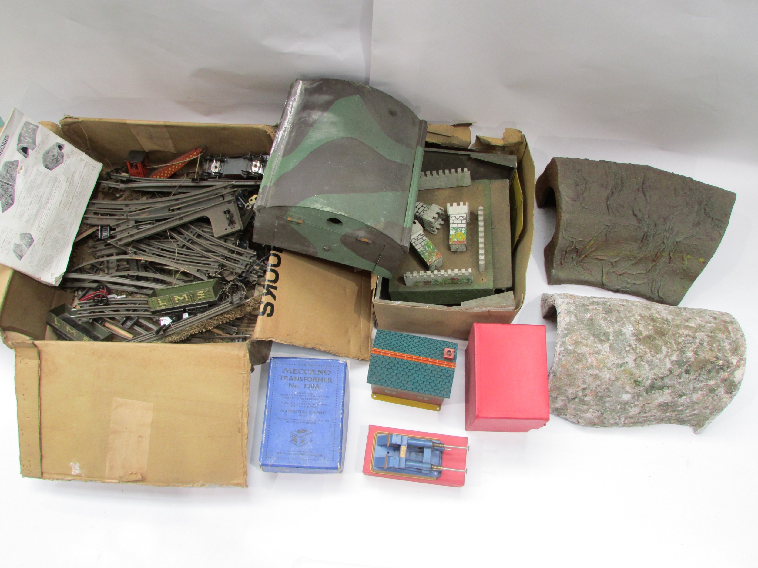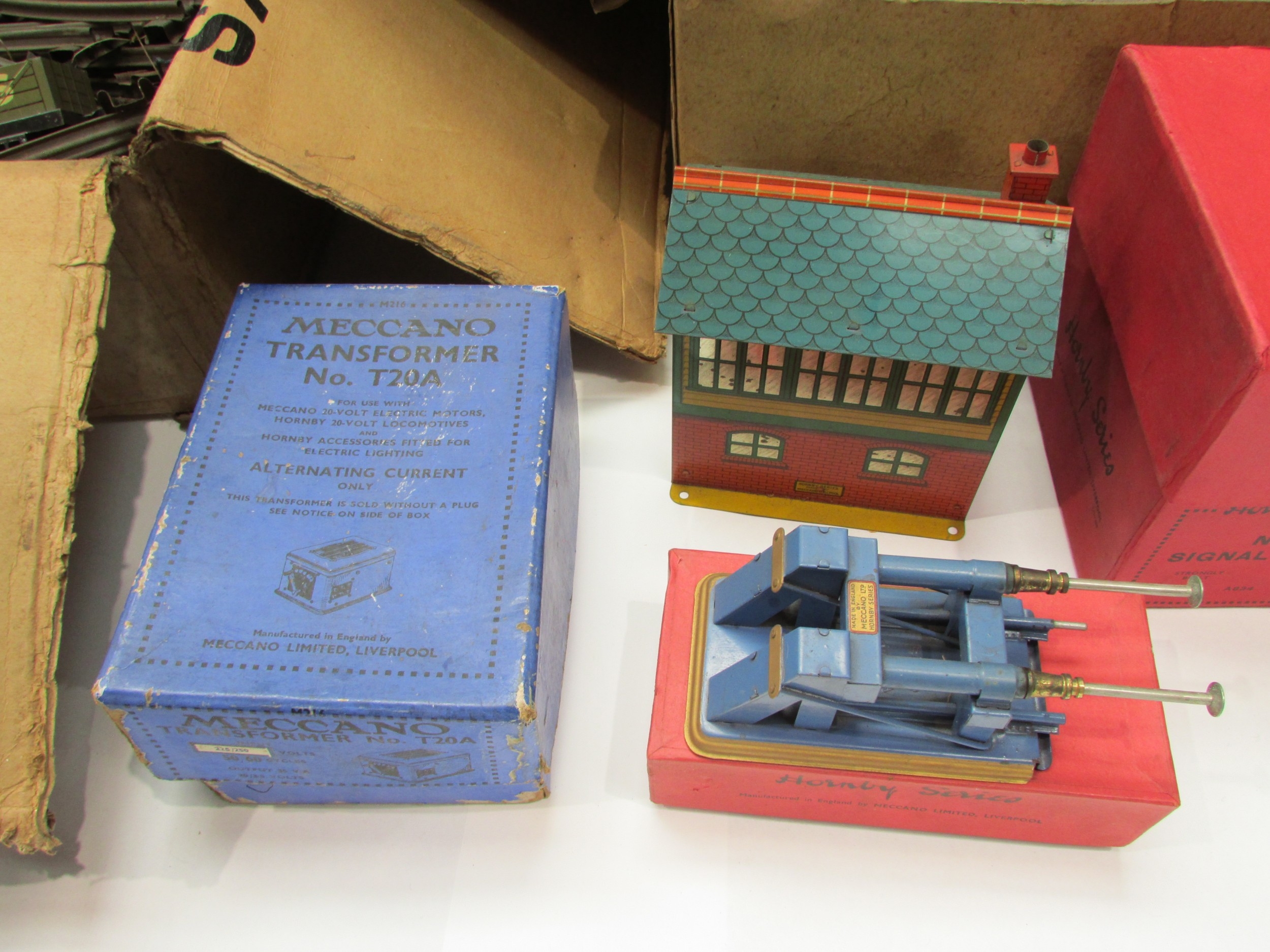 Collection of pre-war and later Hornby 0 gauge tinplate railway model items to include boxed No.2 Hydraulic Buffer Stop, boxed No.1 Signal Cabin, Meccano Transformer T20A, various track, rolling stock and wagons, and some tunnels