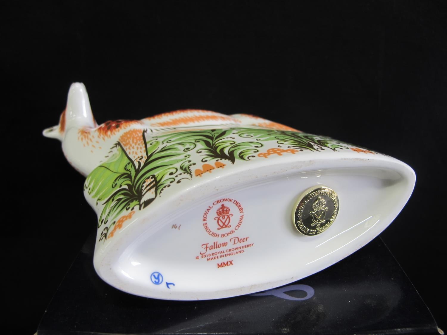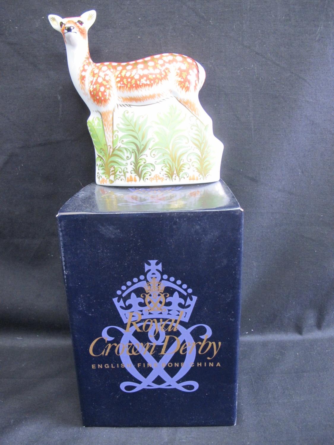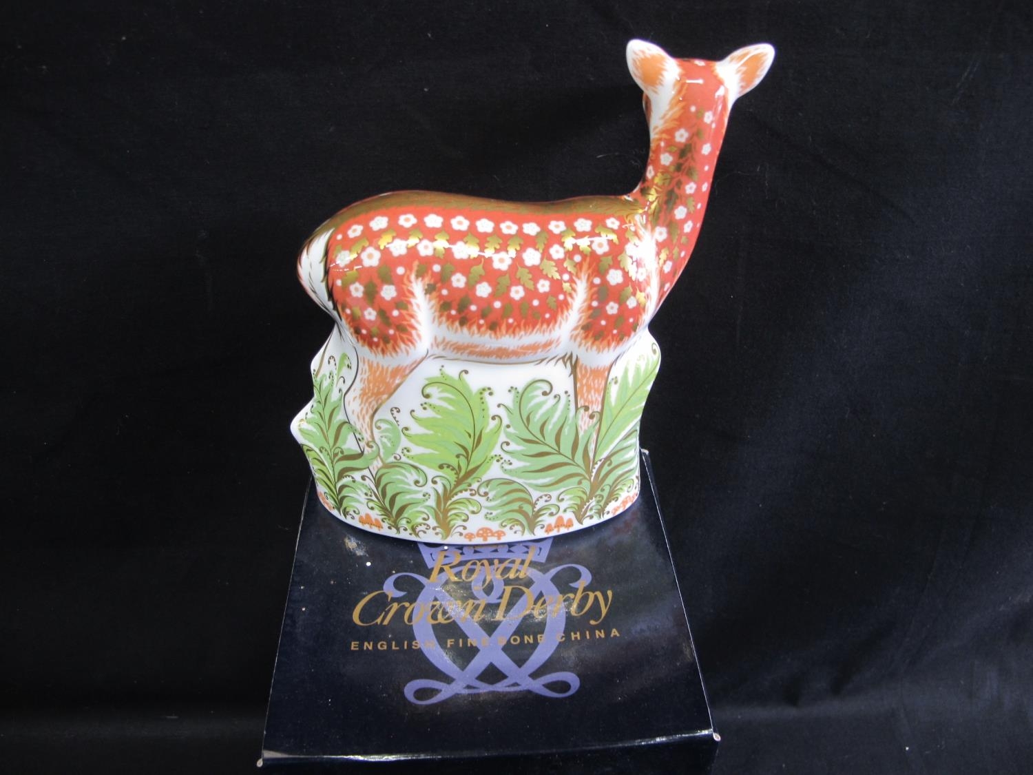 Royal Crown Derby paperweight of a Fallow Deer with gold stopper, complete with box - 15cm tall