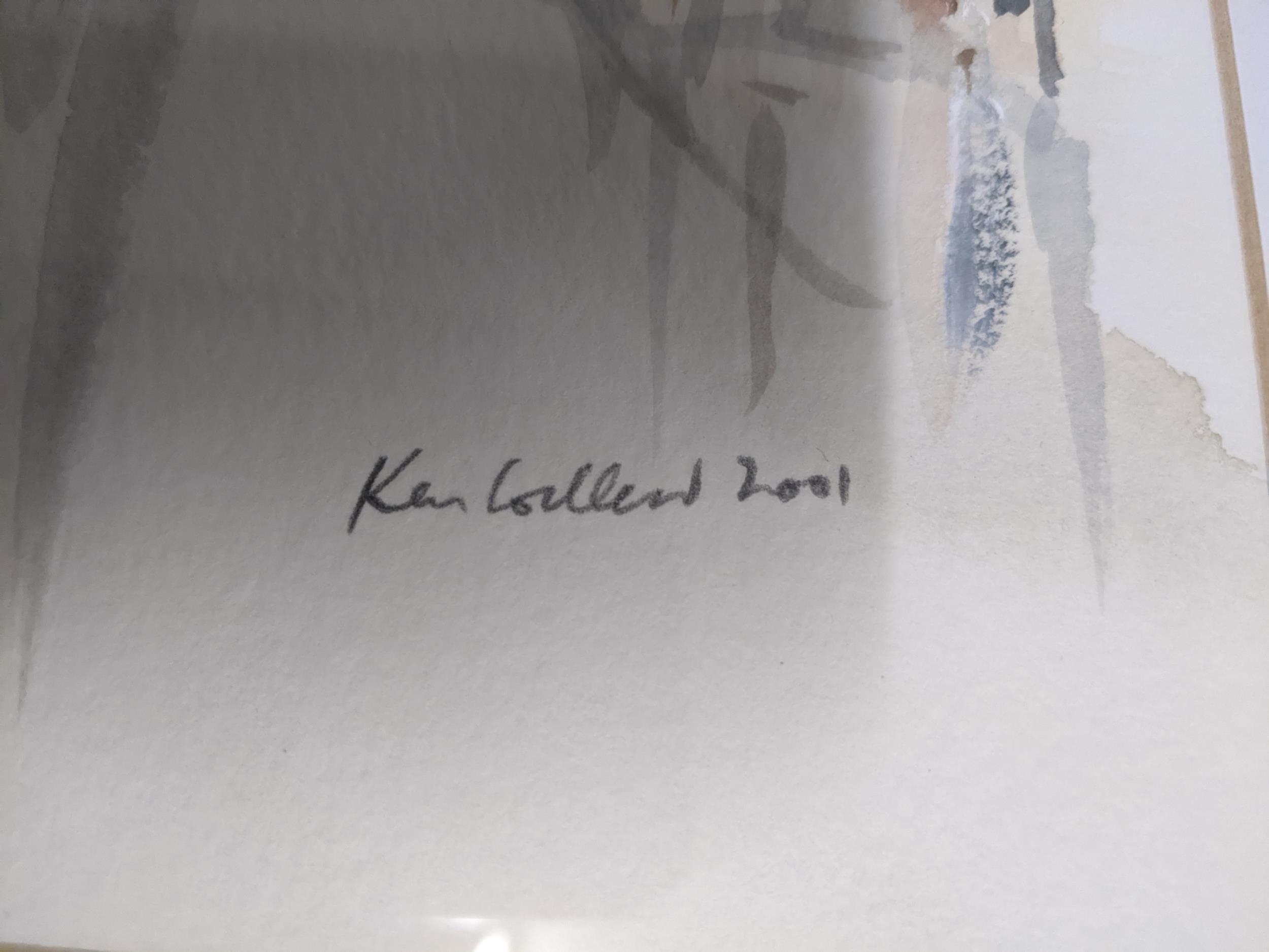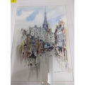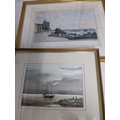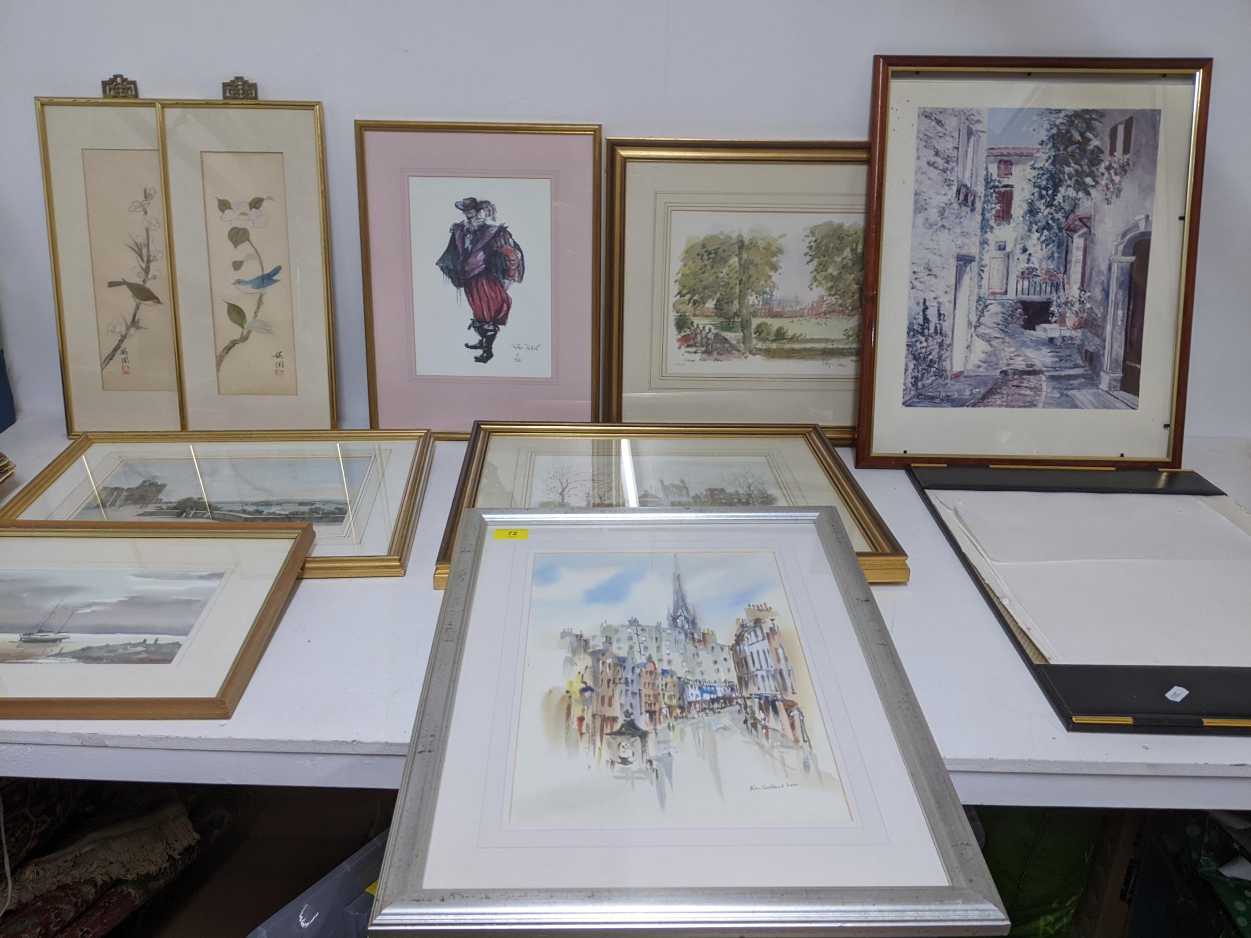 A selection of signed limited edition prints and watercolours to include Paul Stafford - The Curlew - a coastal marine watercolour, signed 6x23, mounted in a glazed frame; Ken **** (2001) - West Bow, Edinburgh, watercolour, signed and dated lower right corner, tilted to verso 37x26, Hugh Casson - fellows, bigot and college fields, Eton, two limited edition prints, signed and numbered 366/650 in pencil, glazed frames and others along with a Harrods black leather desk blotter (10)