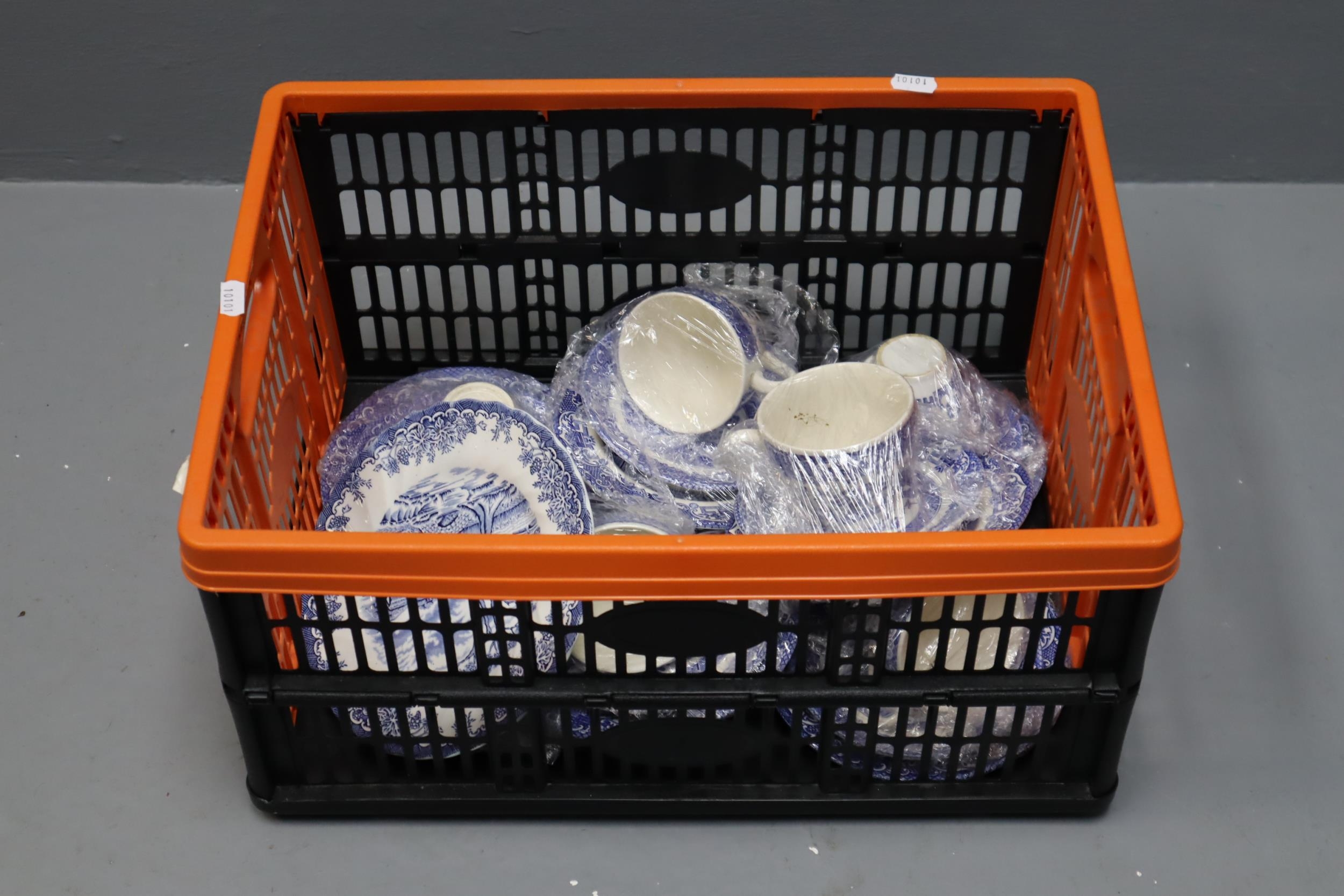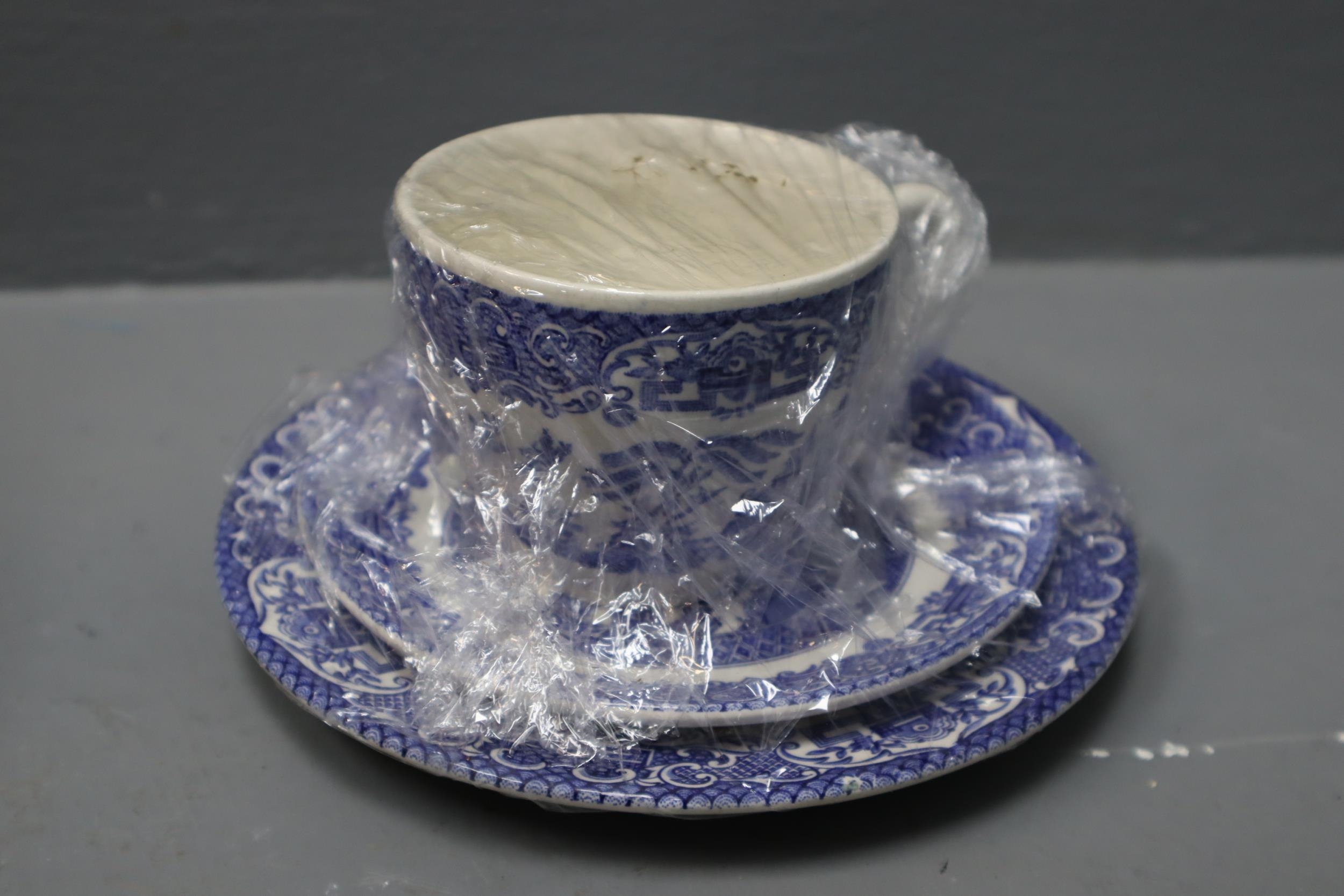 Selection of Blue and White Pottery includes Myott. 6 Trios and Various Plates.