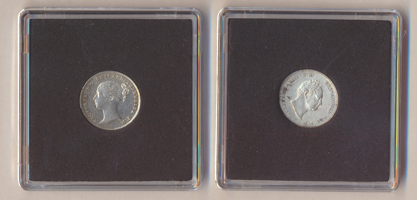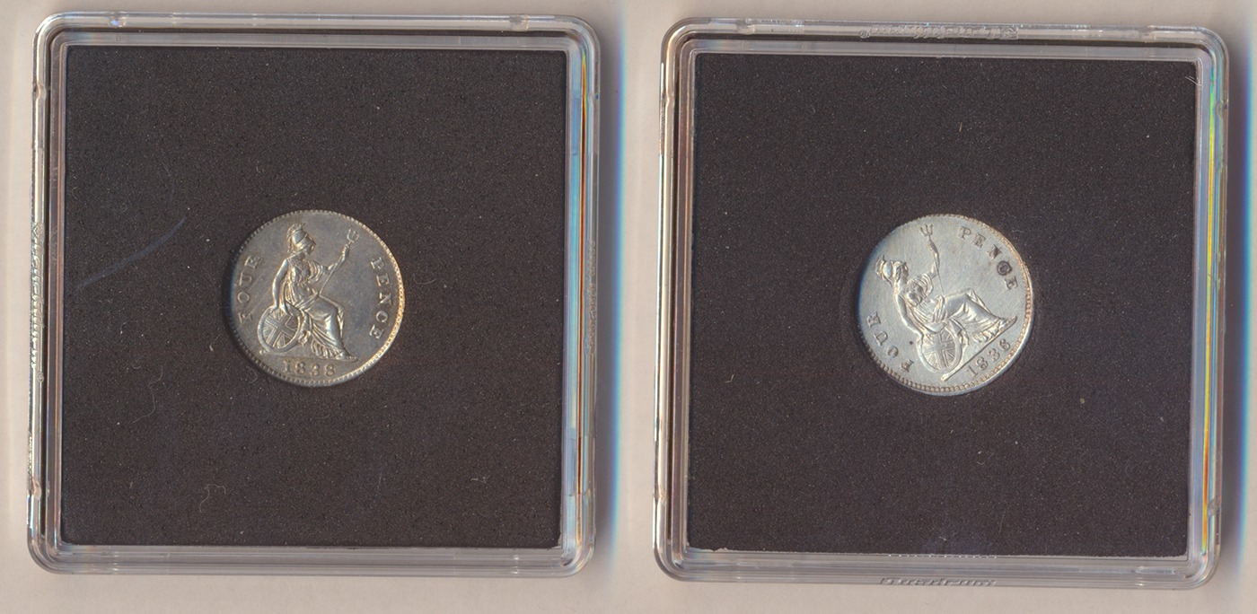 Range of Britannia groats with 1854 in CGSUK plastic holder graded AU78, 1836, 1838/8 on side, 1888 uncirculated and 1837 extremely fine. Qty 5 (R)