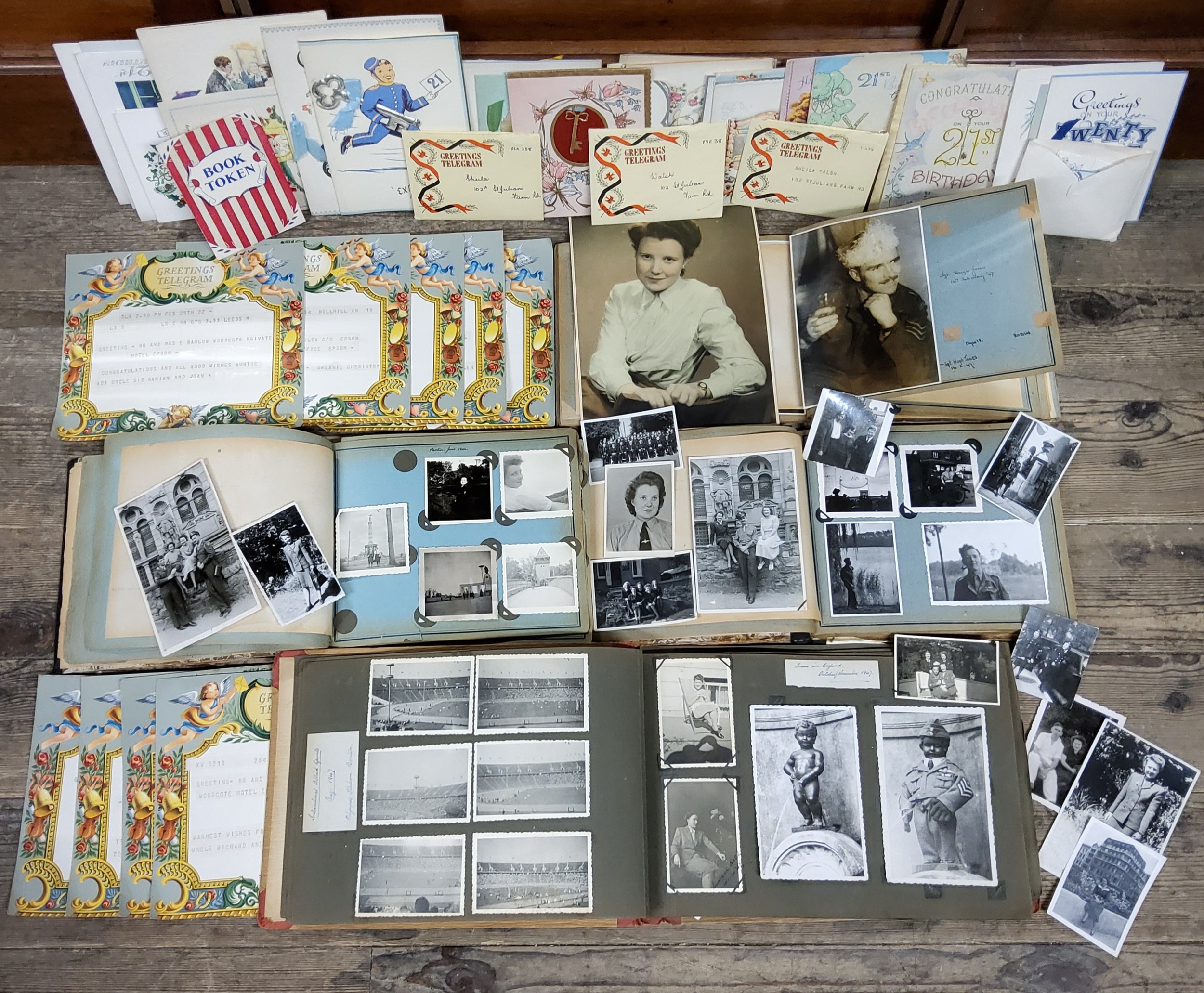 An interesting archive contained in three photograph albums showing the life of British stationed in Berlin, Brussels, Mulheim in 1946 -1949; a pair of humerous before & after postcards of a urinating putti the other clothed in a RAF uniform; Berlin Olympic Games, etc.
