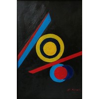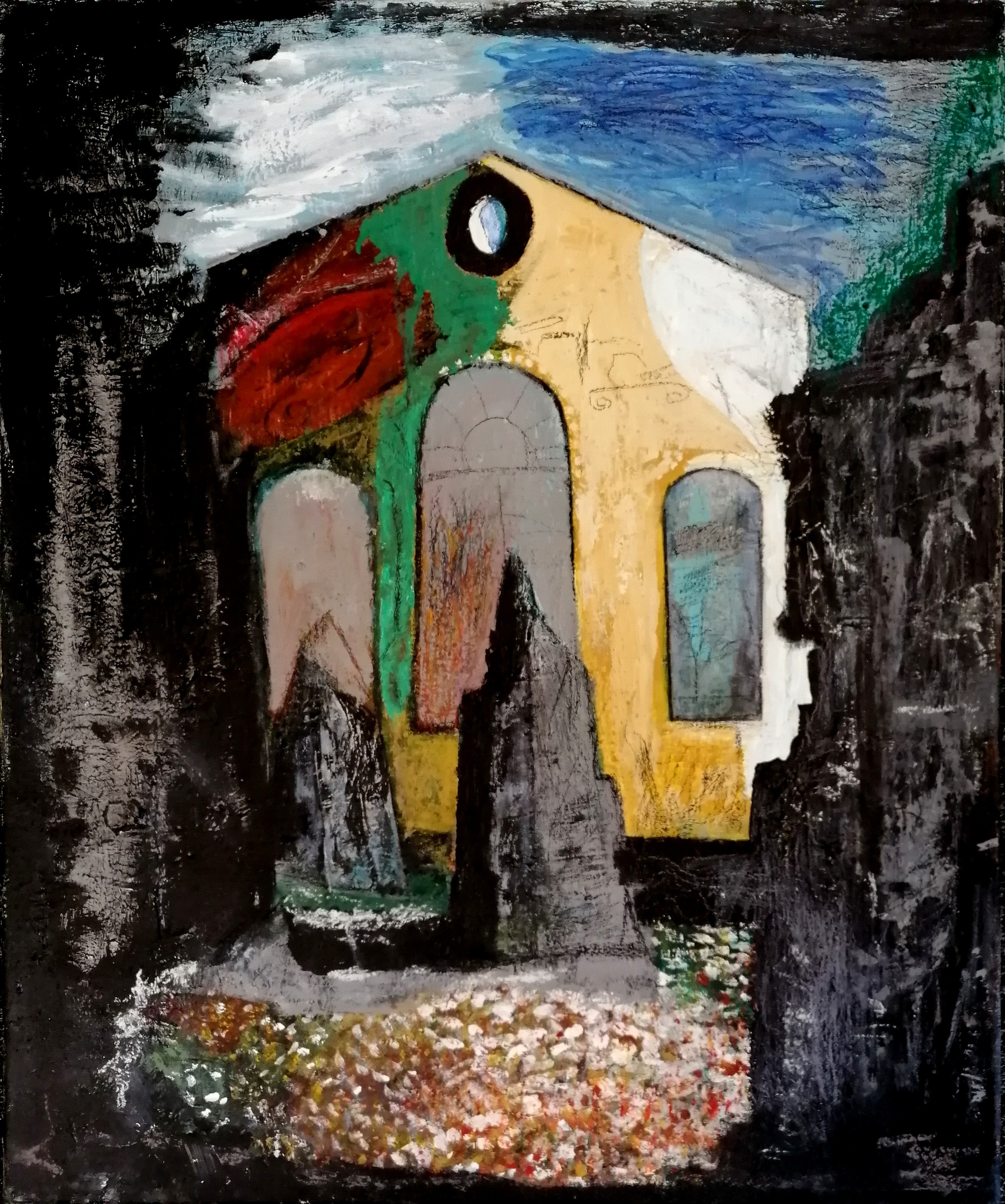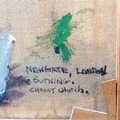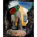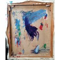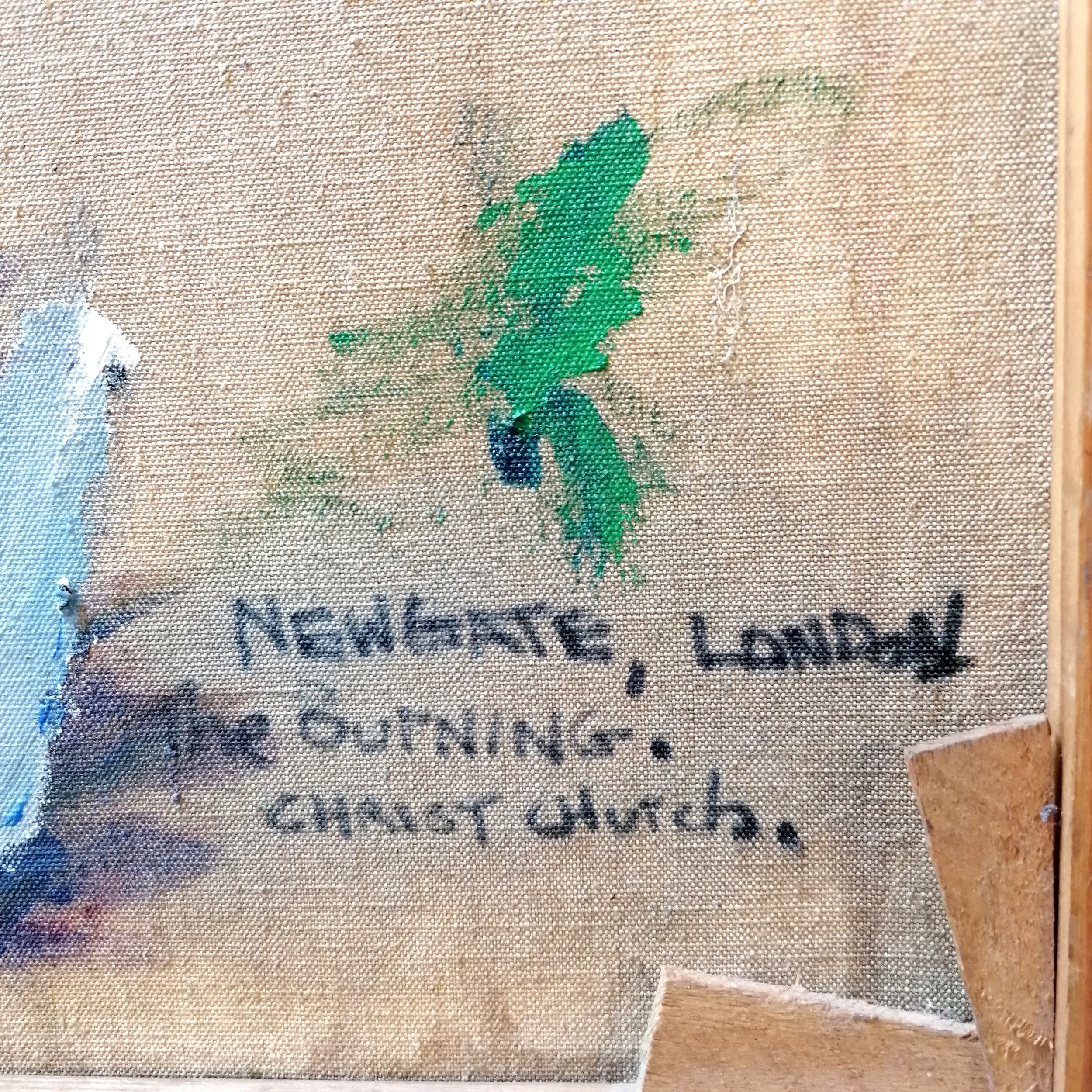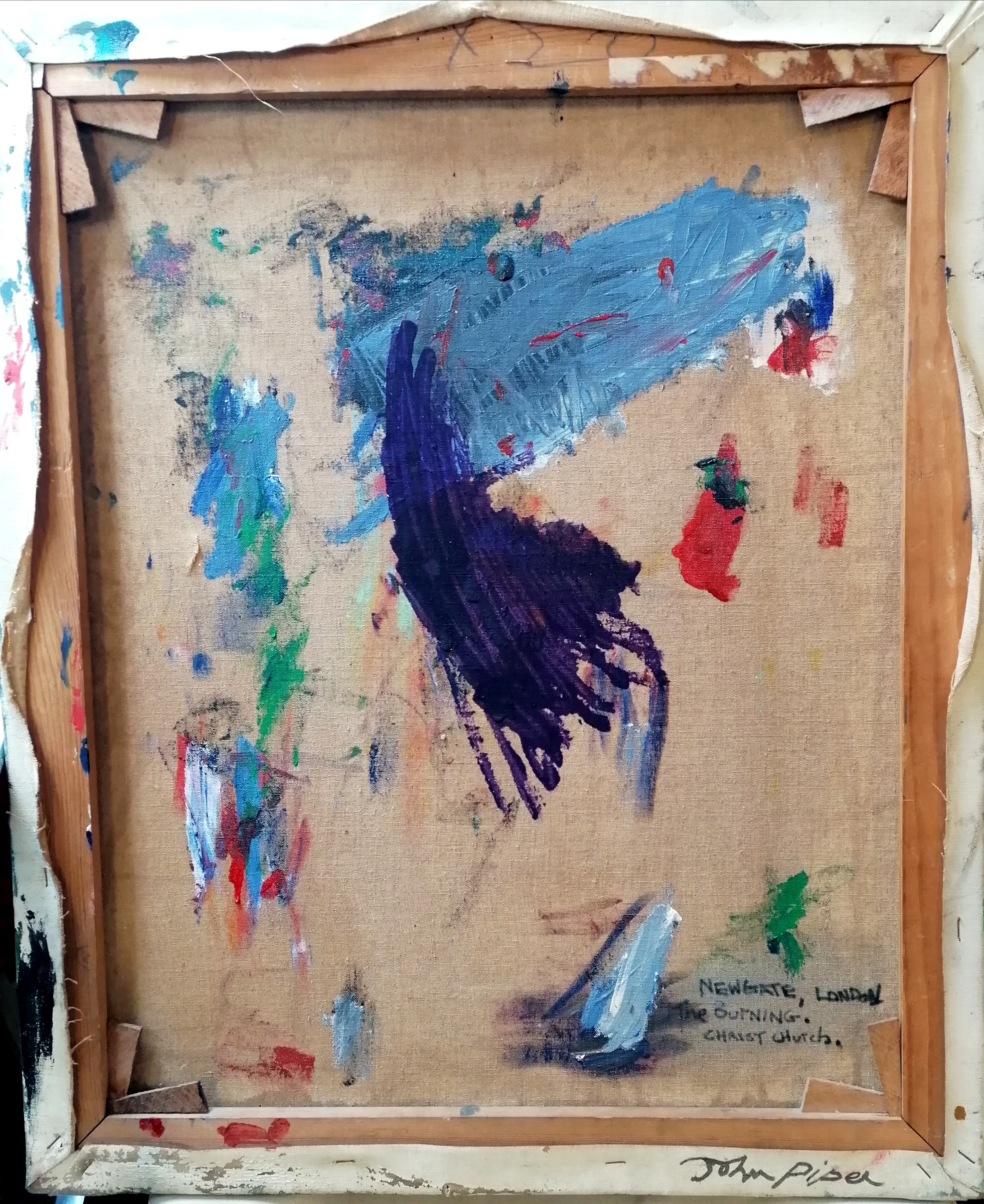 After John Piper oil painting on canvas with annotation to reverse Newgate, London The Burning Christ Church 61cm x 51cm