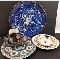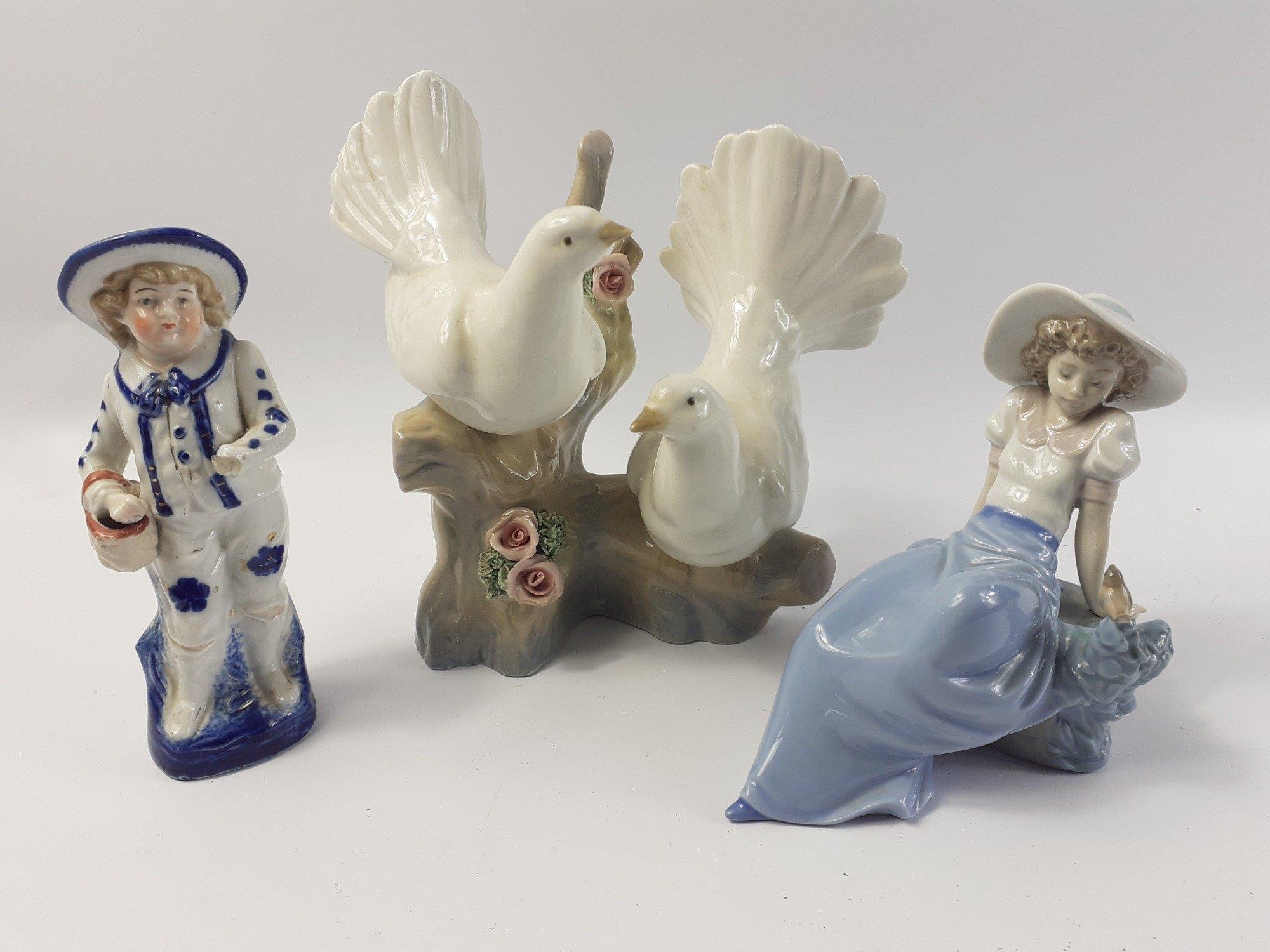 A mixed decorative ceramics lot to include a really lovely NAO lady sitting with a bird, NB the bird has a small damage to tail. A PORCEVAL Spanish dove pair on a branch ornament and an older porcelain blue and white boy figure with damage to hand.