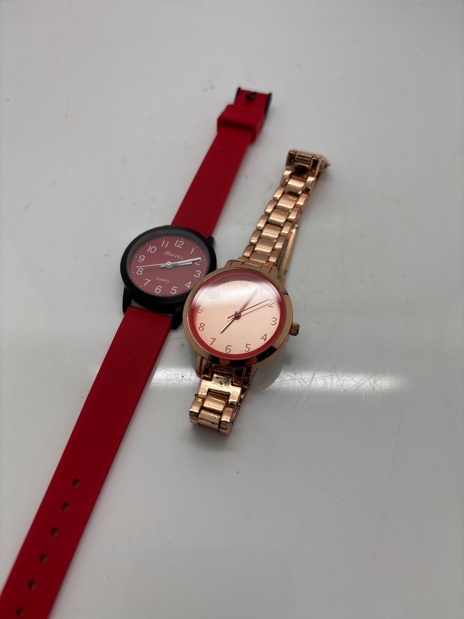 Two wristwatches, one with a red strap and one rose gold.