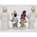 Pair of continental porcelain Meissen-style figures, circa 1900, each modelled carrying baskets of flowers on scroll moulded gilt bases and a pair of continental porcelain nodding clown figures, iron red numerals