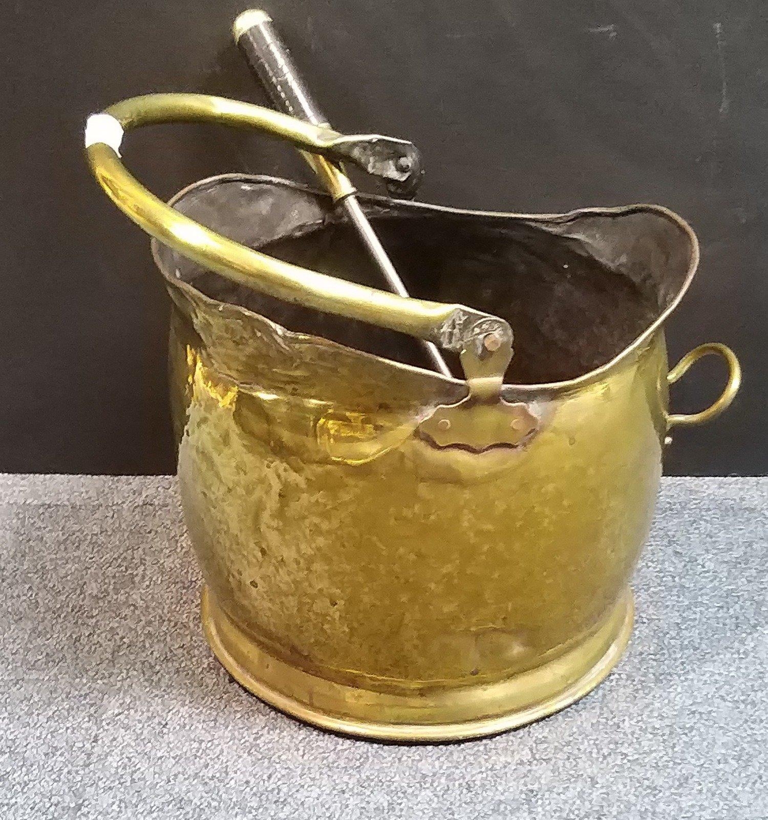 Nice brass coal scuttle with poker. Practical and decorative.