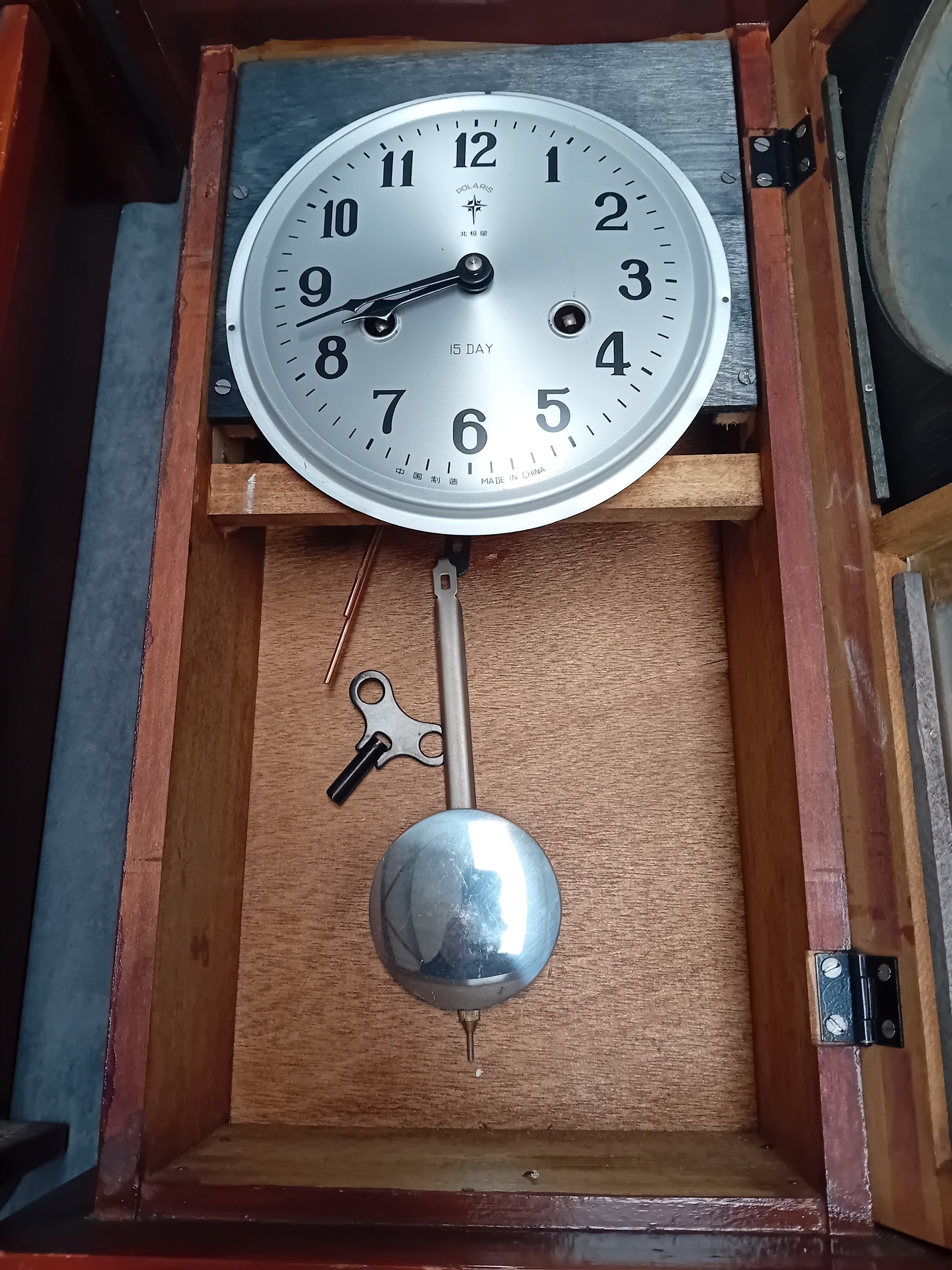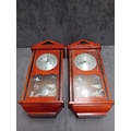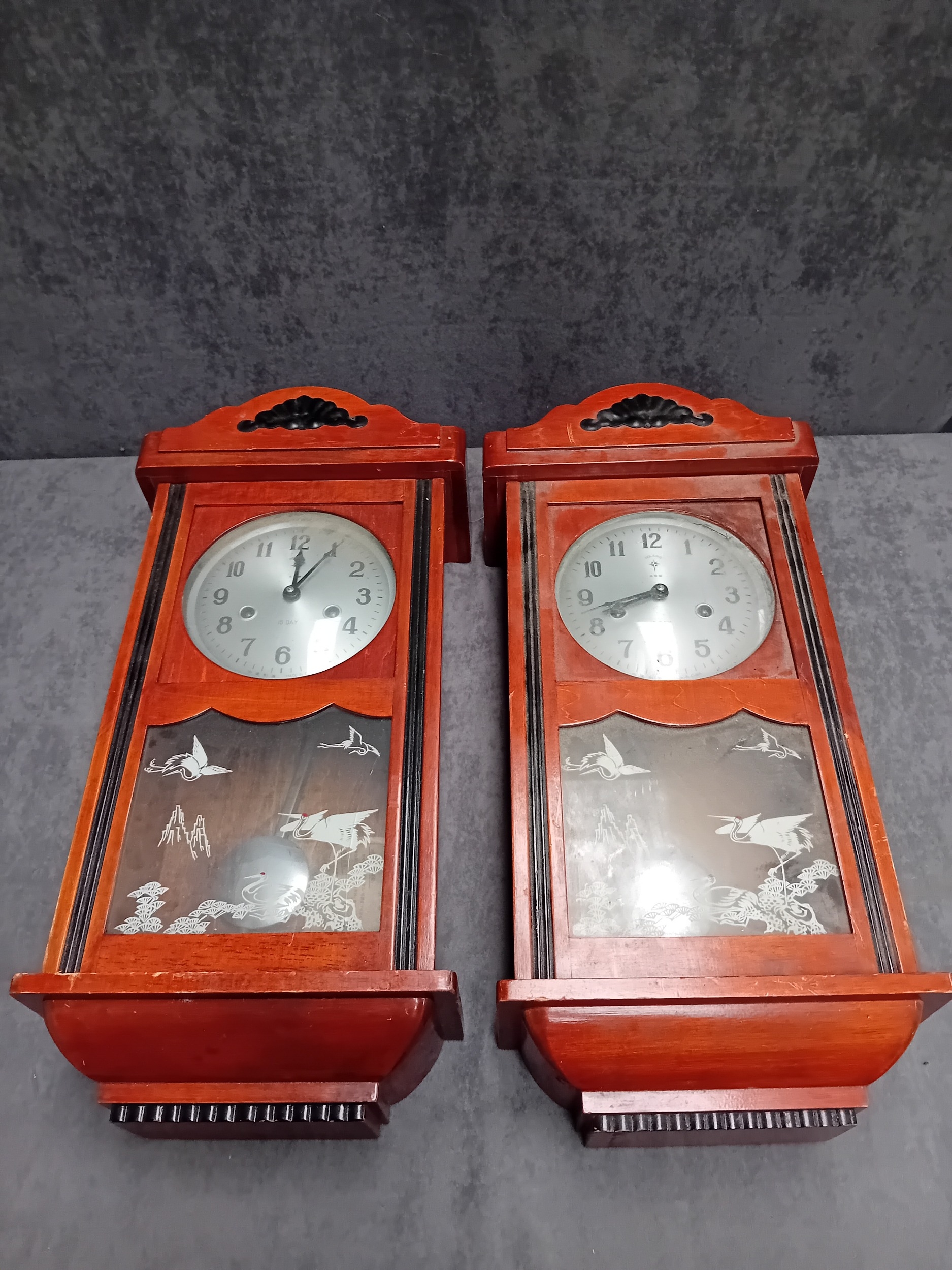 A Matching pair of wall clock - Polaris Branding with oriental theme. one has minor glass damage as pictured. comes with winding key